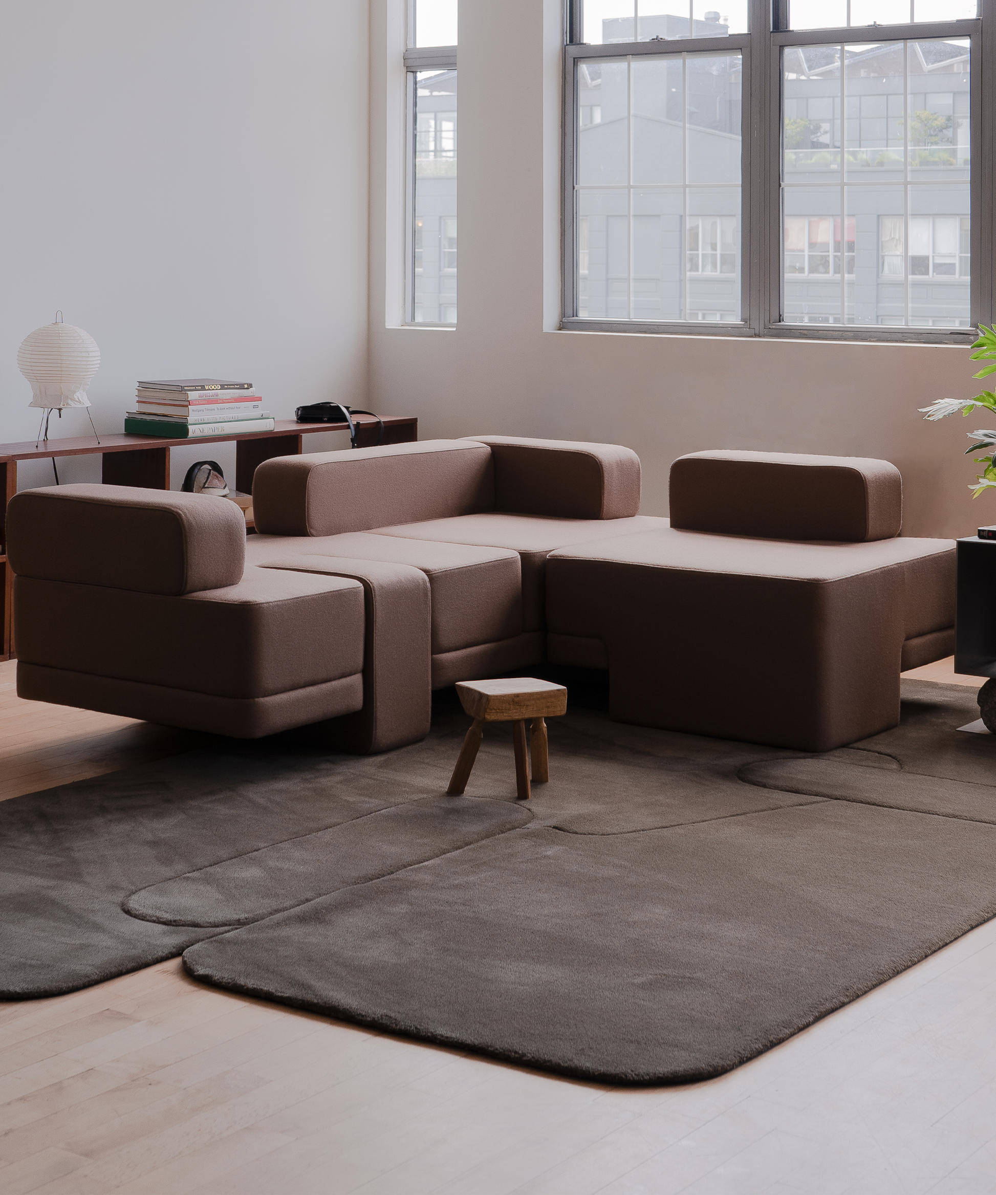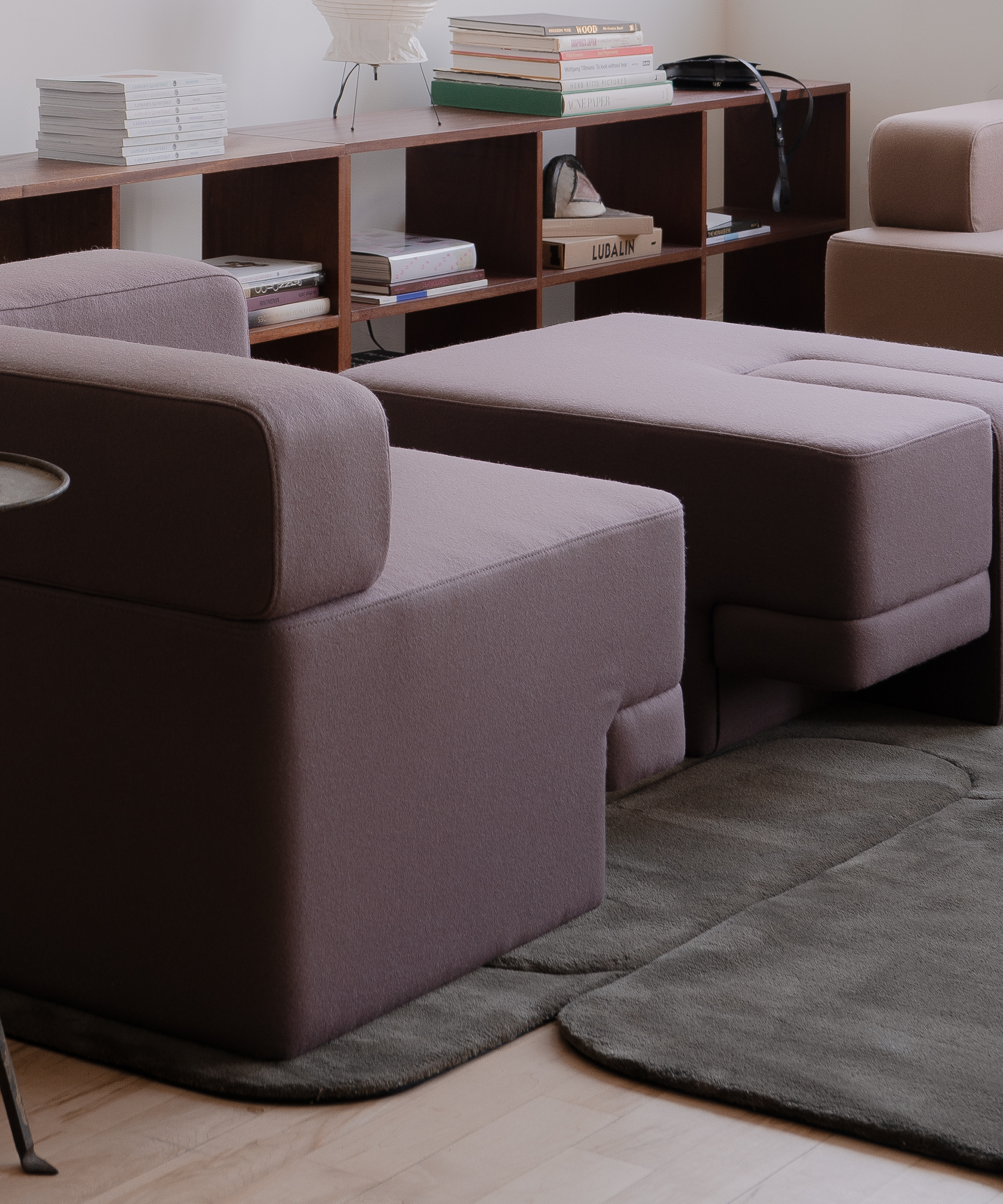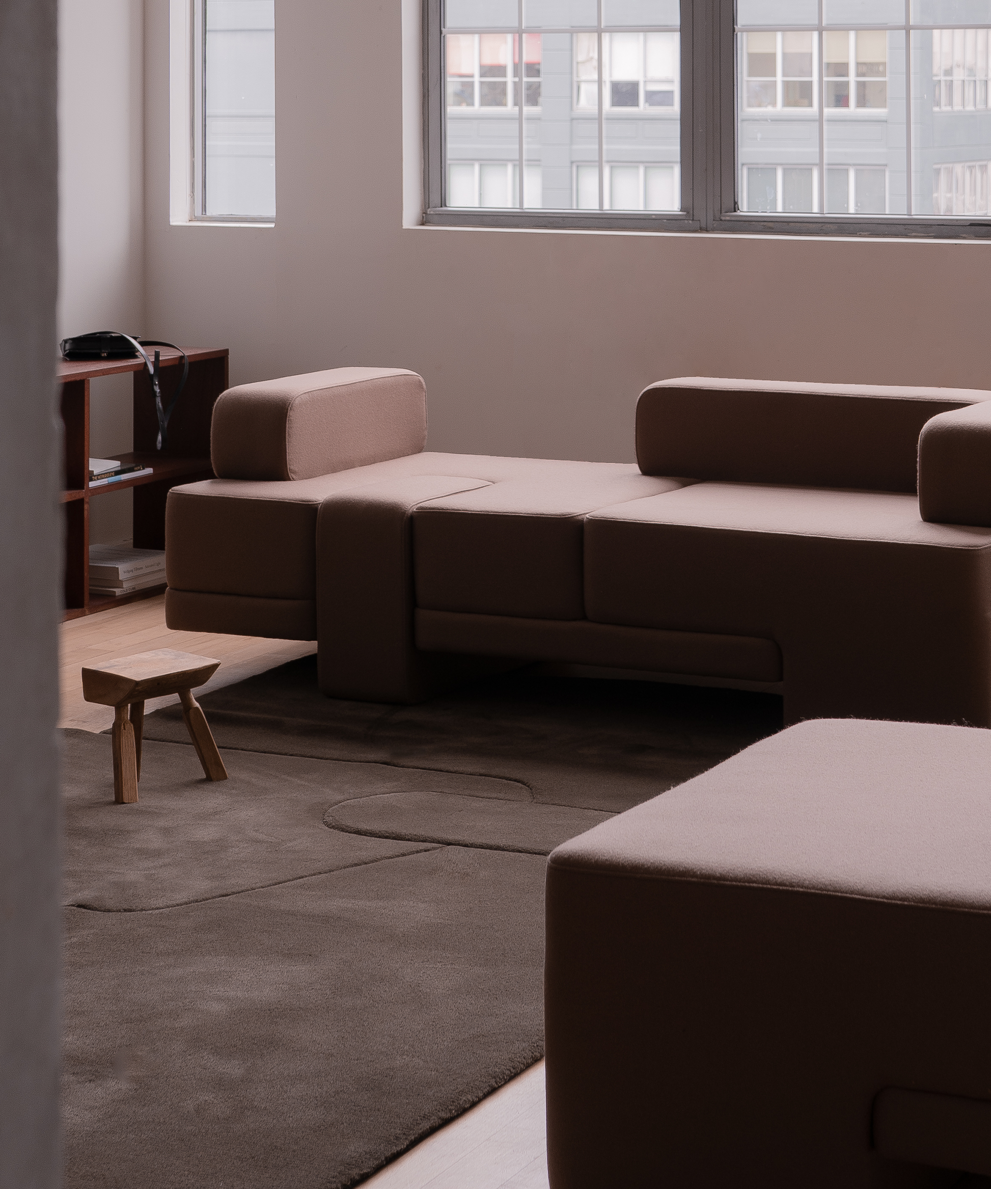 The Sarsen Series, designed by MKCA for TRNK Collection, embraces the dynamic interplay of objects, while emphasizing articulation and open-endedness. Drawing inspiration from joinery, the seating’s asymmetrical distribution of heft and lift ensures visual continuity throughout limitless configurations. The irregular shapes of the rugs reinforce the multidirectional nature of the collection, intending to ground a space without giving it hard boundaries. The Sarsen Series highlights the transformative power of elements in shaping function, habitation, and interaction.