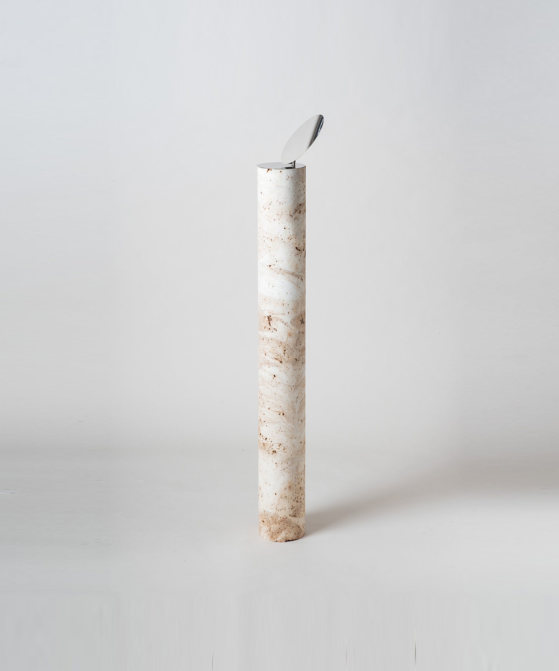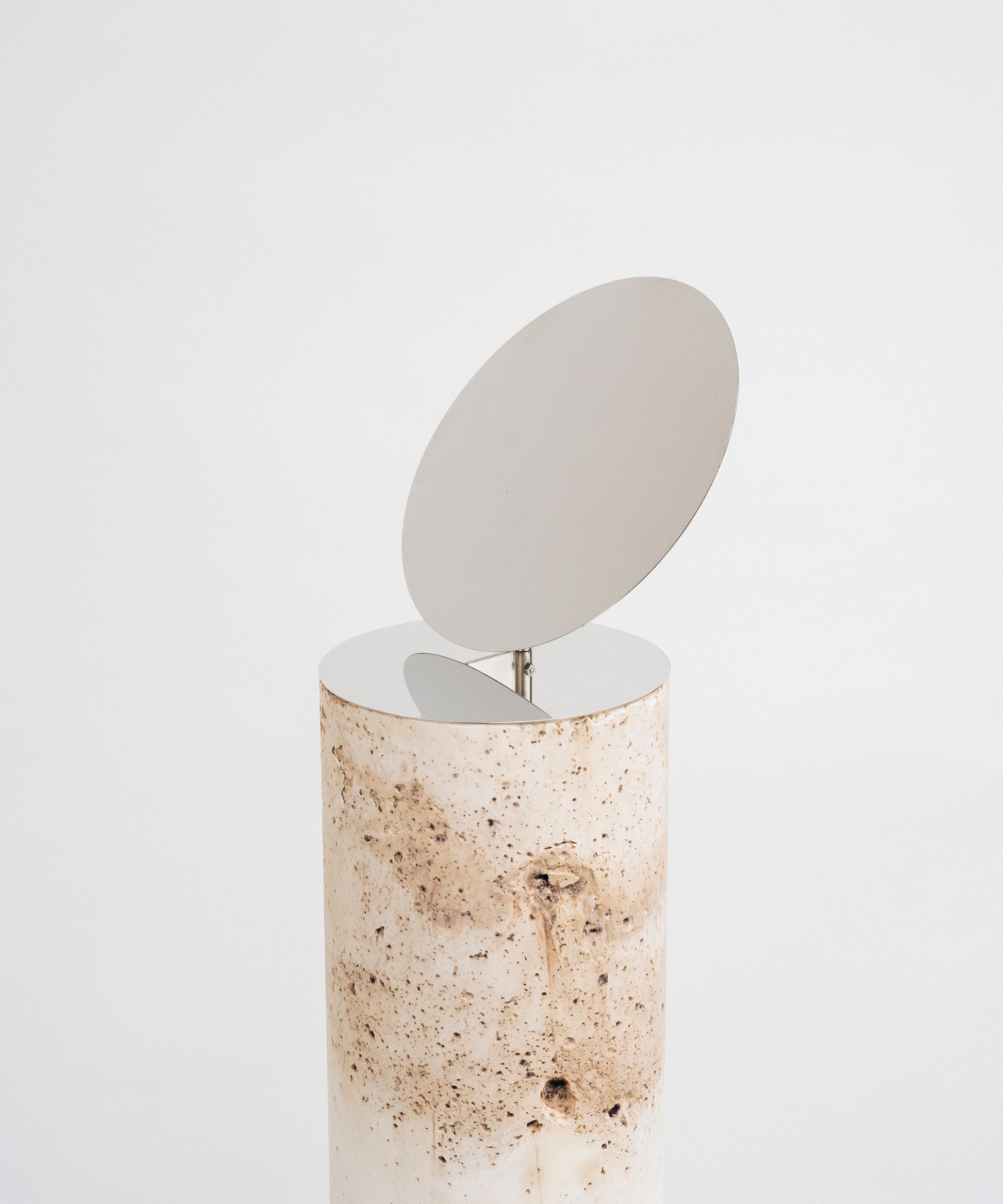Satellite is inspired by “betilos” and dolmen. Together with Jupiter, they form a spatial configuration that sends us to the megalithic monuments of ancient times. The spheres and the columns are made of the stone cast: from applying an organic reaction to alpha calcium the process of material curing is irregular and unpredictable. After cleaning and sanding, the resulting pieces are always unique and different from each other.