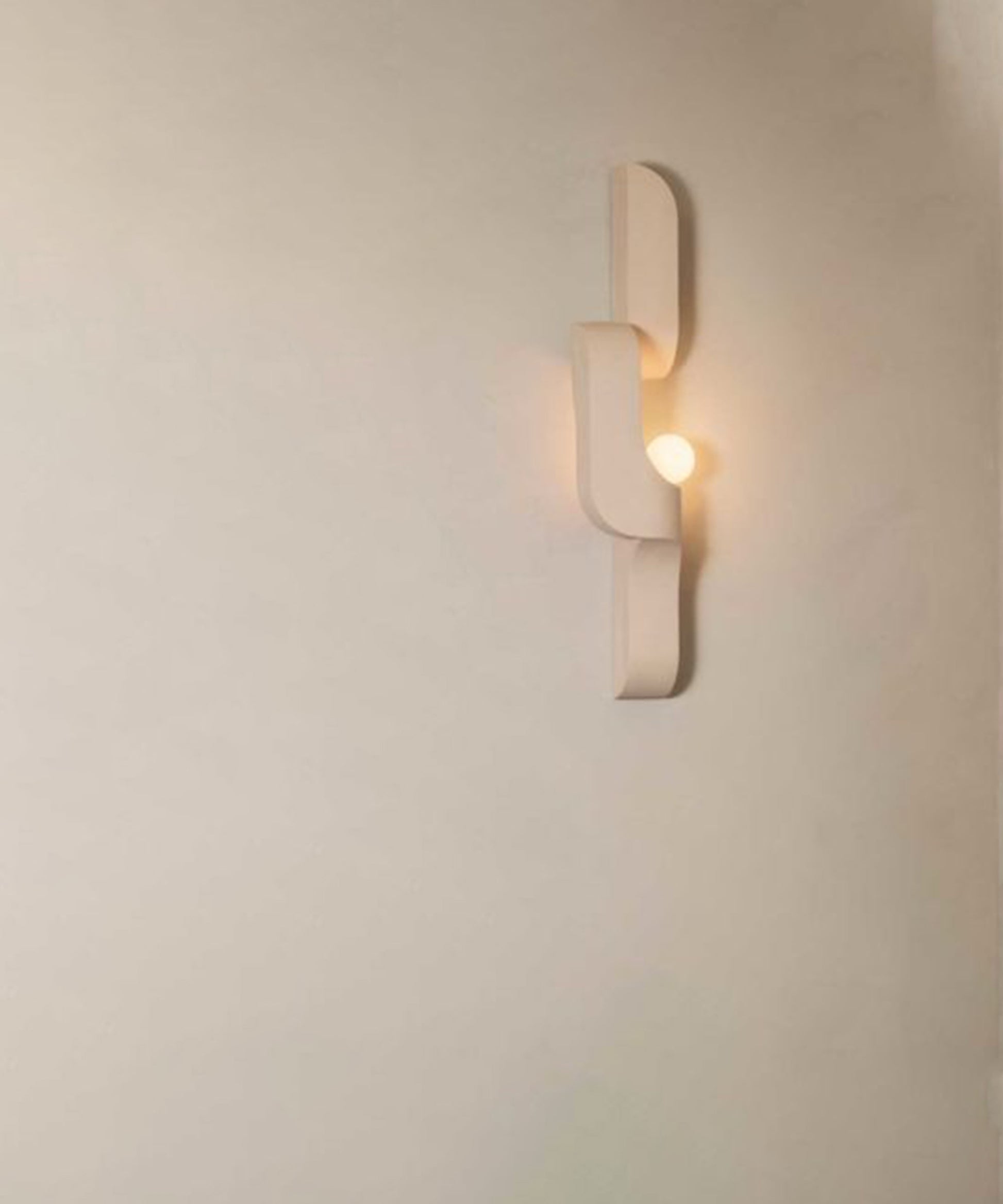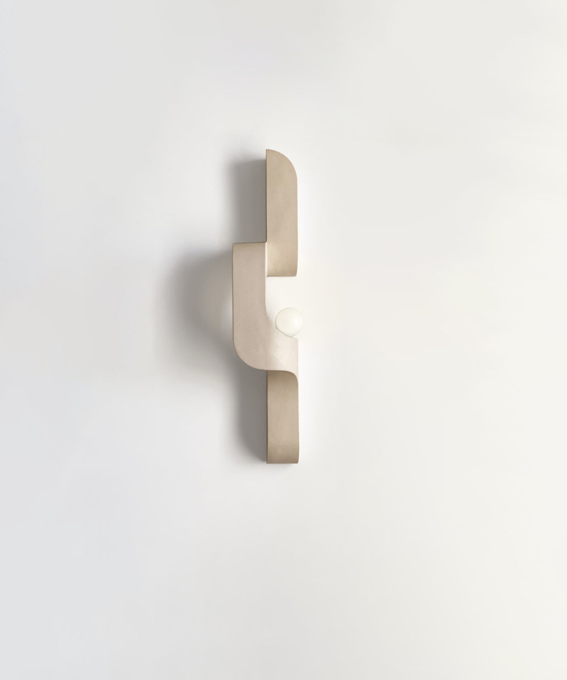 The sconce snakes up and off the wall, a sculptural lighting piece that’s understated, and artifact-like.