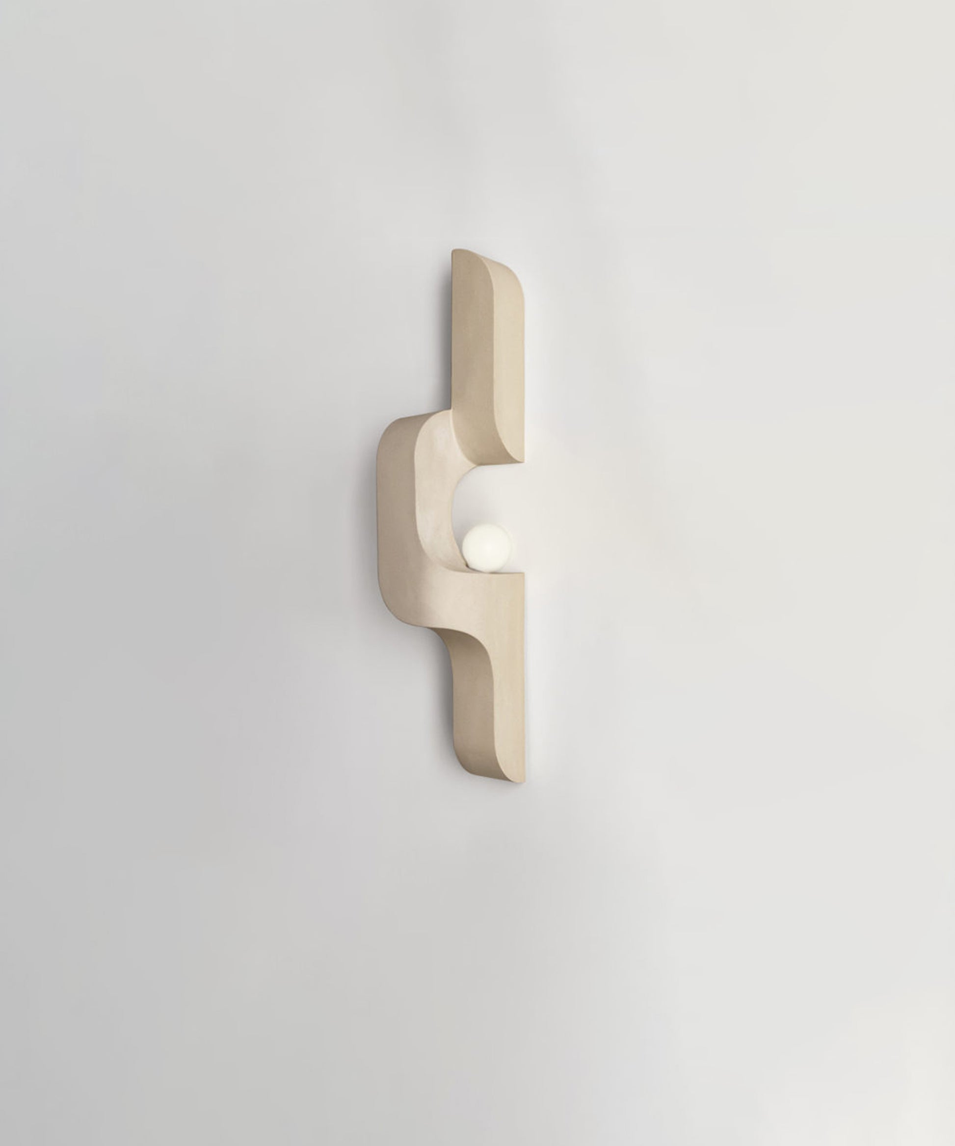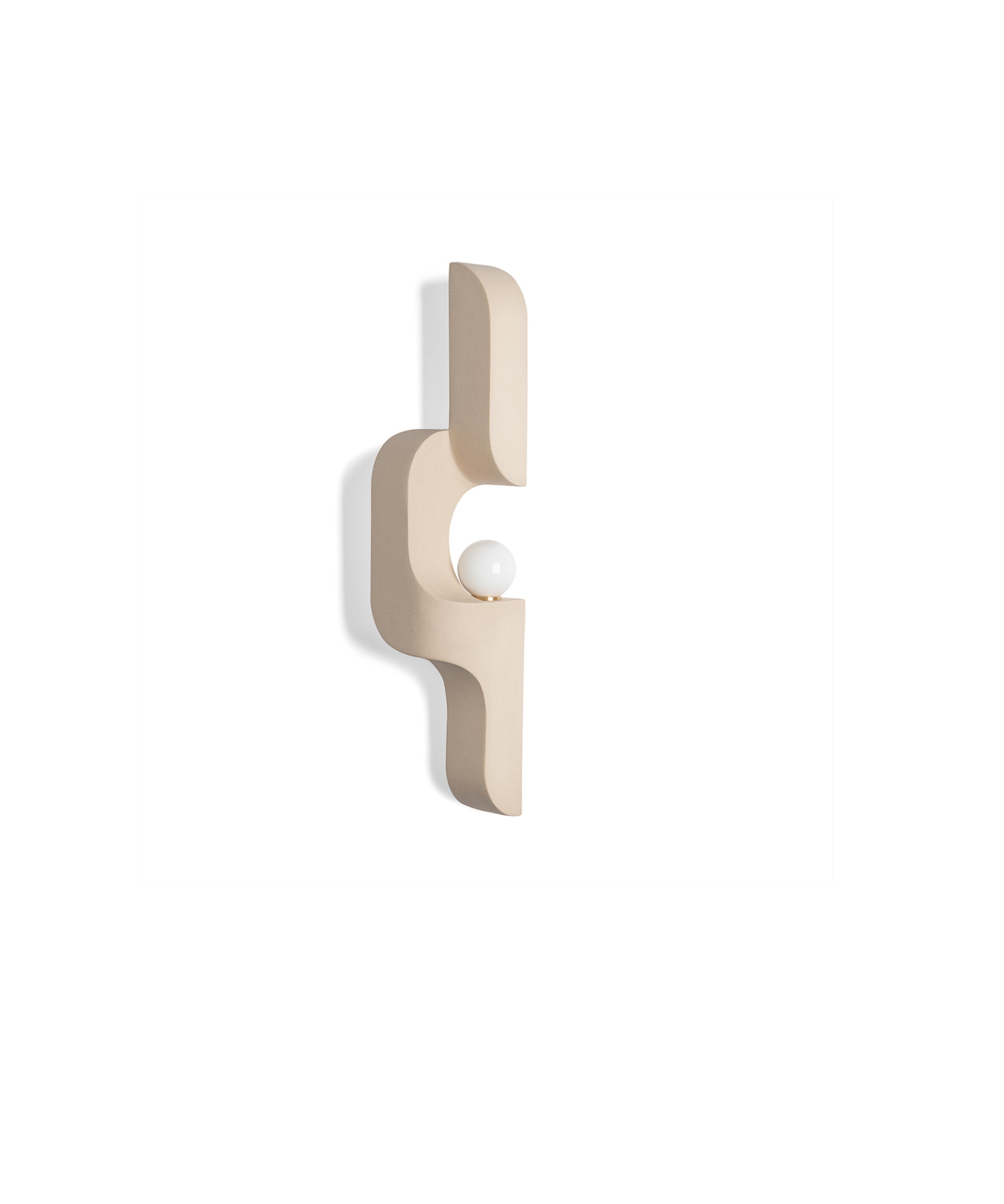 In this sandy slip-cast ceramic wall sconce, generous curves are paired with crisp edges. The repetition of geometry creates a three-dimensional flow.
