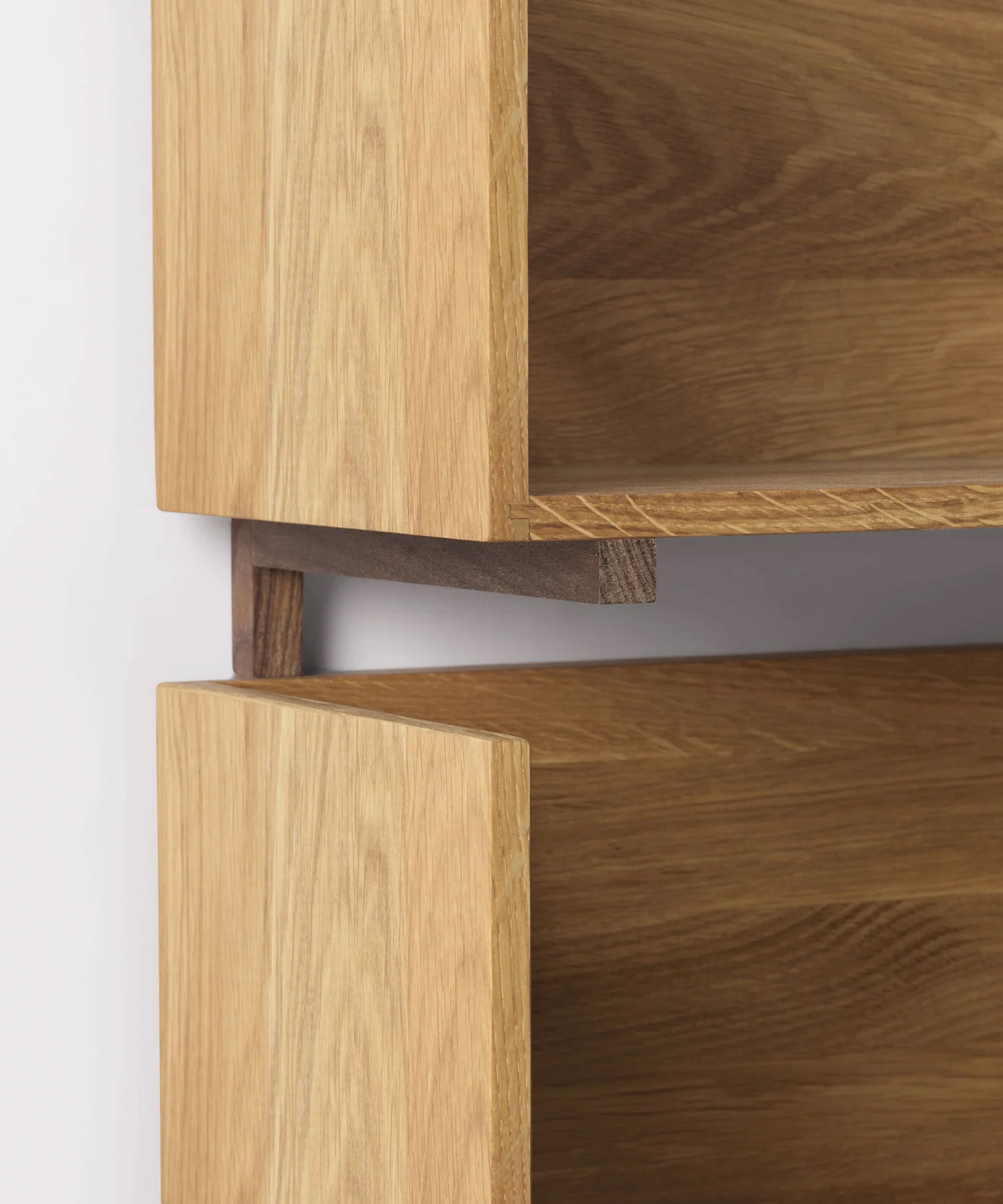 The Stack Storage shelves provide a perfect organizing platform and will fit perfectly in your hallway or living room. The Stack Wall Shelves can be stacked on top of each other which enables you to create an elegant shelving system. The shelves are aligned using small dowels that connect the walnut wood pieces on the back of the shelves. Create a unique atmosphere by displaying your favorite objects on this Danish-designed shelf from Kristina Dam Studio. The solid oak gives the stack wall shelf an organic look and its crystal clear and minimalistic design makes it easy to fit into any modern and confident interior. Introduce style to your home with these modern and practical shelves. The design is minimalistic and contemporary infused with beautiful details in the form of the dark walnut "legs" that are visible under the shelf.