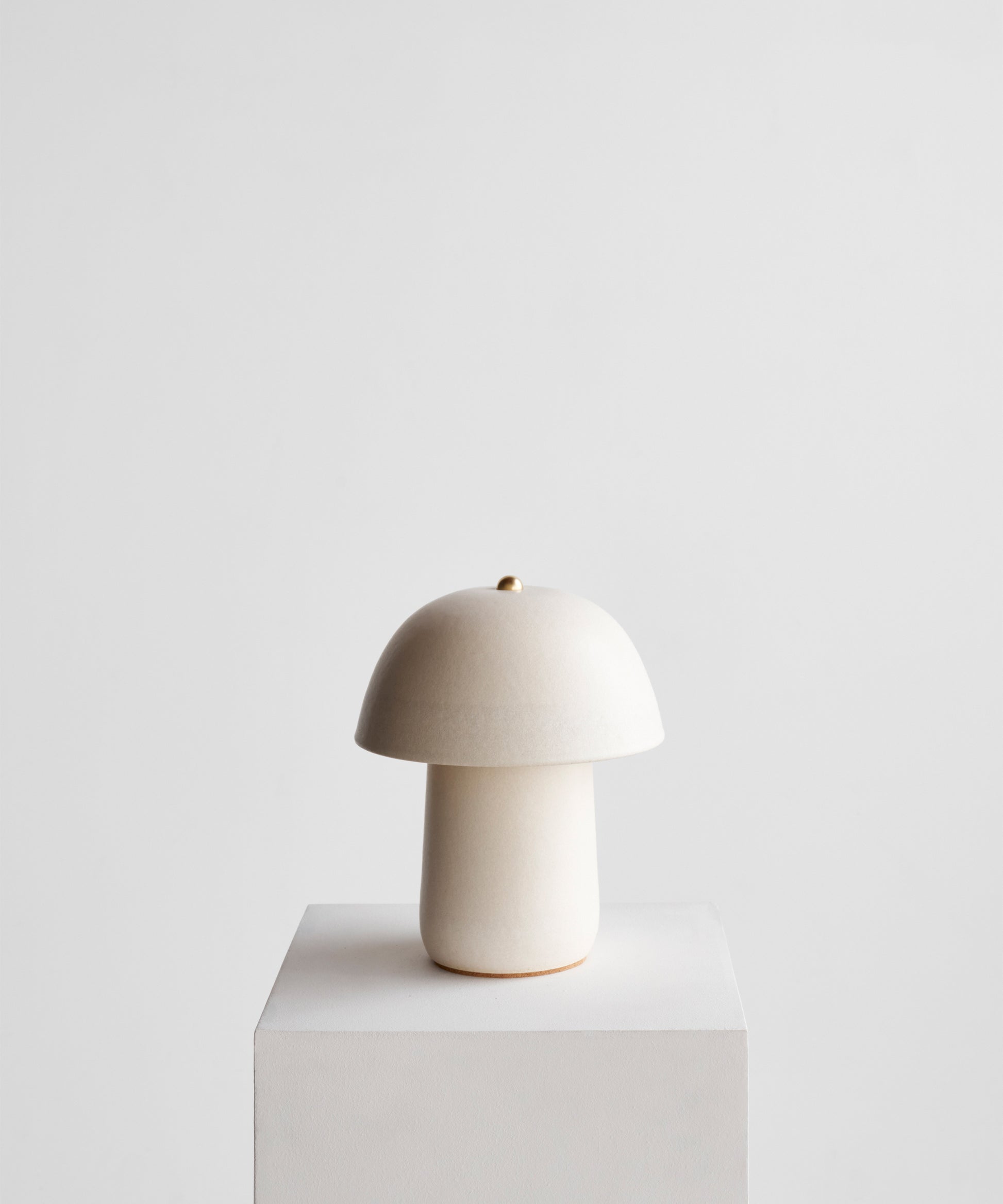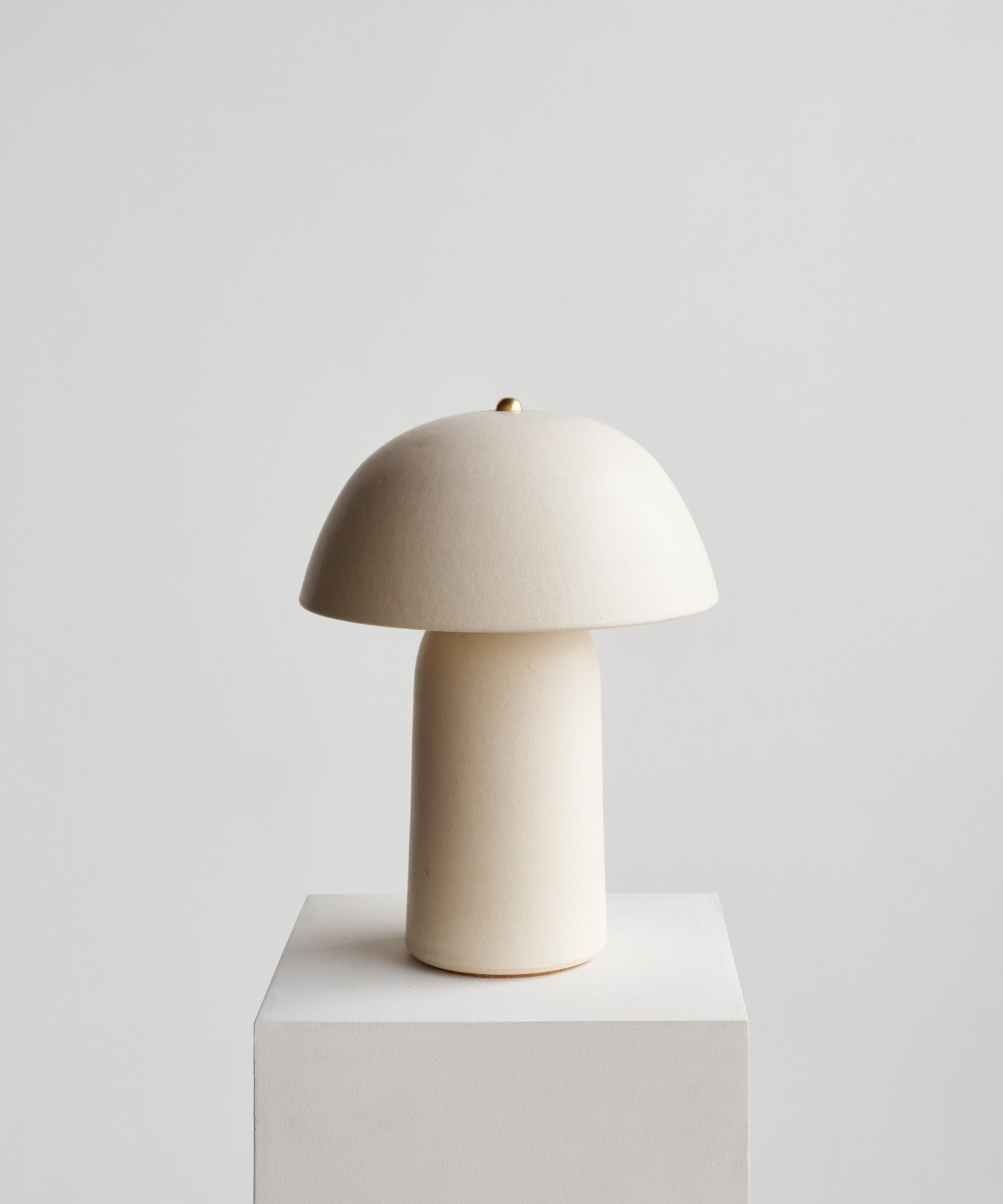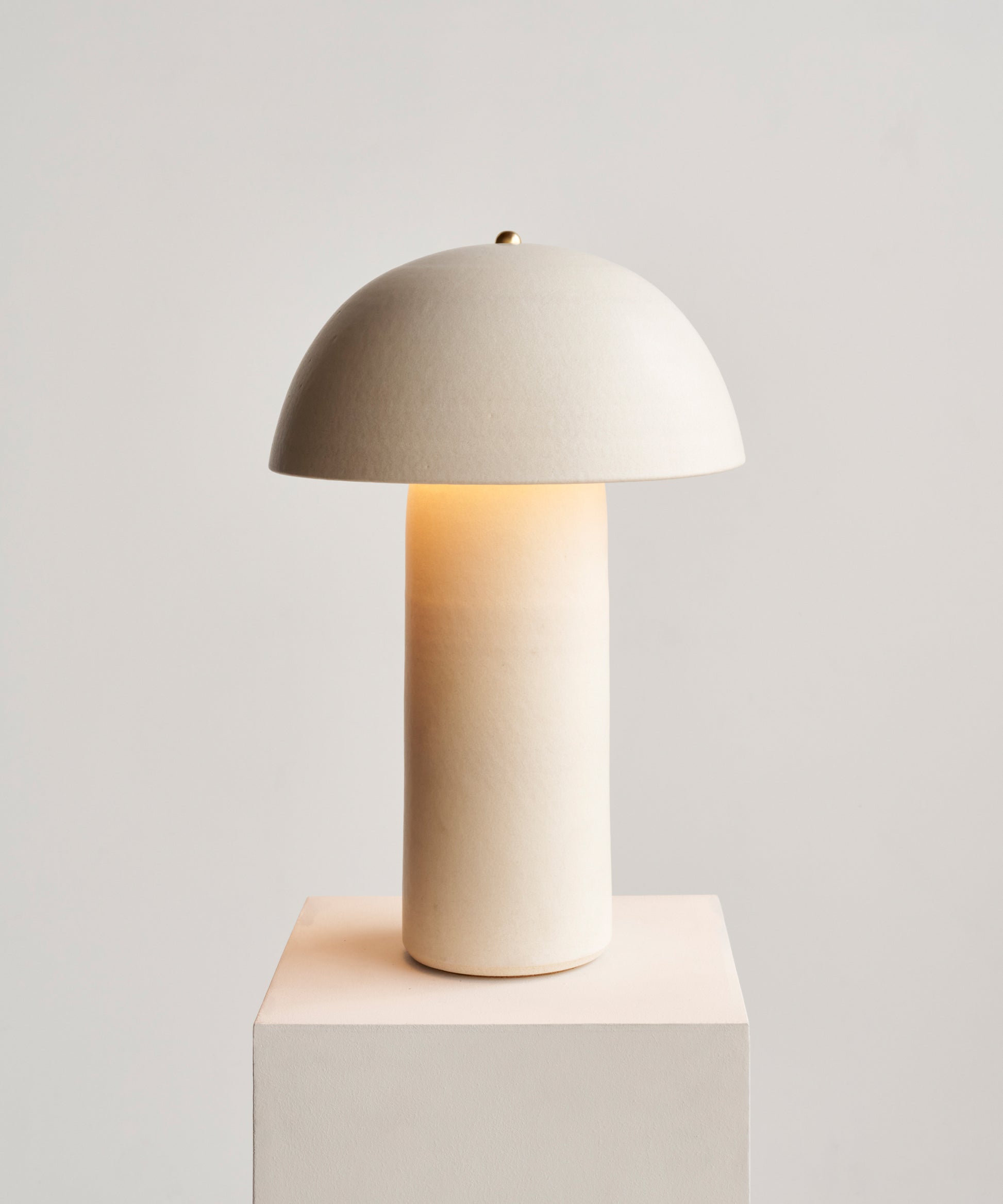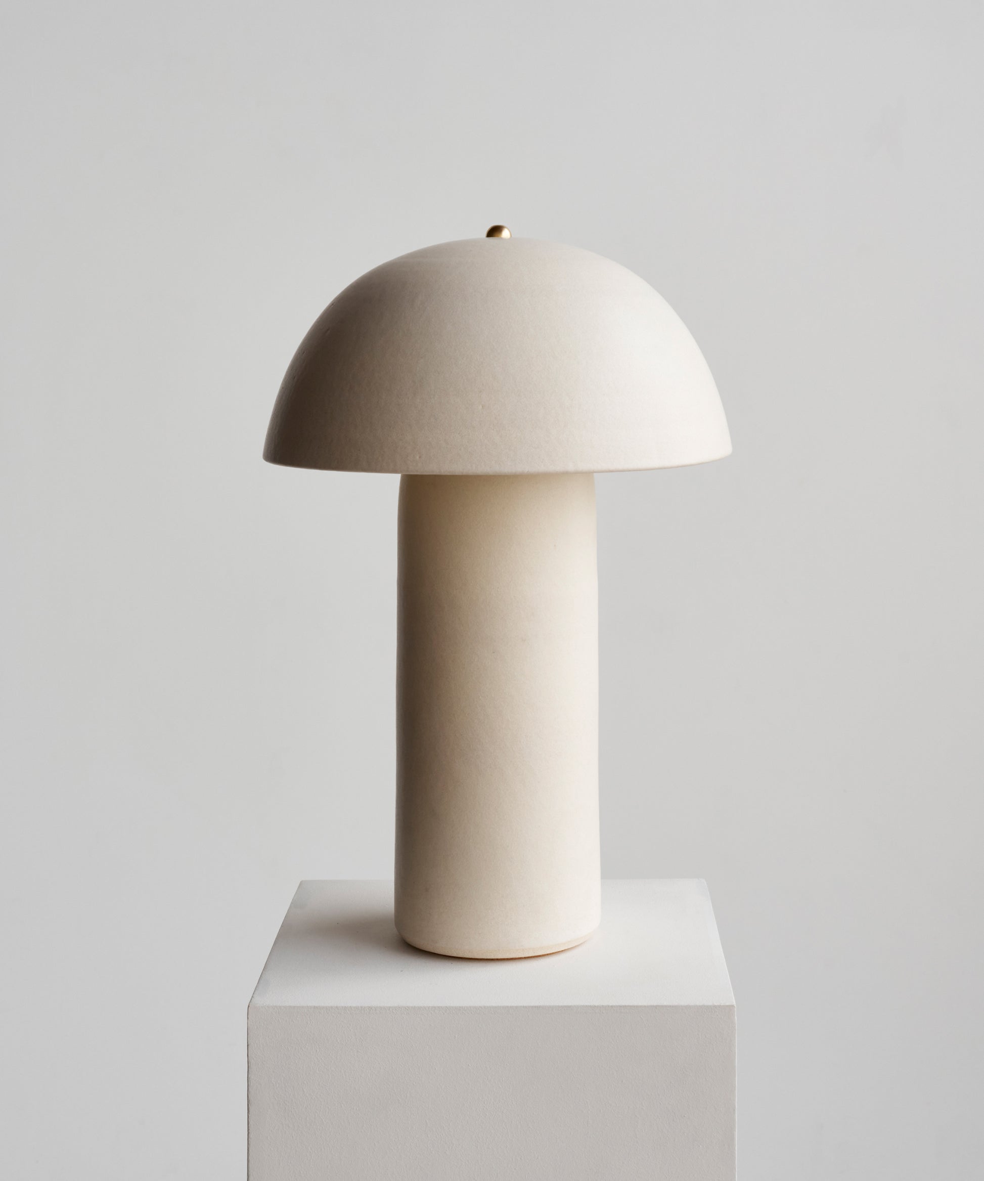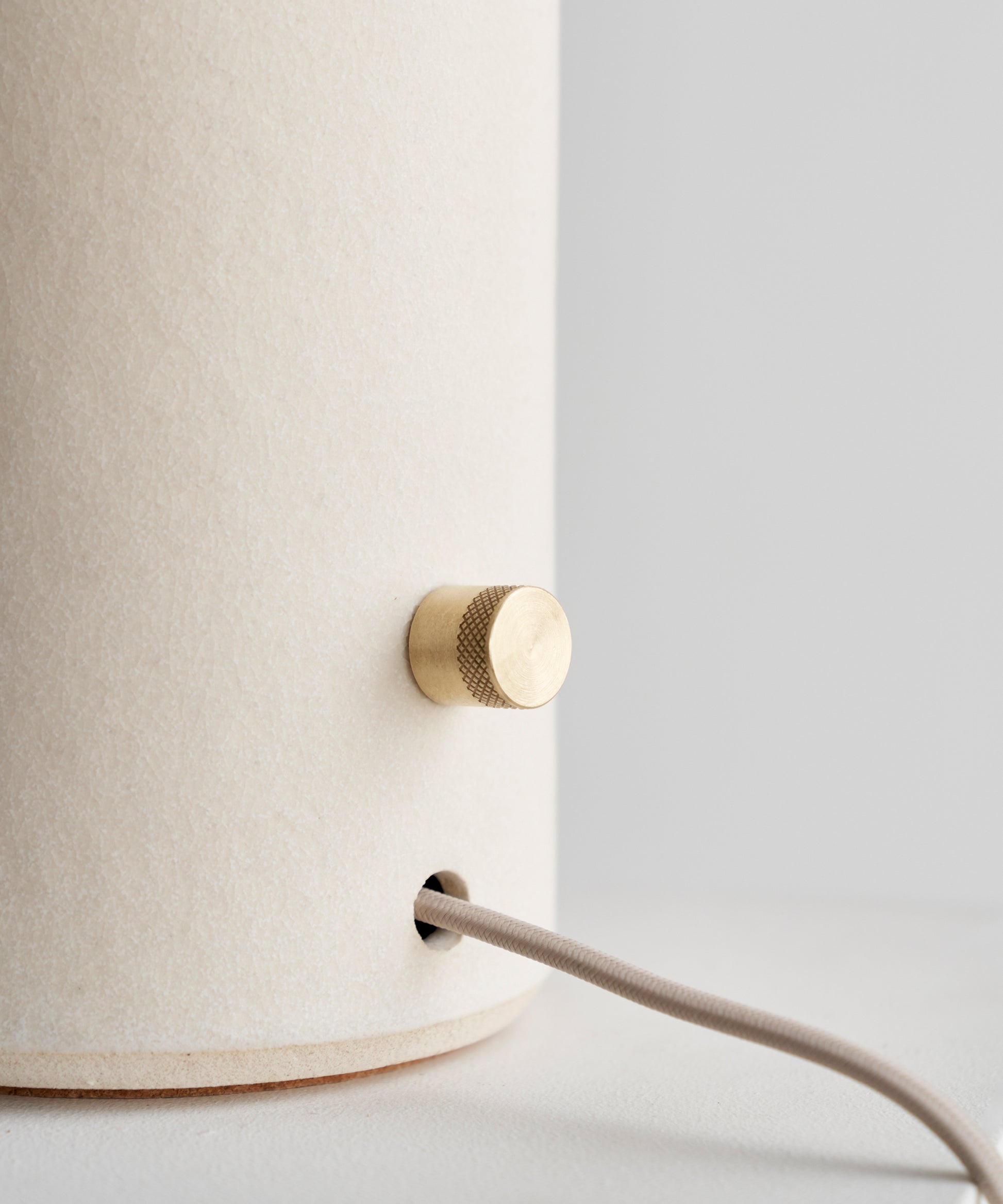 Each Tera Lamp is made of a wheel-thrown ceramic shade and ceramic base, brass hardware, a dimming switch, and LED light bulbs.