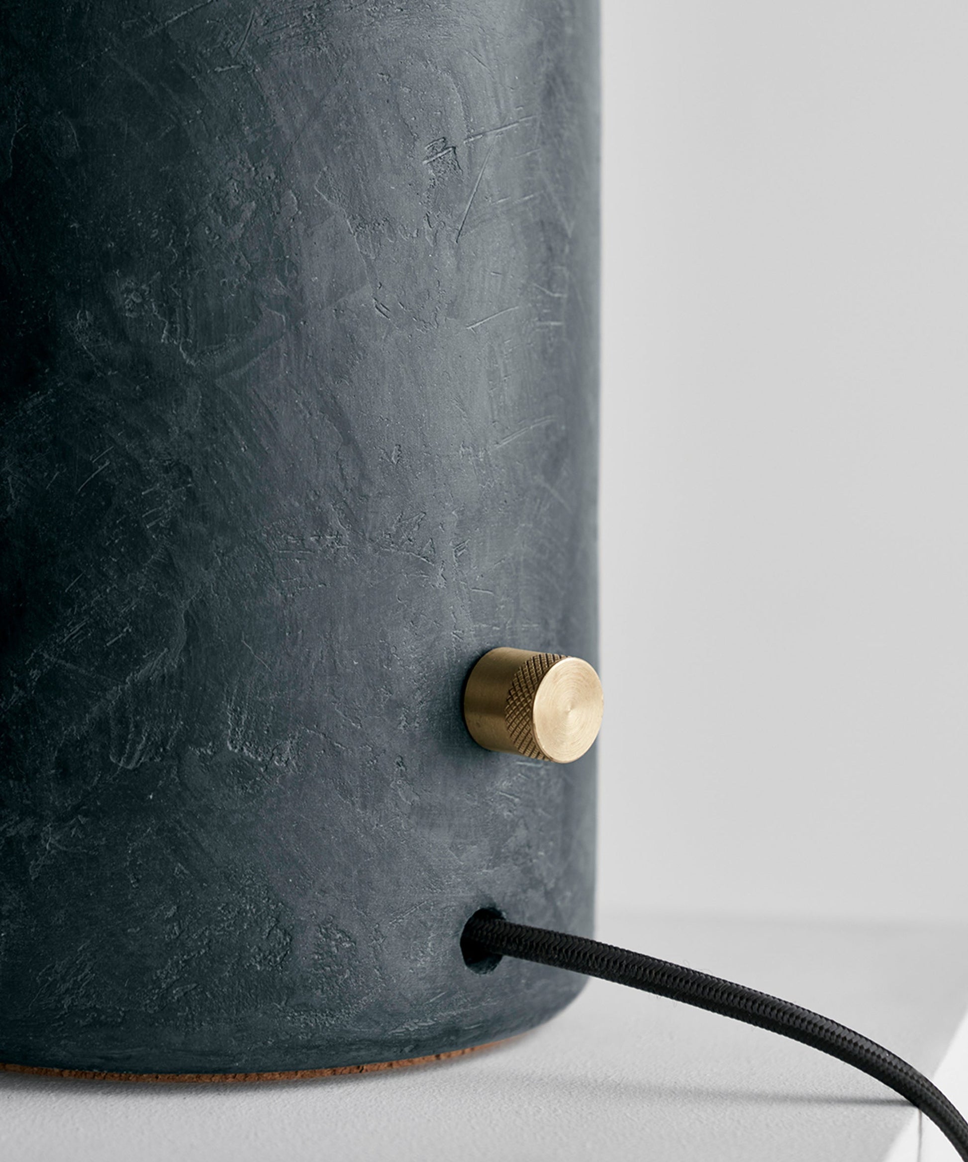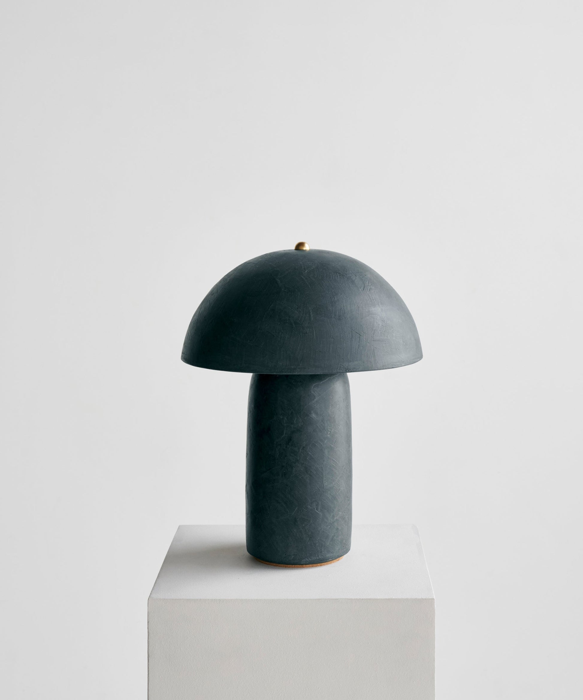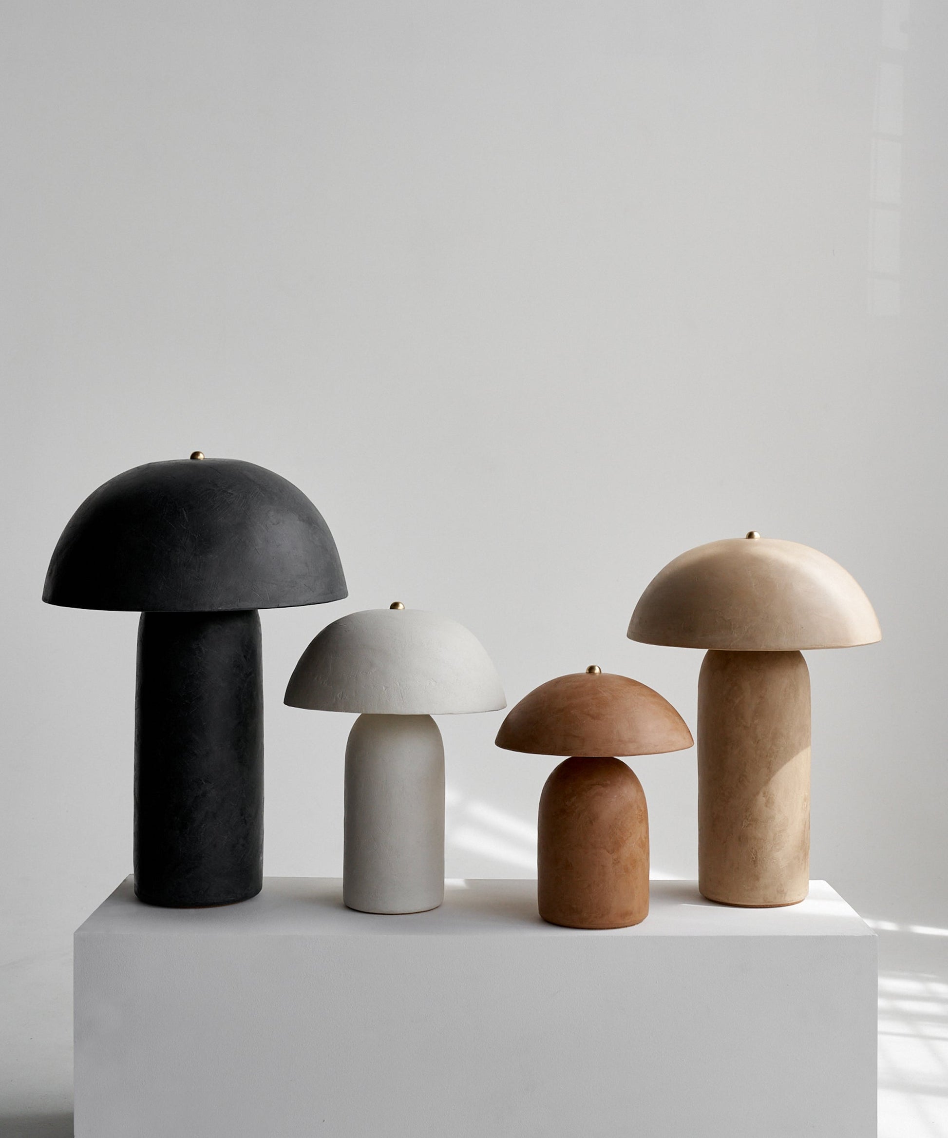 Each Tera Lamp is made of a wheel-thrown ceramic shade and ceramic base, brass hardware, a dimming switch, and LED light bulbs.