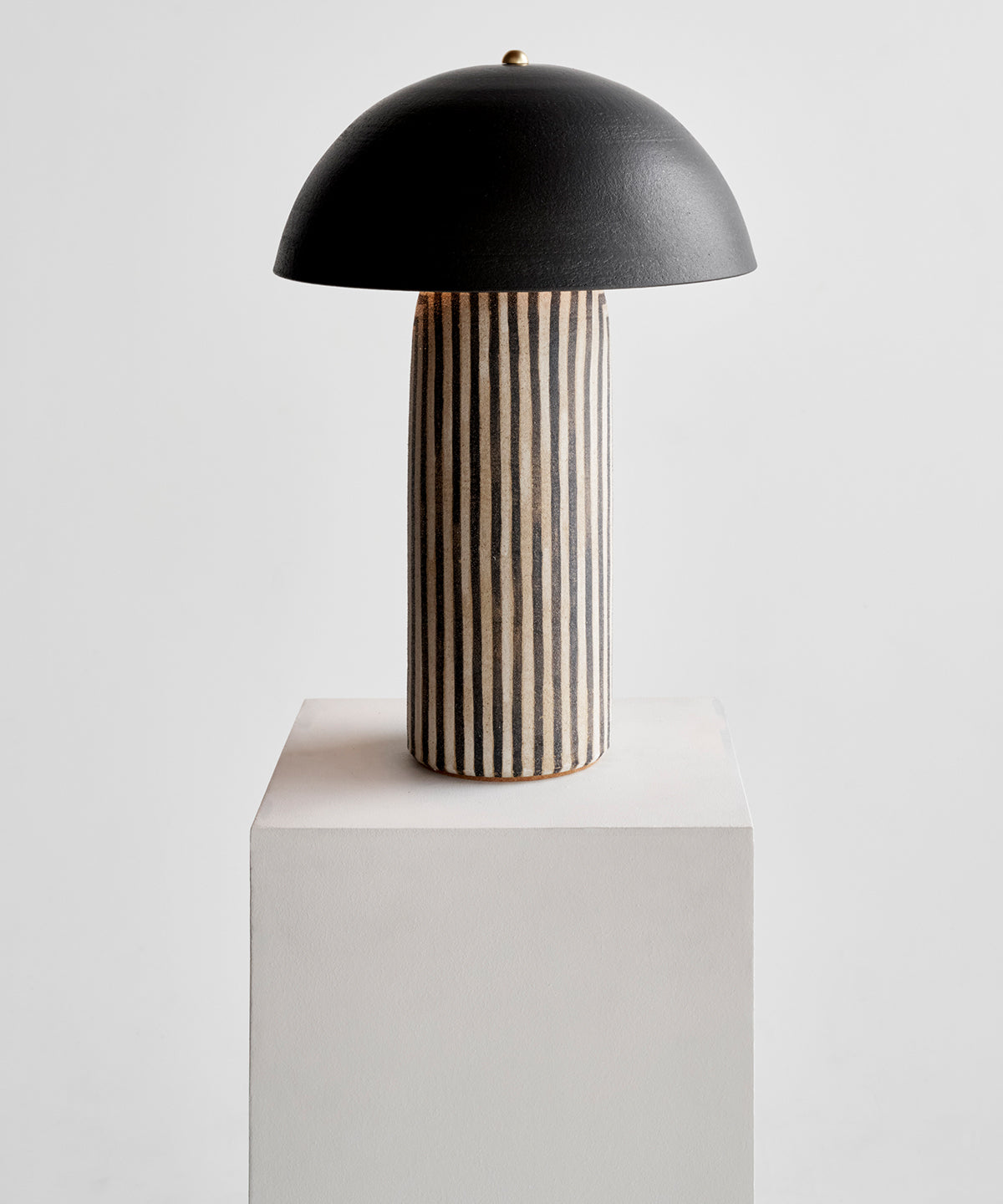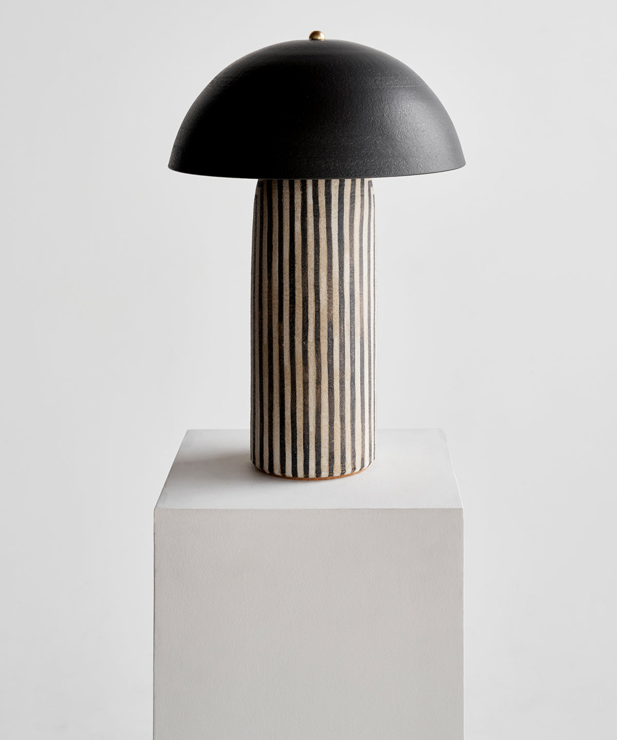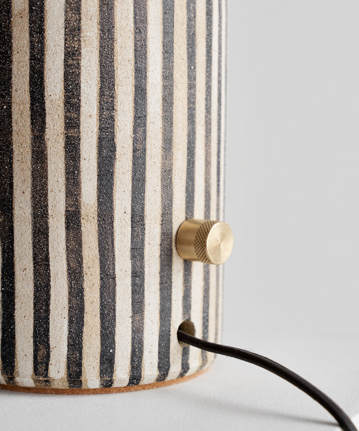 Striped based with black glazed shade. Each stripe is hand-painted in a matte underglaze that allows the texture of the stoneware to come through giving it a polished yet organic look.