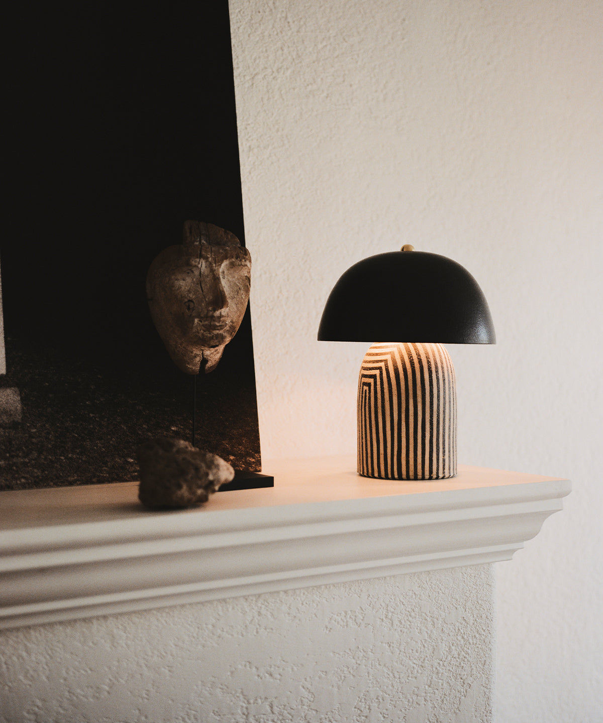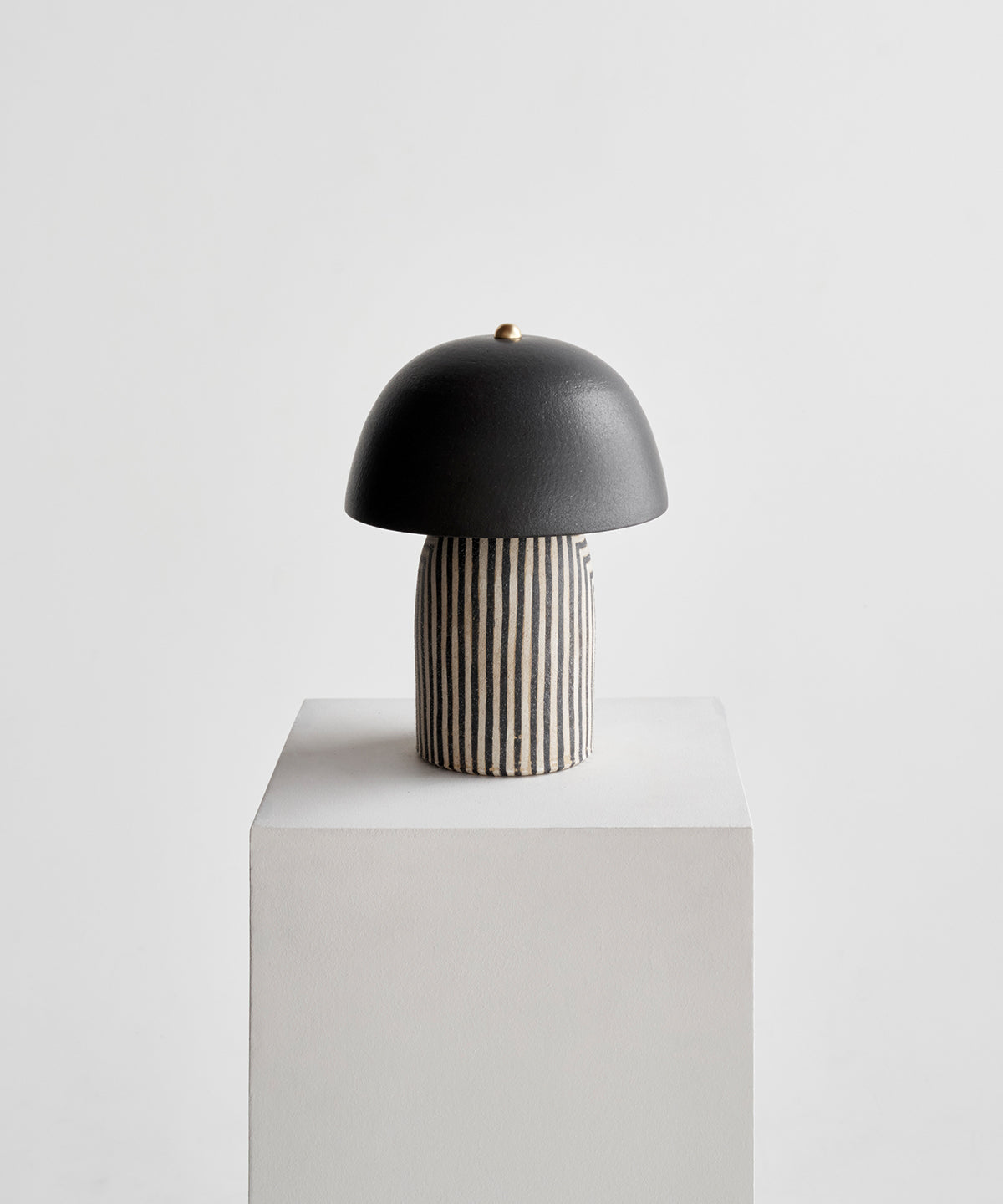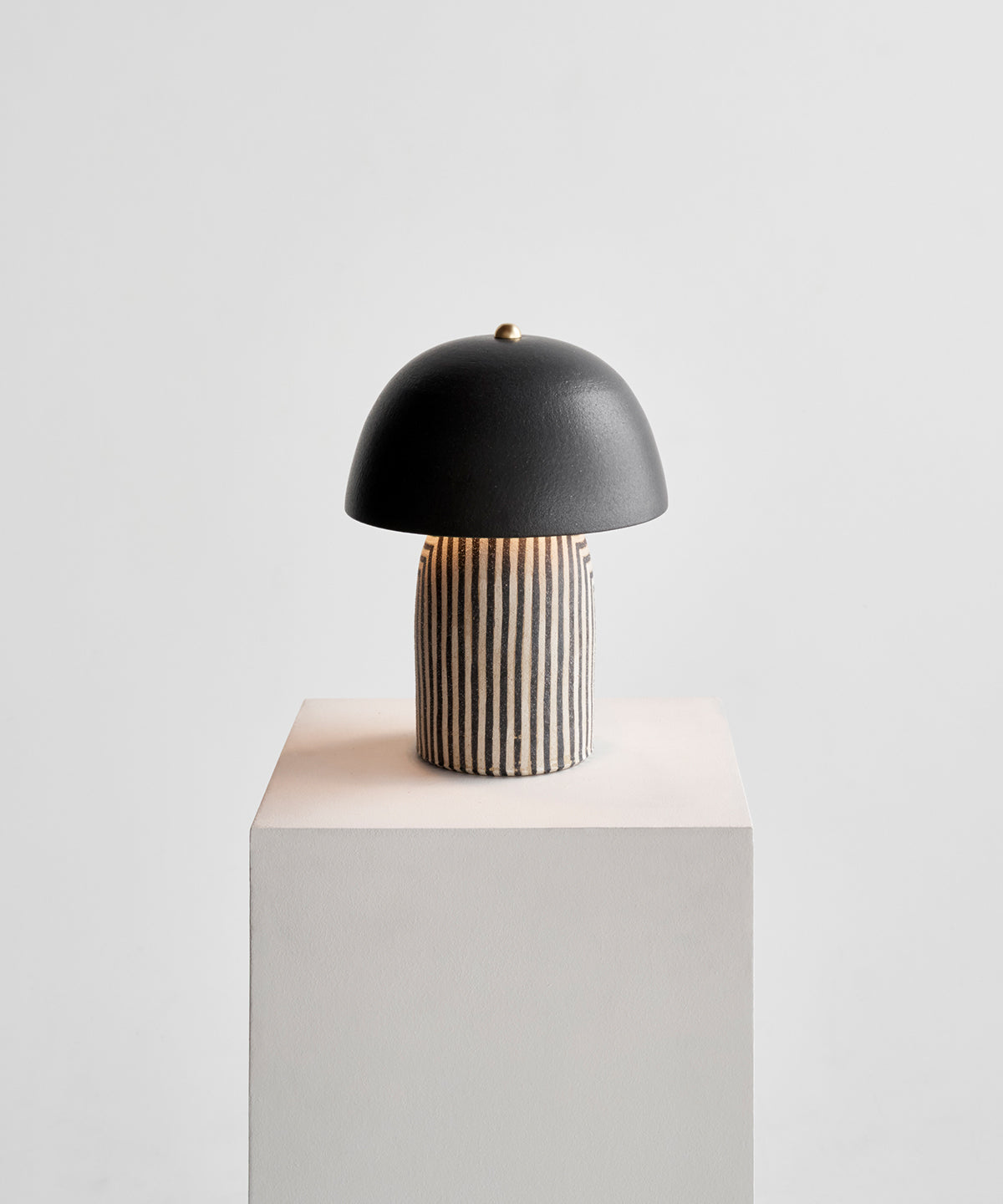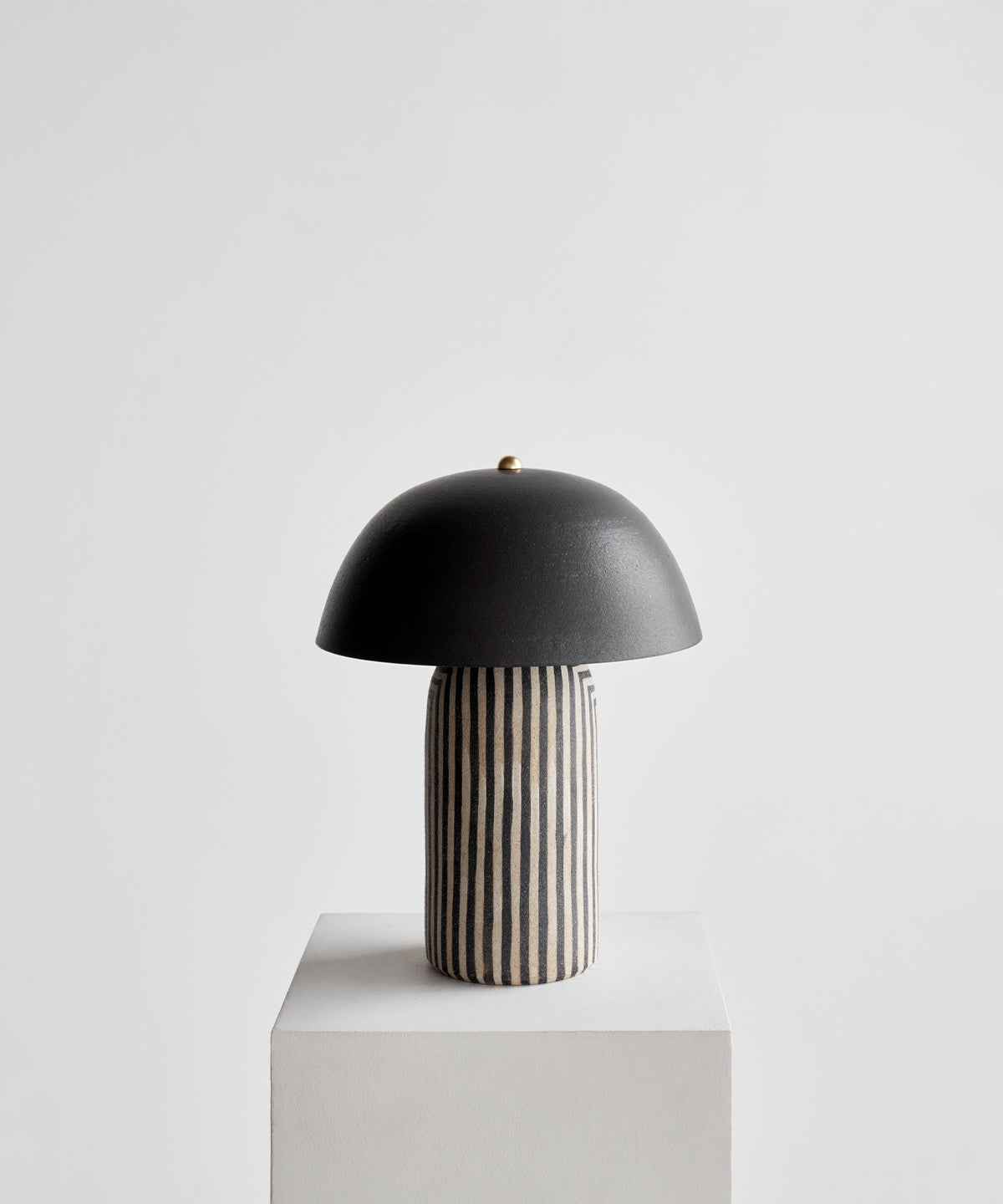 Striped based with black glazed shade. Each stripe is hand-painted in a matte underglaze that allows the texture of the stoneware to come through giving it a polished yet organic look.