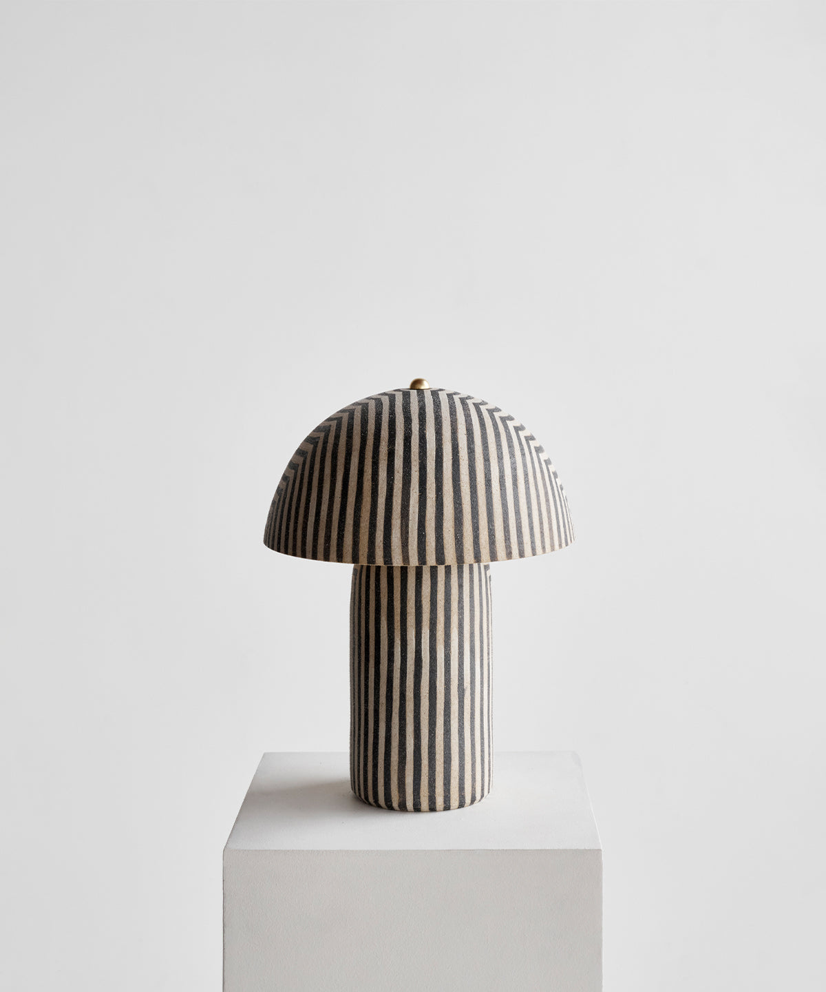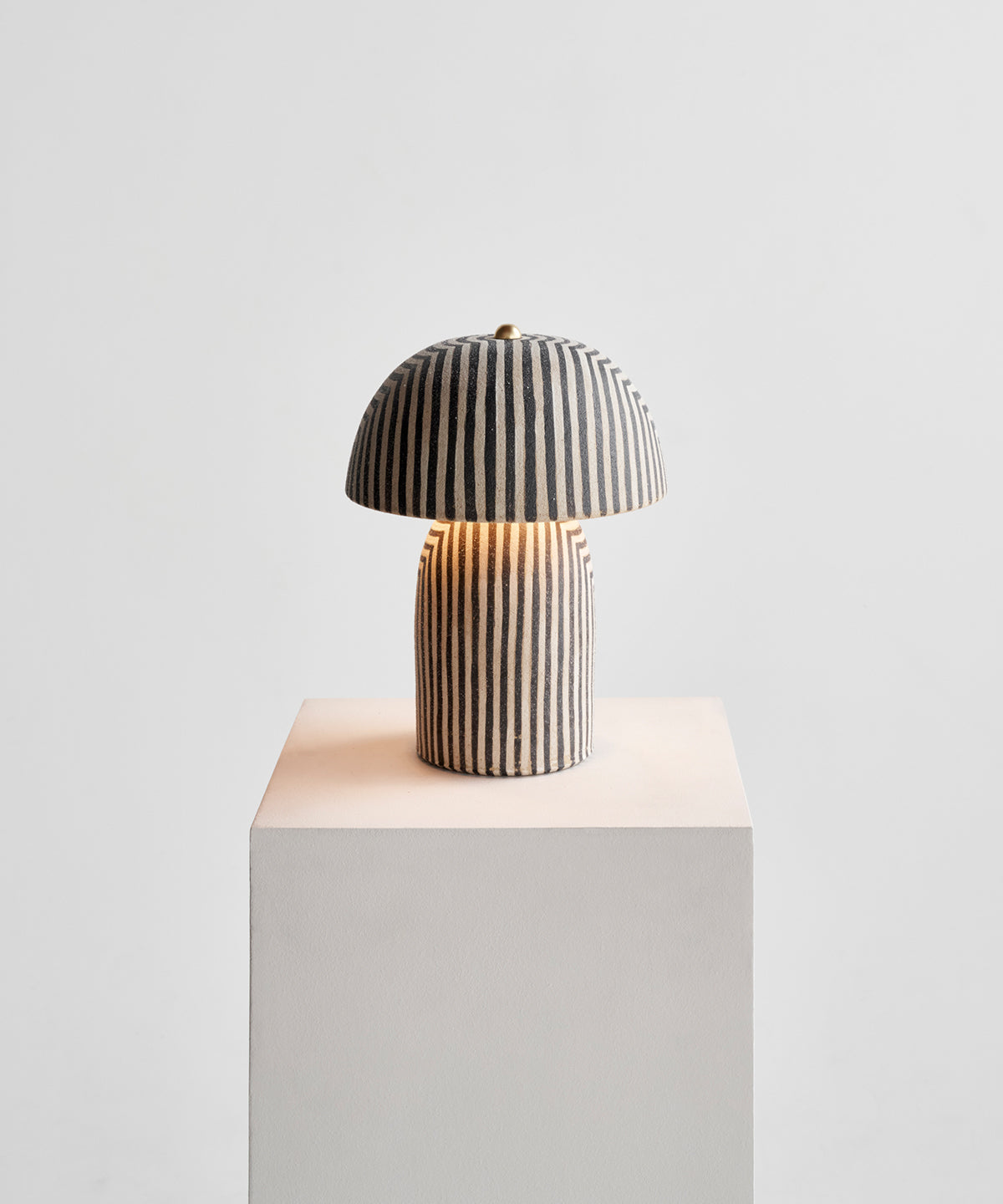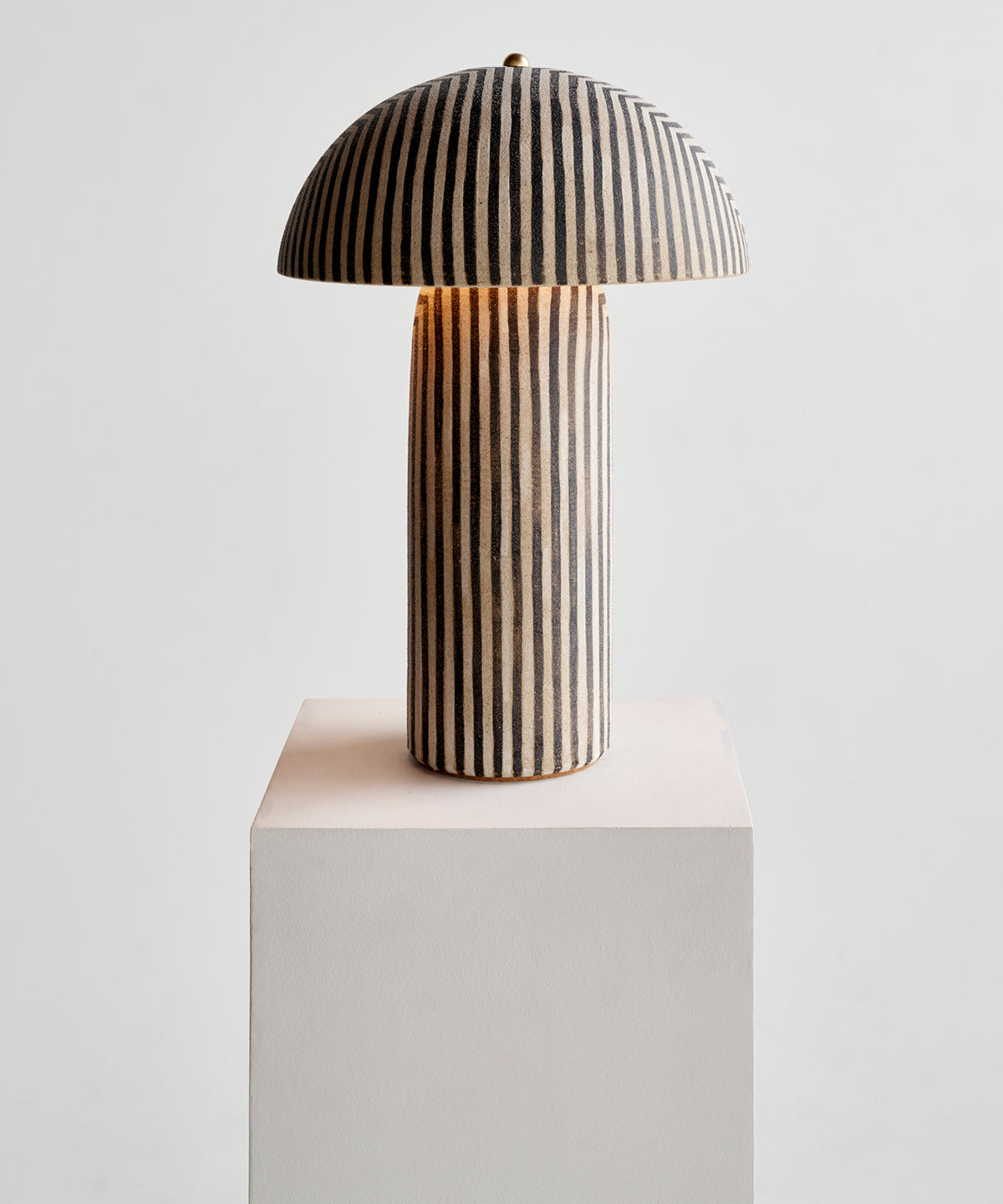 Each Tera Lamp is made of a wheel-thrown ceramic shade and ceramic base, brass hardware, a dimming switch, and LED light bulbs.