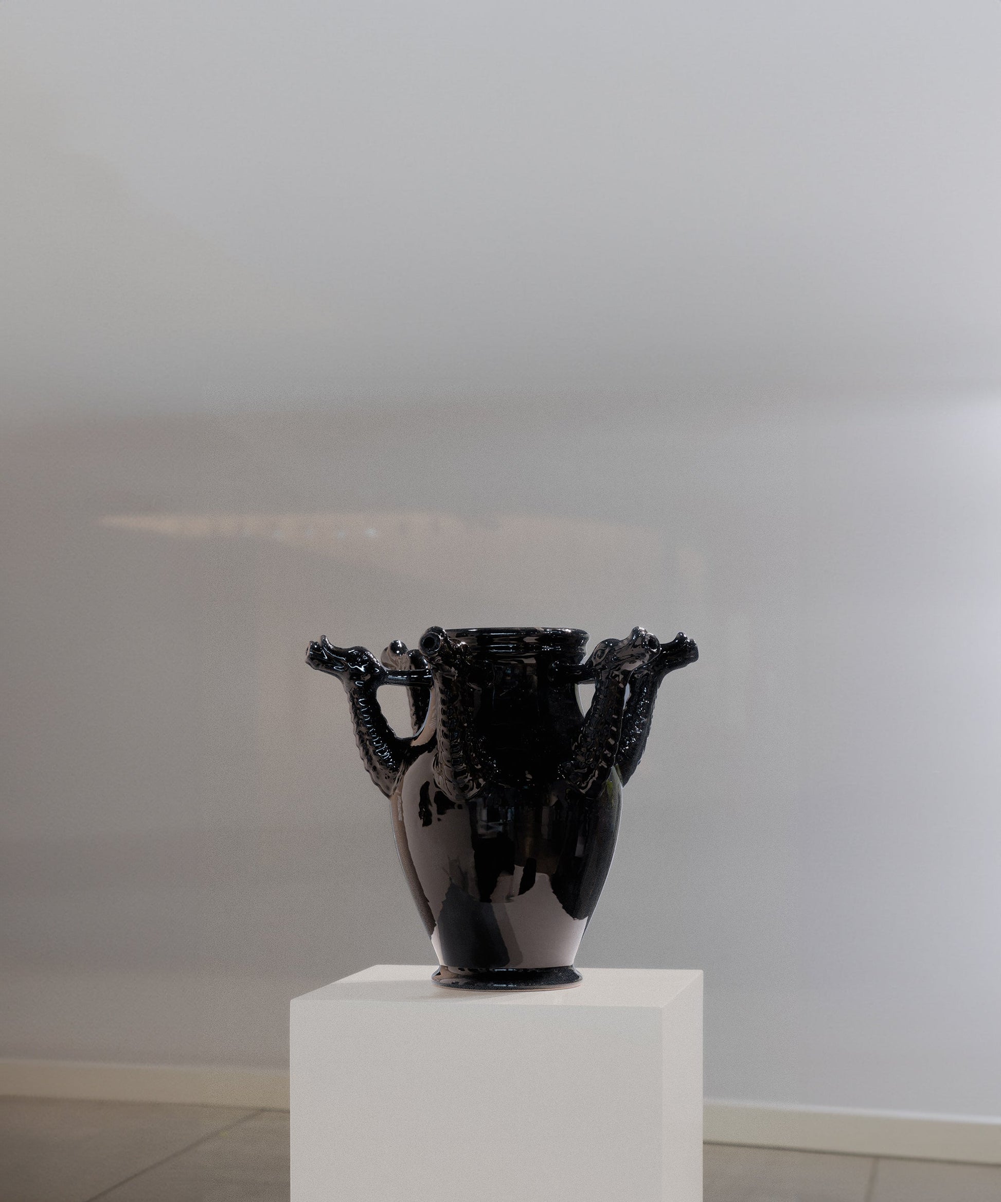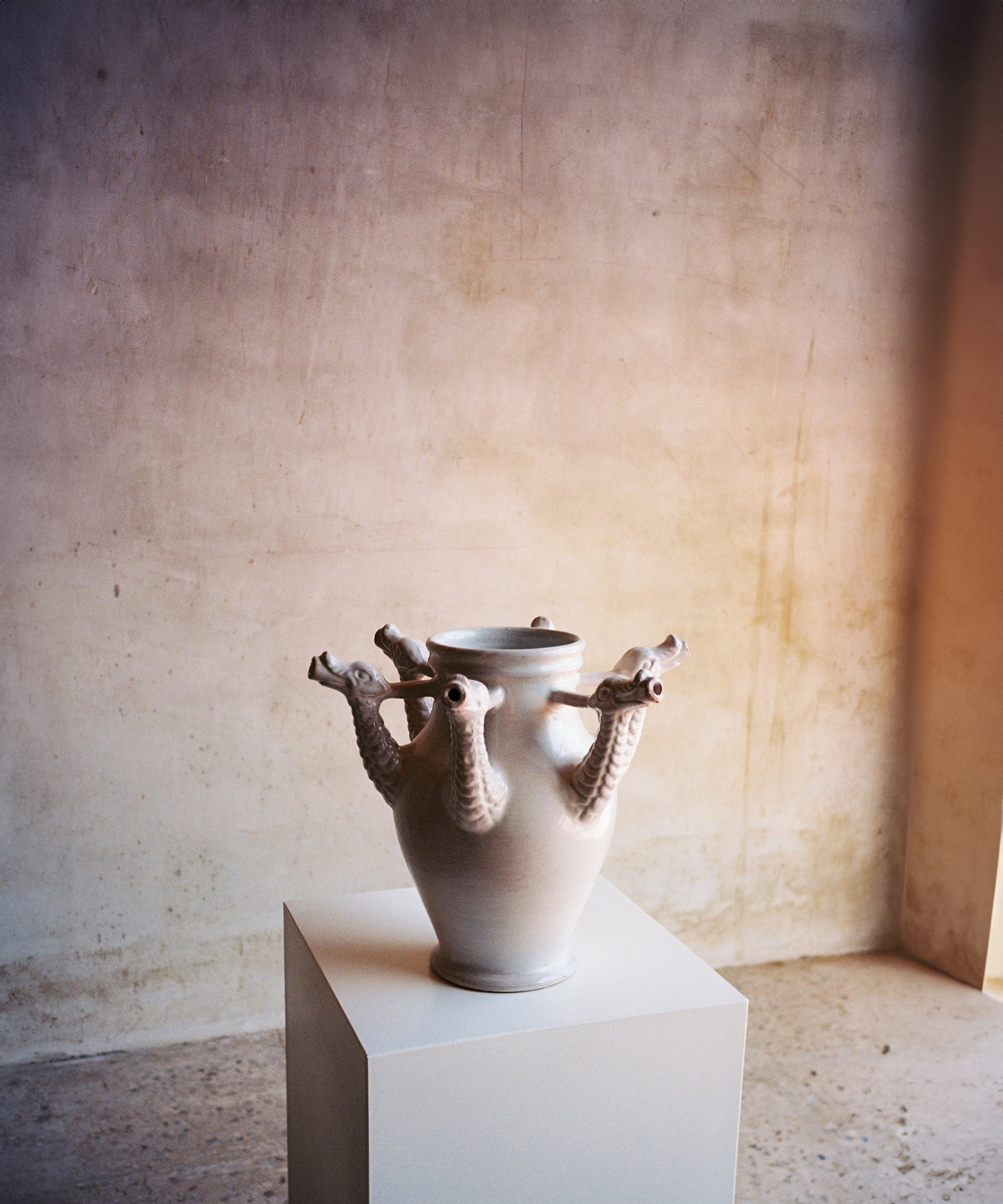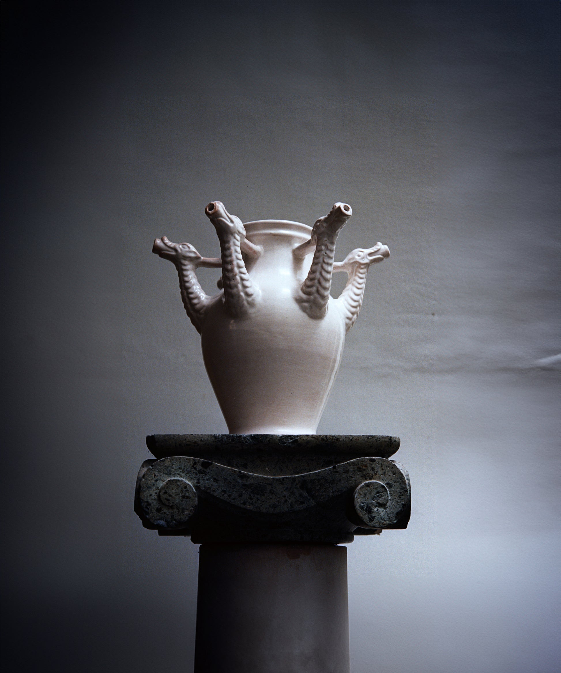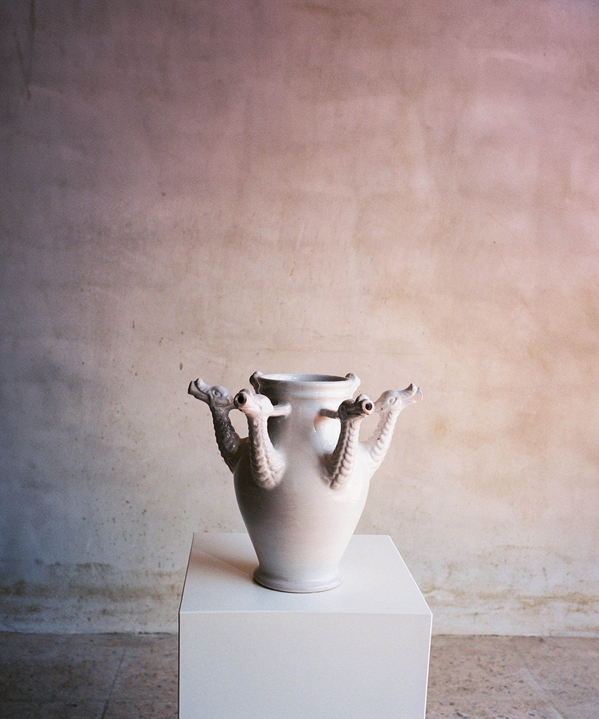 The Drago Vase takes inspiration from the drug pots produced in Castelli belonging to the Orsini-Colonna collection. These vessels would have been used by an apothecary to store herbal syrups. This six-dragon-head ceramic is a reinterpretation of the original pot which was especially designed for the wedding trousseau. The vase is handthrown and the heads are molded by hand and the original decor has been whited out and blacked out.