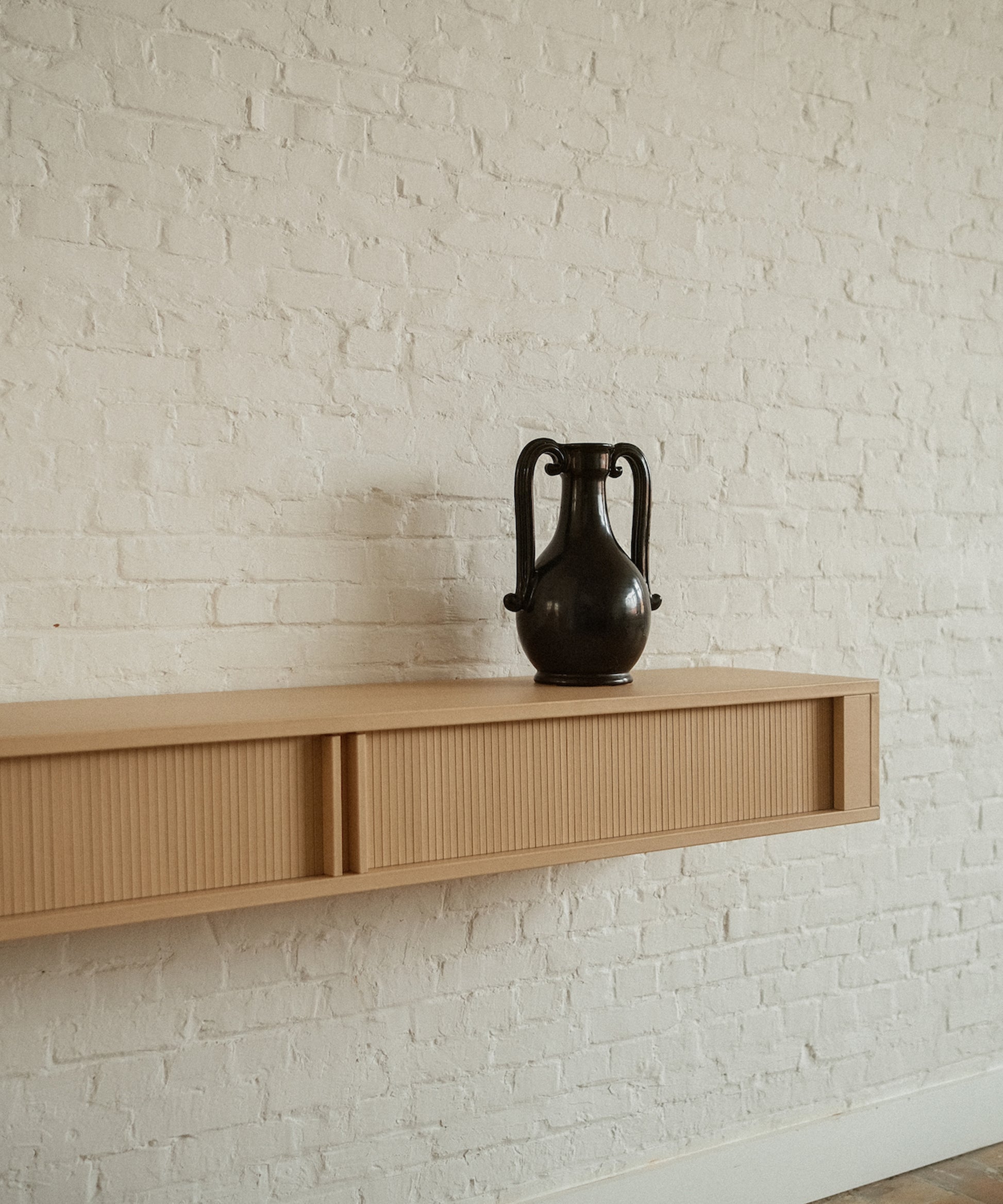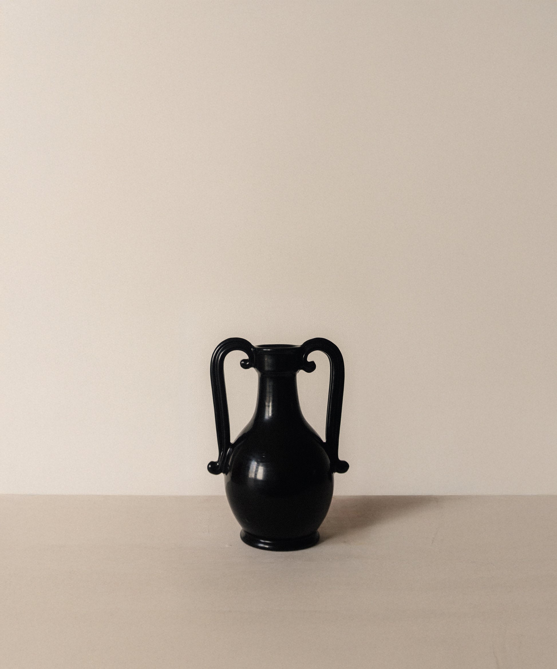 The Fiasca takes inspiration from storage vessels made in fairly standard shapes, they were designed to fit with dozens of others on a shelf, often in a pharmacy or shop. Their handles therefore tend to fit within the vessel’s profile, and the jar is generally narrower at the middle than at the top or bottom, making it easy to grip. The ceramic is handthrown and the orignal decor has been blacked out. The shiny black glaze has been rubbed by hand by the artisans to give this matte finish.