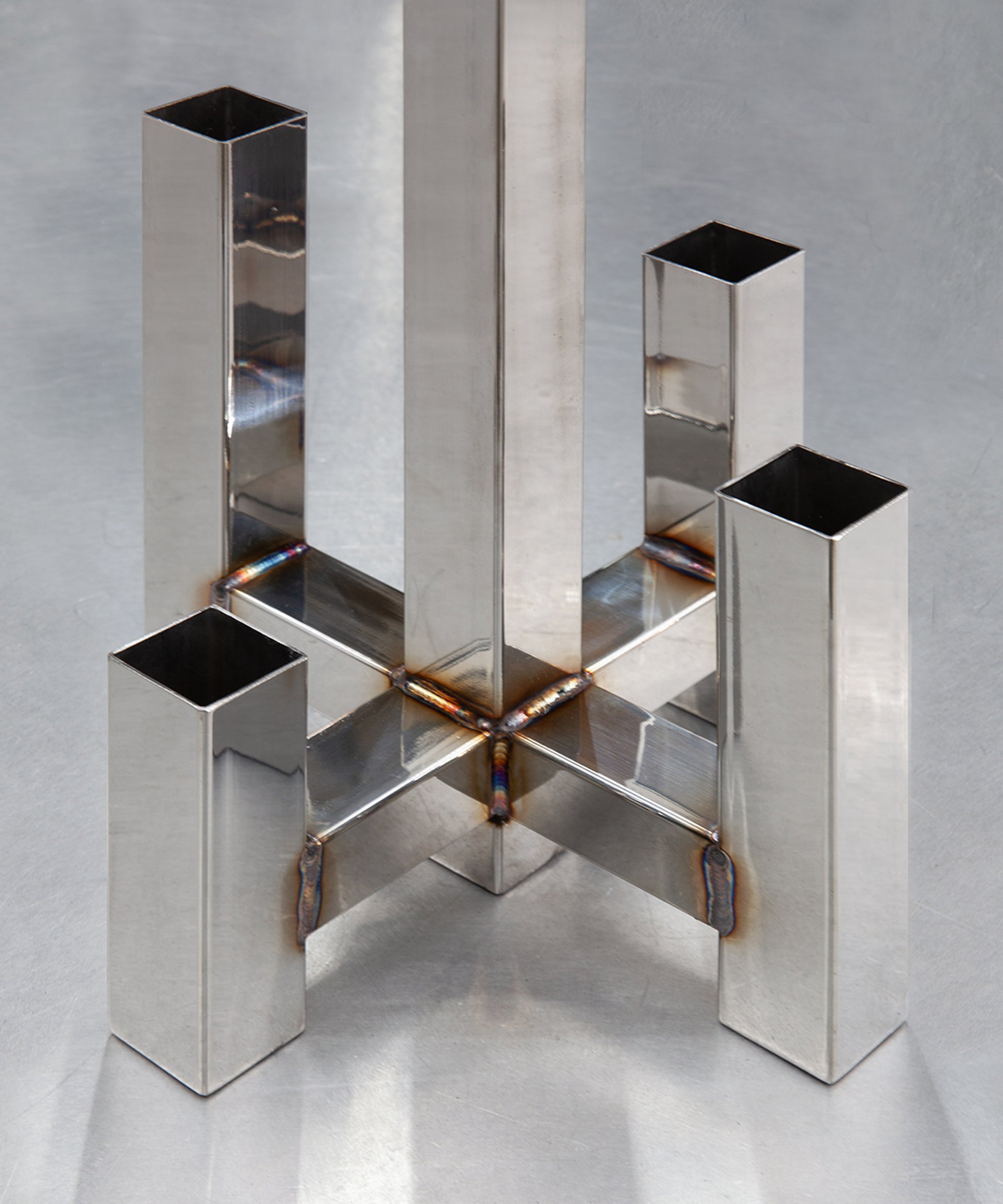 His designs employ the structural connections and intersections of variably sized pipes. Through this approach, he translates physical phenomena that occur during production into aesthetic expressions. Lee Si-san celebrates qualities inherent to industrial materials, showcasing the phenomenological essence of everyday objects.