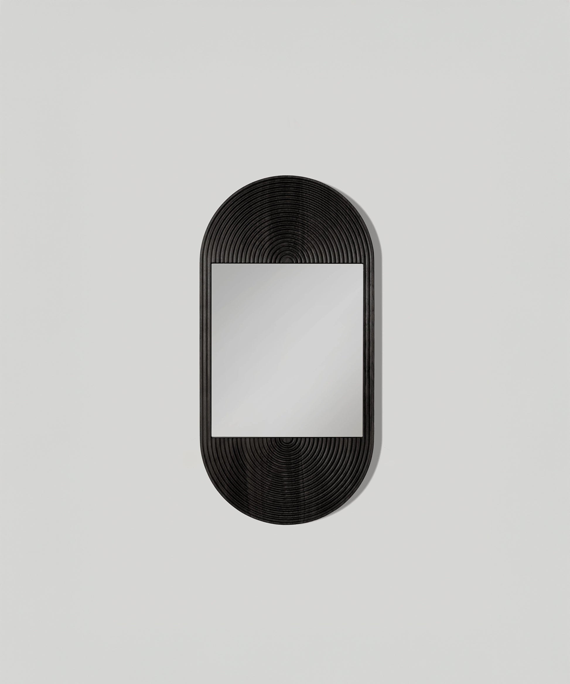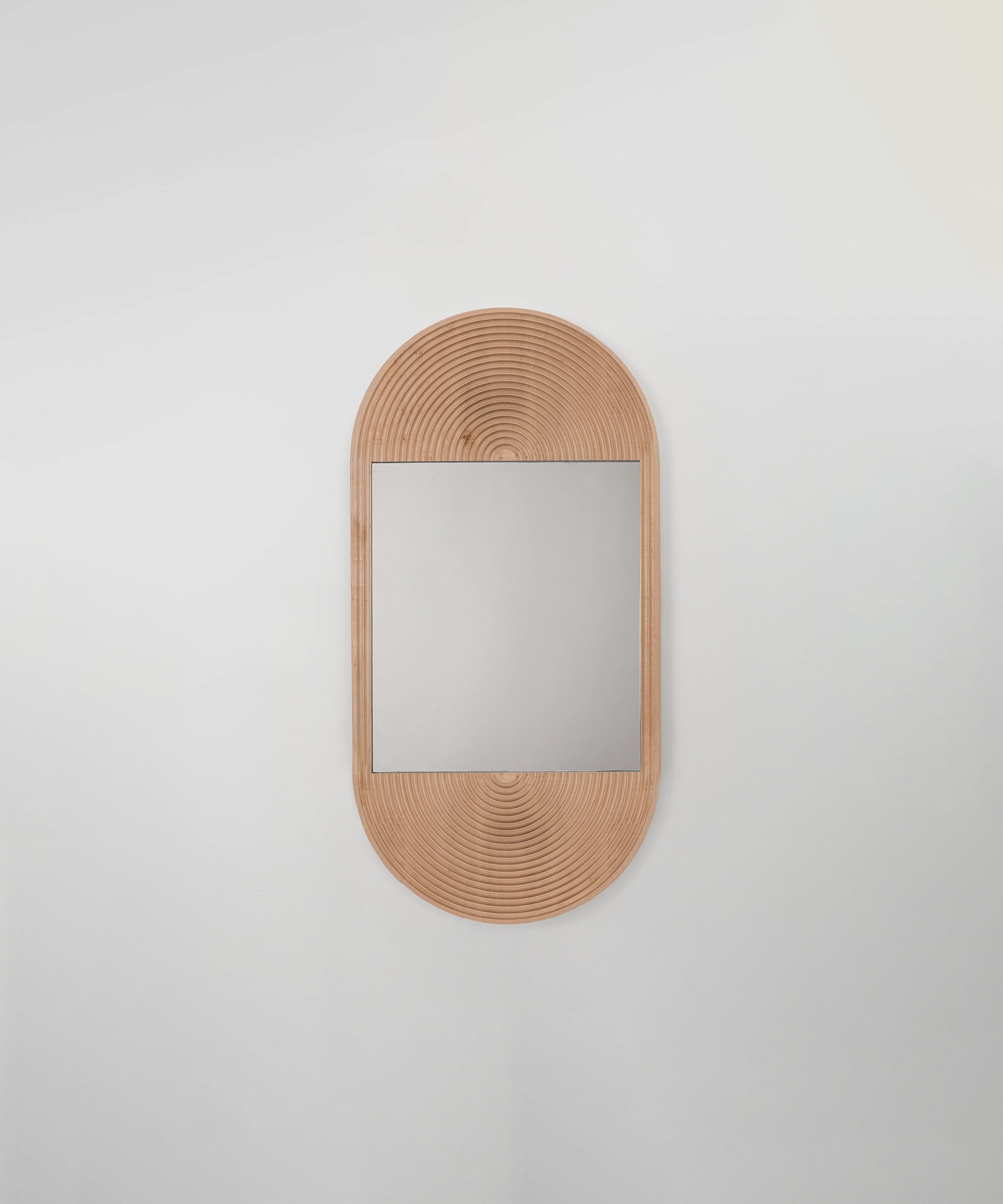 The rounded carving of the June Mirror creates wave-like patterning in the deep, textured grain. This mirror mounts both vertically and horizontally and is available in multiple sizes.