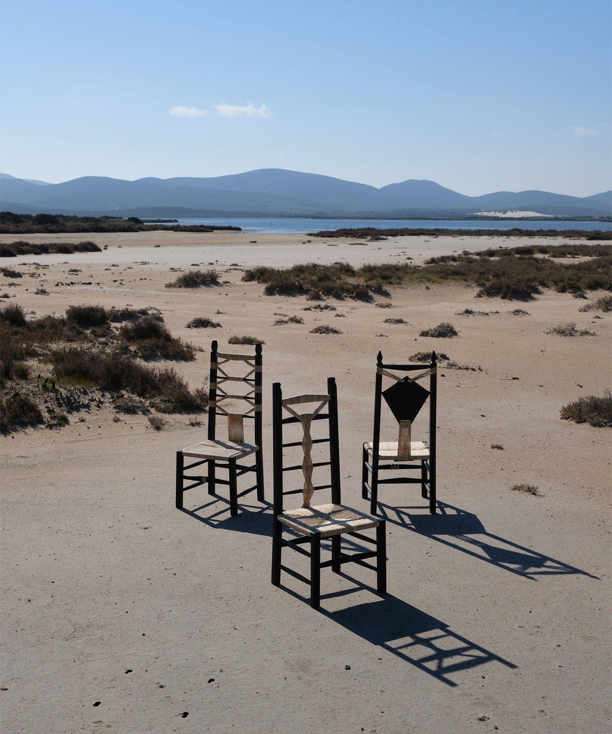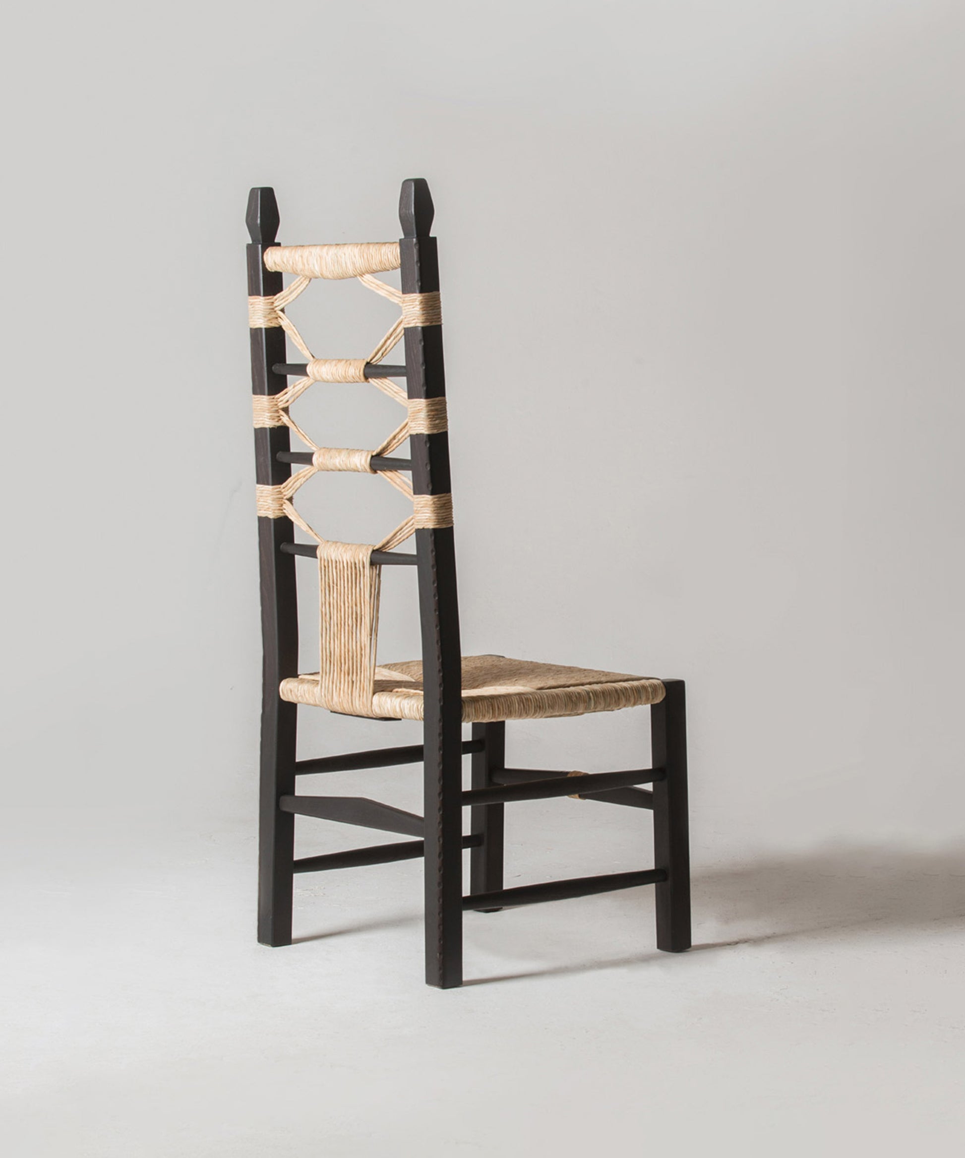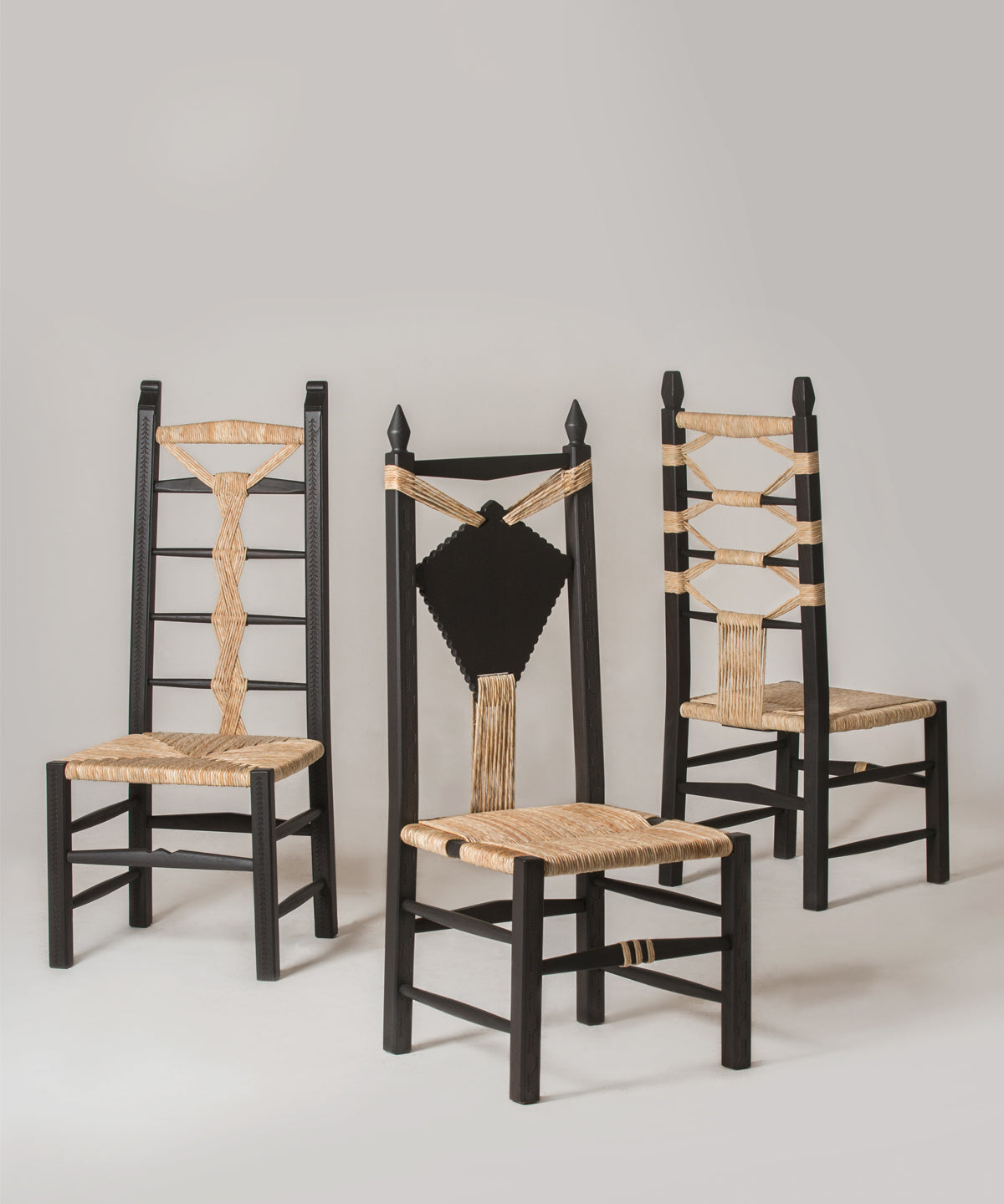 They are pulled out when visitors come over when the fire is lit, when it is time to sit in a circle and shell fava beans or crack open almonds. They come in various sizes, with older Sardinians preferring the smallest, child-sized chairs to perch on. Chiara Andreatti was inspired by the social aspect behind their use, and by the variations of design and decoration that can be found in historic versions. Her contemporary designs are enlarged versions - by maintaining the classic proportions while making them bigger overall, she has made them both important and comfortable. The decorations are directly inspired by her various experiences on the island, from visits to local weavers to handmade pasta (lorighittas) to the shapes of ancient talismans. For production, she worked with craftsman Pierpaolo Mandis. Pierpaolo is a third-generation woodworker and chairmaker from the hillside town of Mogoro who works alongside his brother-in-law. His father still goes every June to pick river reeds that will dry in the loft of their workshop before being soaked and hand-twisted to become the intricate weaving on Chiara’s chairs.