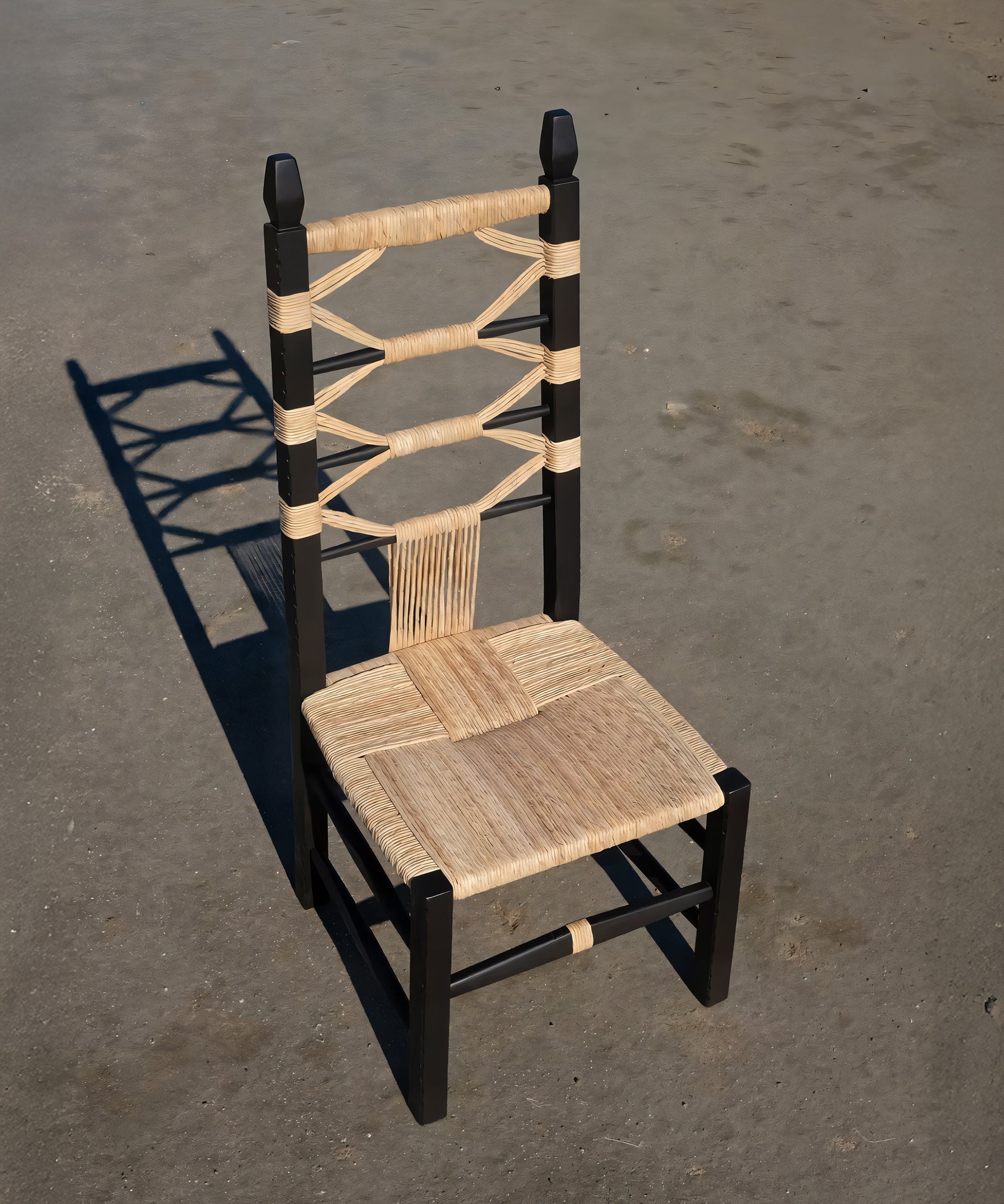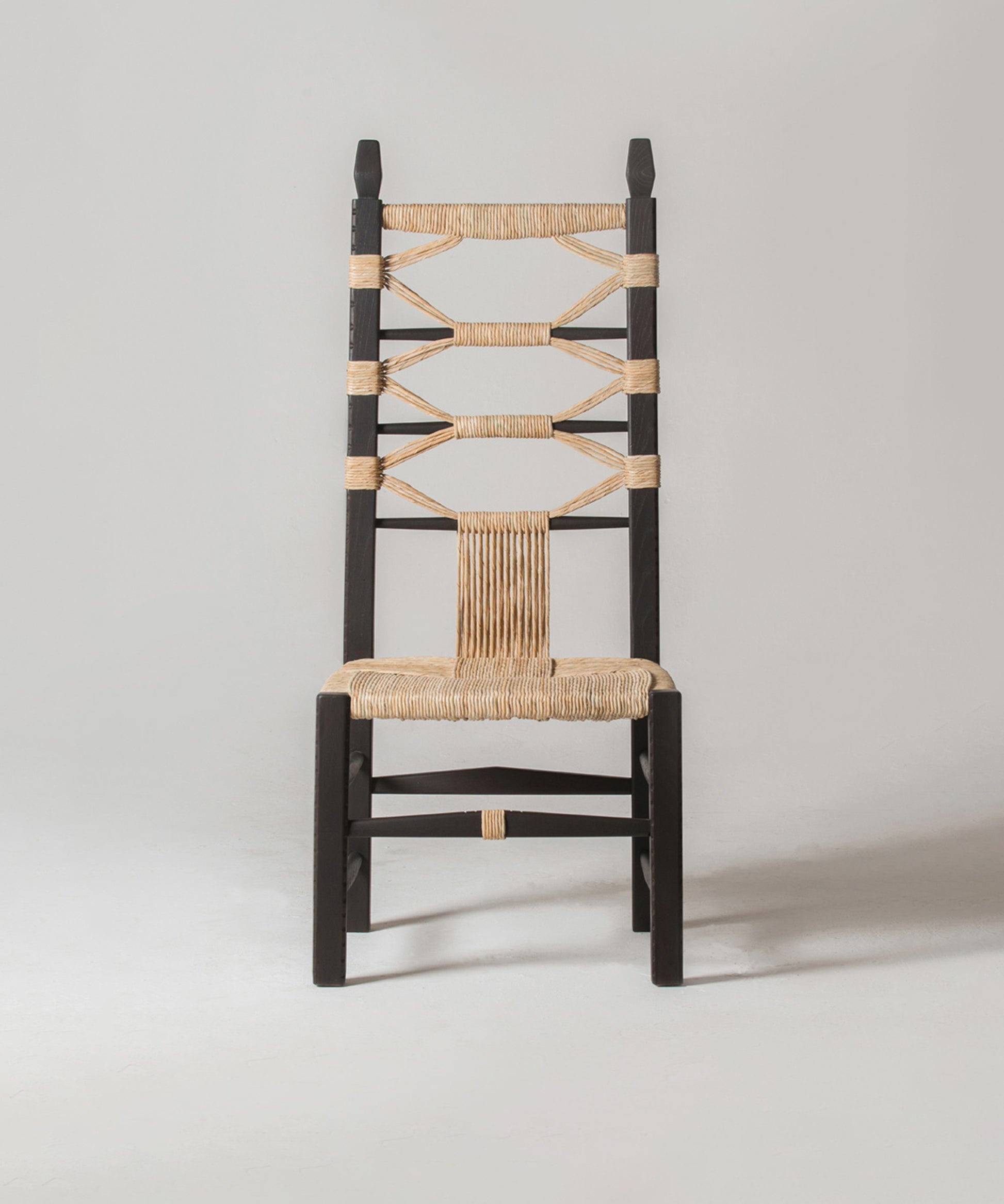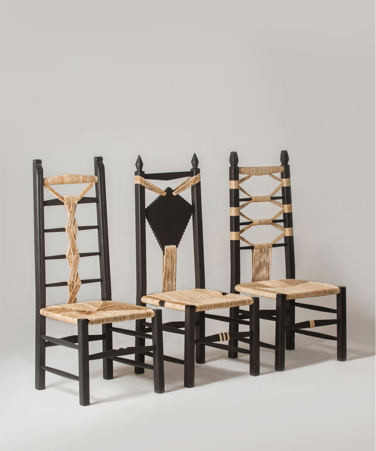 They are pulled out when visitors come over when the fire is lit, when it is time to sit in a circle and shell fava beans or crack open almonds. They come in various sizes, with older Sardinians preferring the smallest, child-sized chairs to perch on. Chiara Andreatti was inspired by the social aspect behind their use, and by the variations of design and decoration that can be found in historic versions. Her contemporary designs are enlarged versions - by maintaining the classic proportions while making them bigger overall, she has made them both important and comfortable. The decorations are directly inspired by her various experiences on the island, from visits to local weavers to handmade pasta (lorighittas) to the shapes of ancient talismans. For production, she worked with craftsman Pierpaolo Mandis. Pierpaolo is a third-generation woodworker and chairmaker from the hillside town of Mogoro who works alongside his brother-in-law. His father still goes every June to pick river reeds that will dry in the loft of their workshop before being soaked and hand-twisted to become the intricate weaving on Chiara’s chairs.
