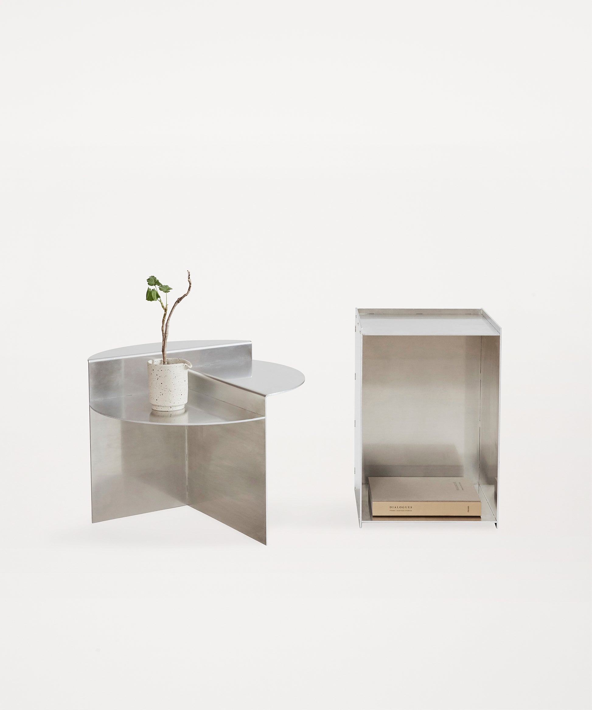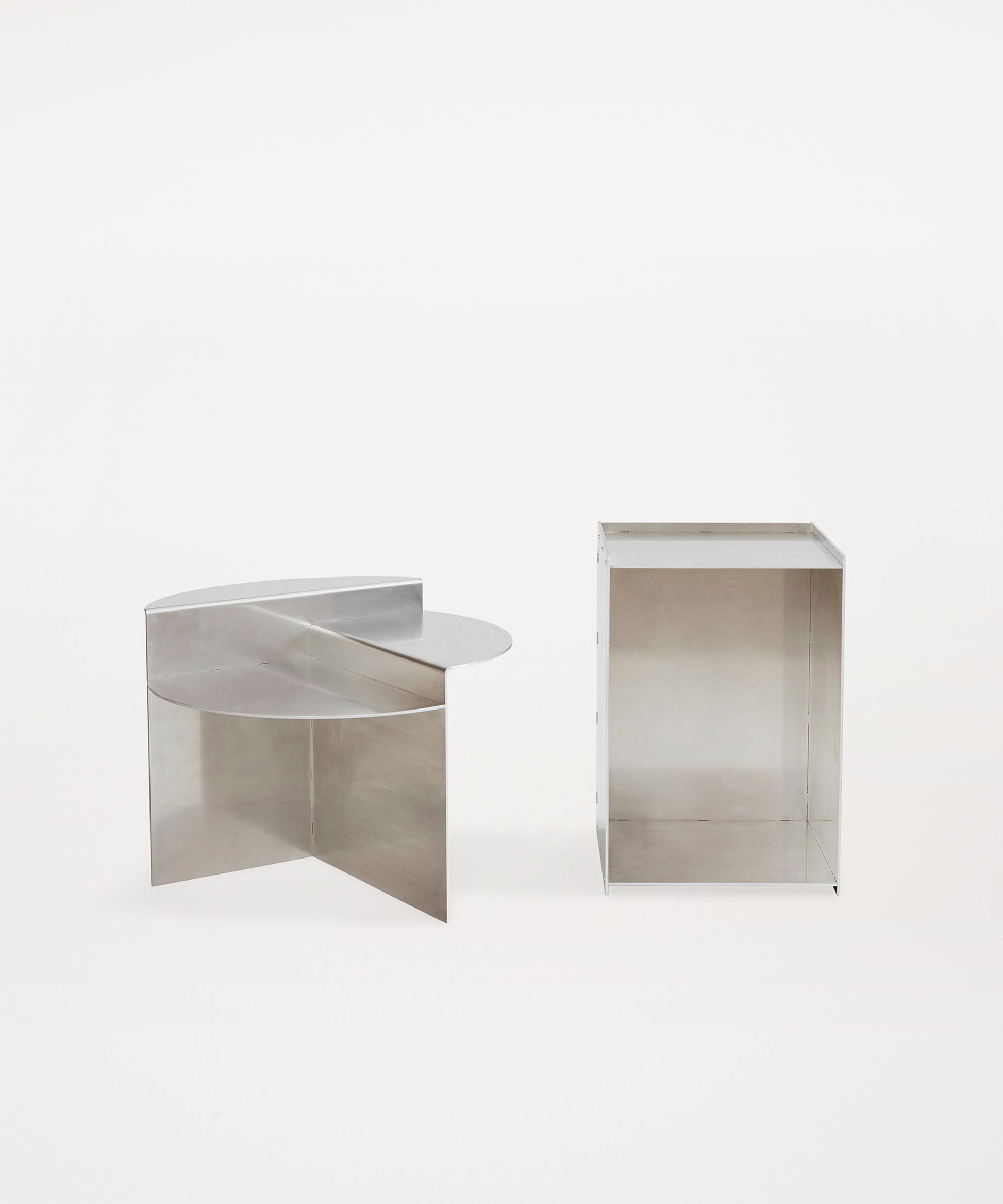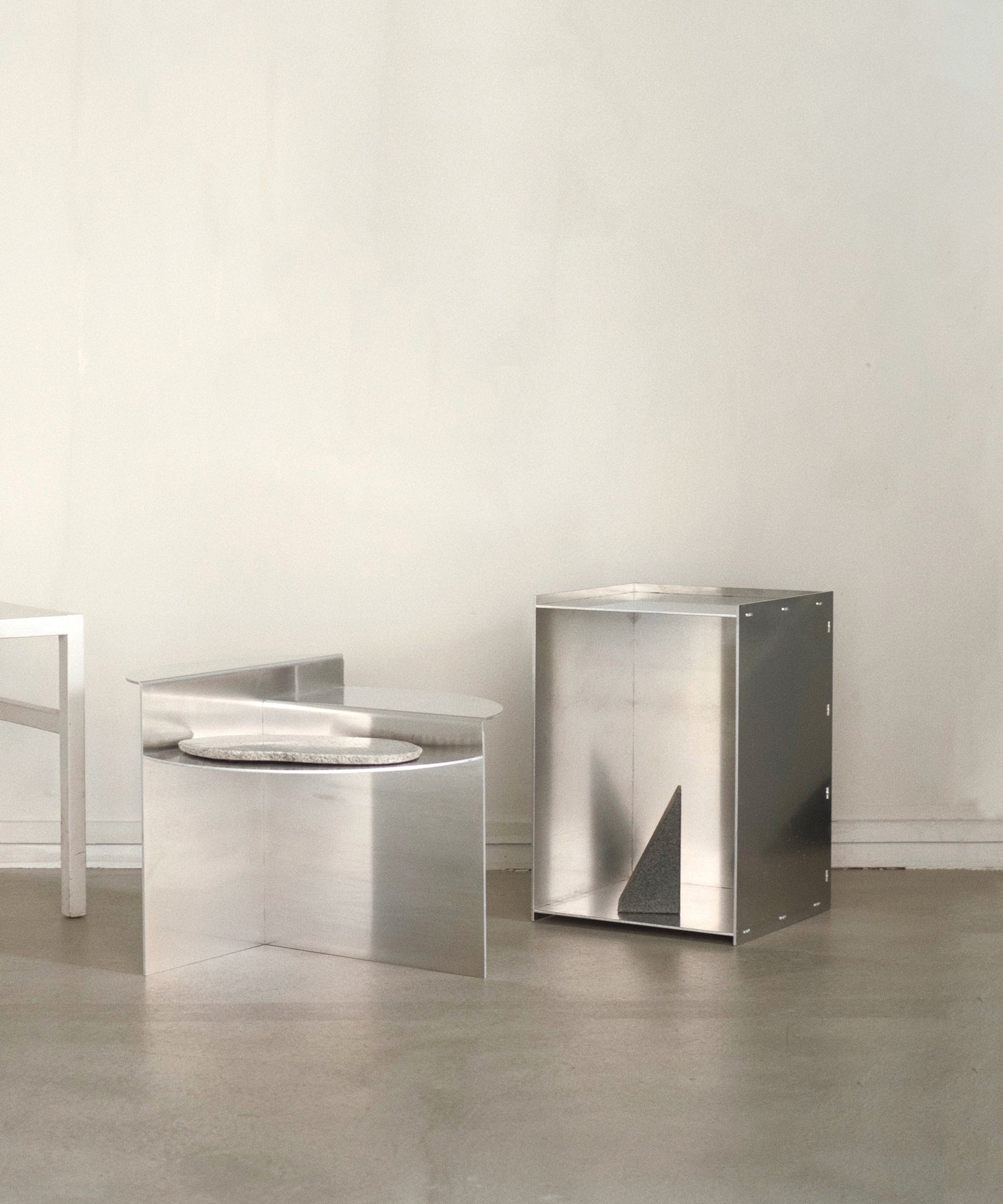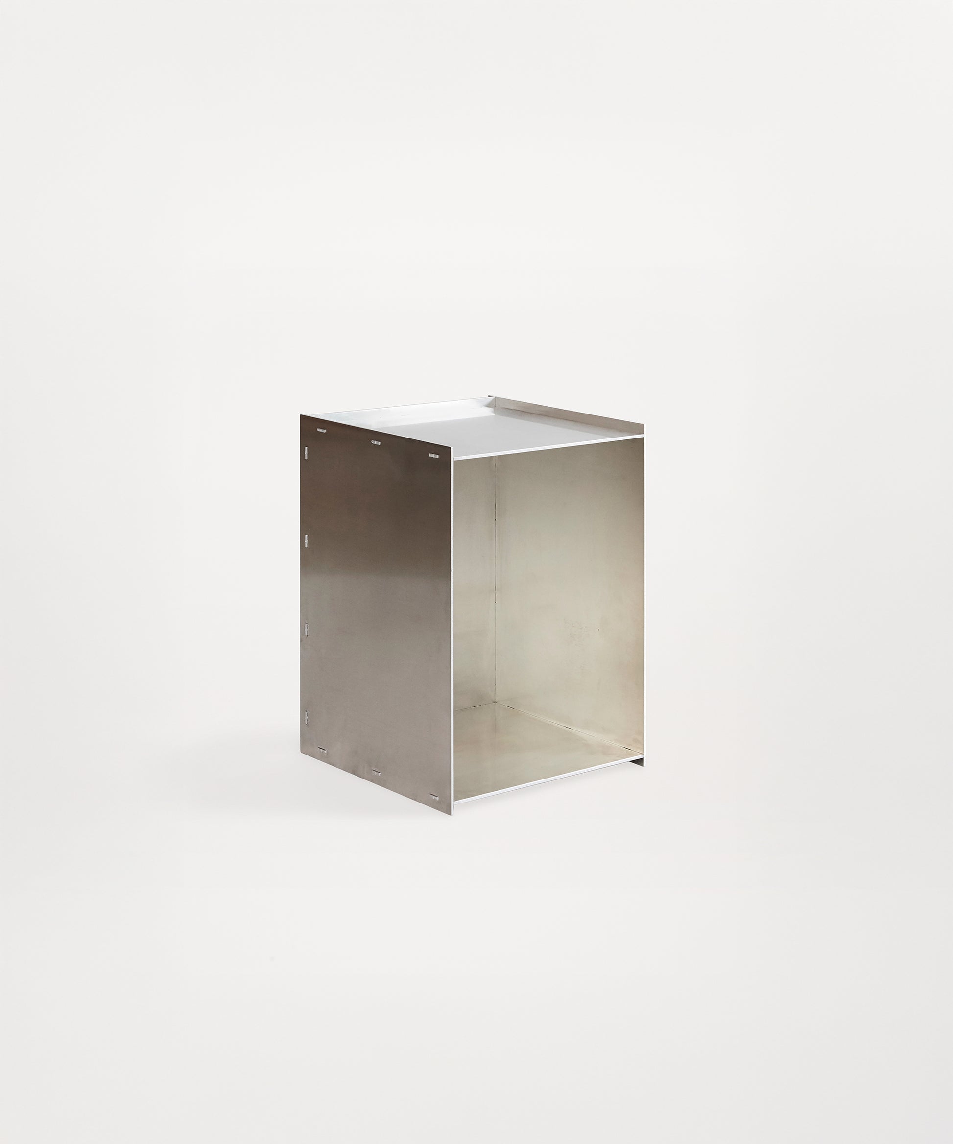 Based on a riveting technique suitable for making perpendicular joints between separate, laser-cut raw aluminum sheets, the item is put together by hand using a hammer in a cold-forming assembly process developed by designer Jonas Trampedach in 2011.