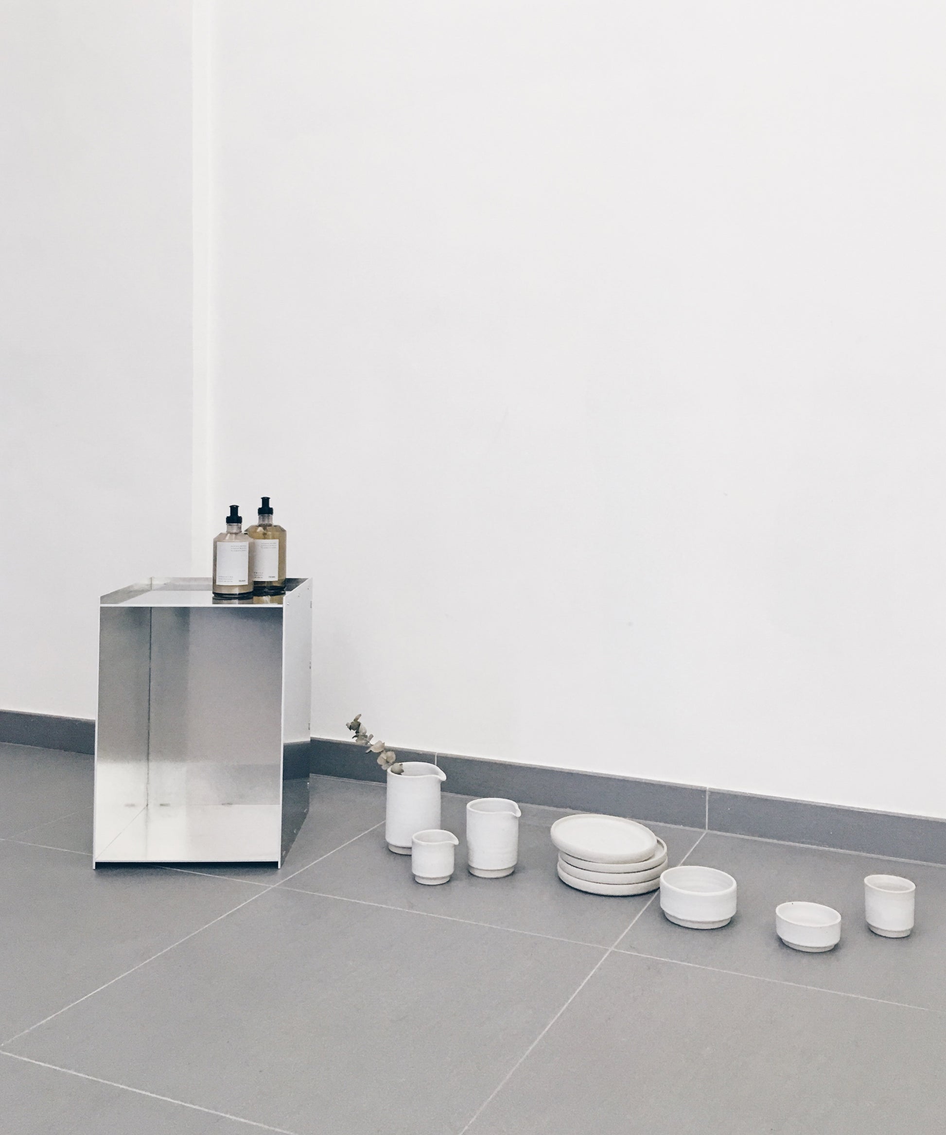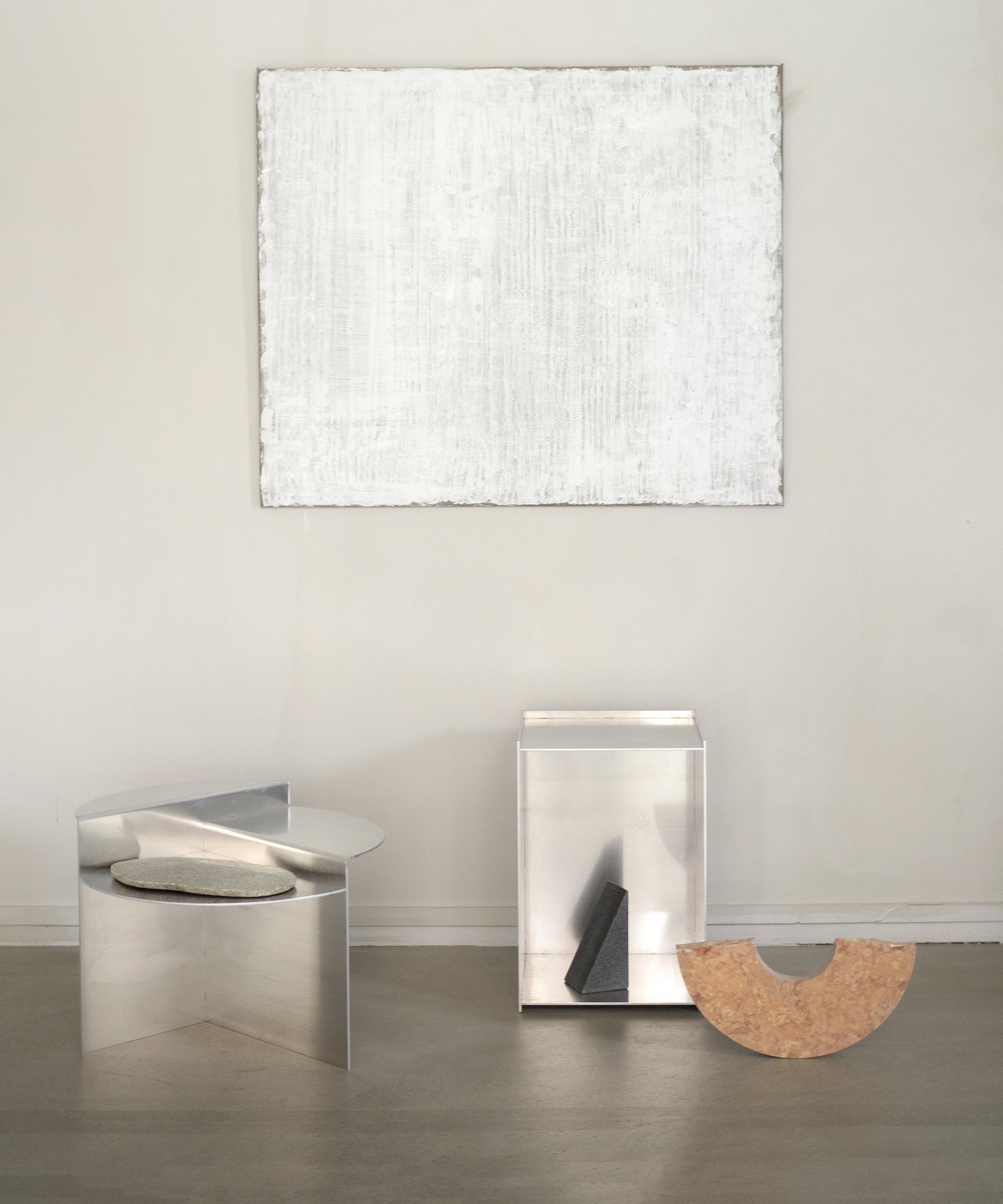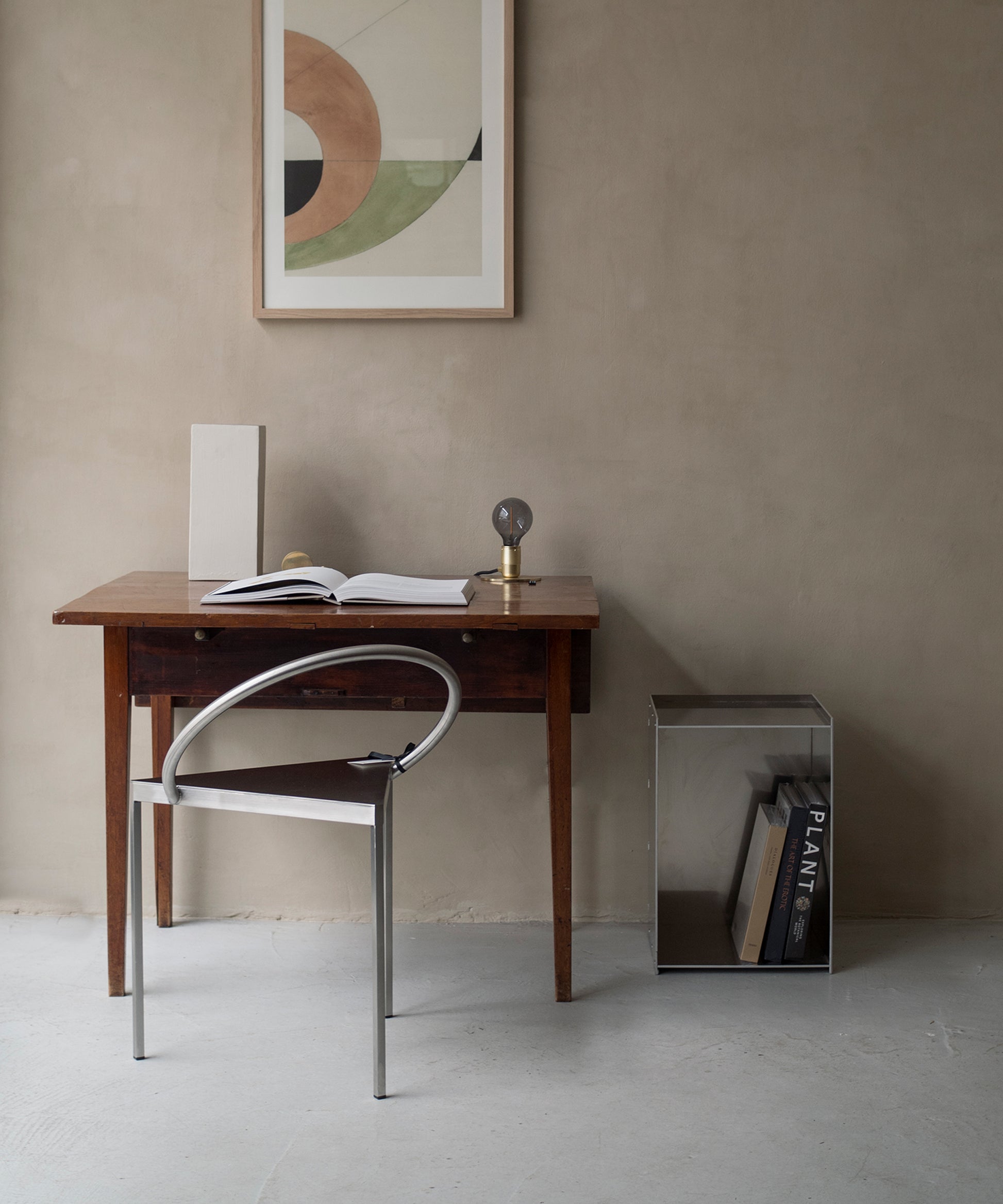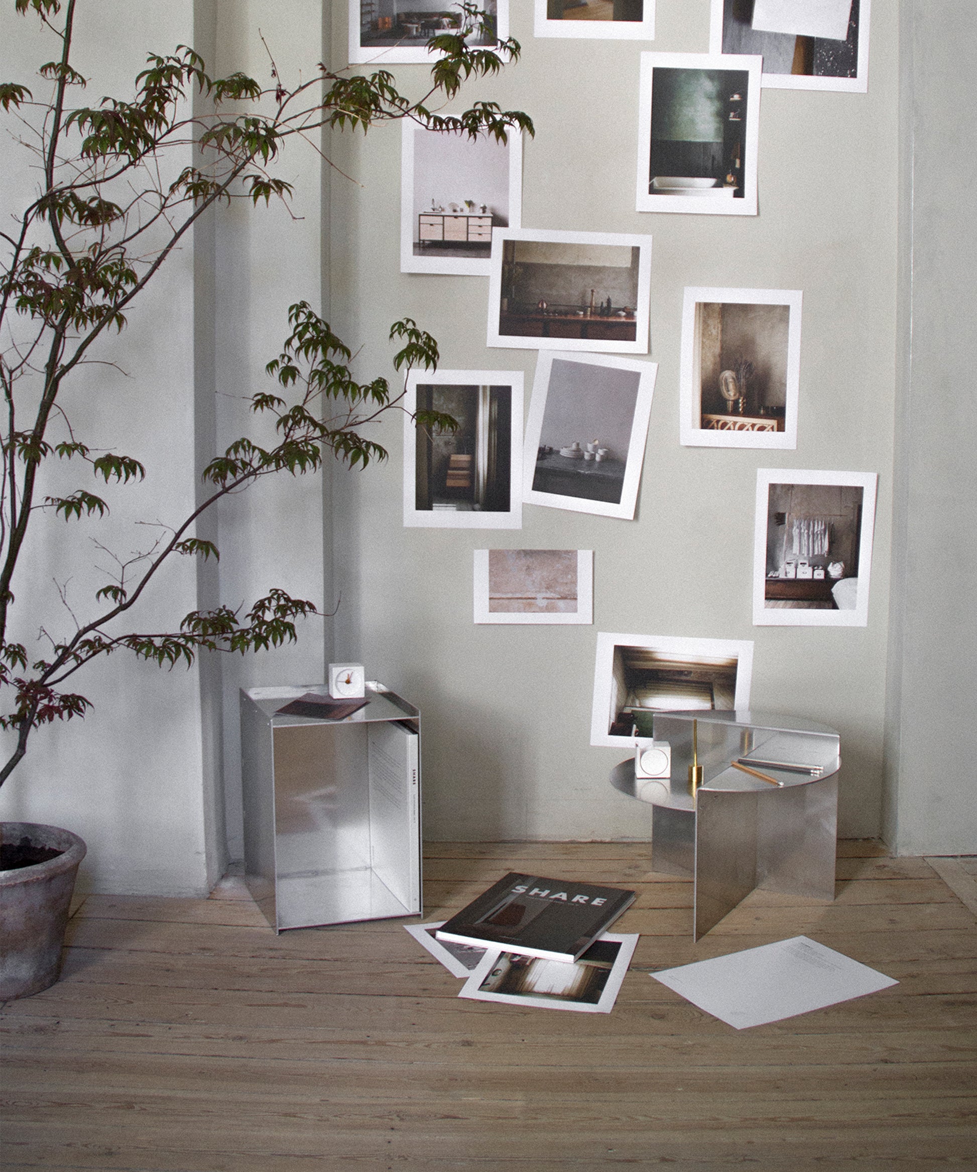 Based on a riveting technique suitable for making perpendicular joints between separate, laser-cut raw aluminum sheets, the item is put together by hand using a hammer in a cold-forming assembly process developed by designer Jonas Trampedach in 2011.