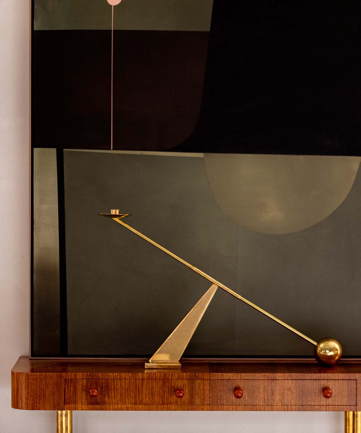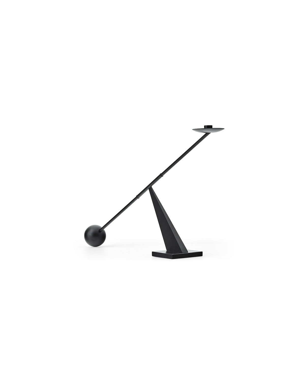 As a source of cozy candlelight, it is characterized by its deceptively simple geometric form: a sphere, an angle and a line, which unite to create a unique design. Available in polished brass or painted steel, it goes beyond its intended use to function as a sculpture.