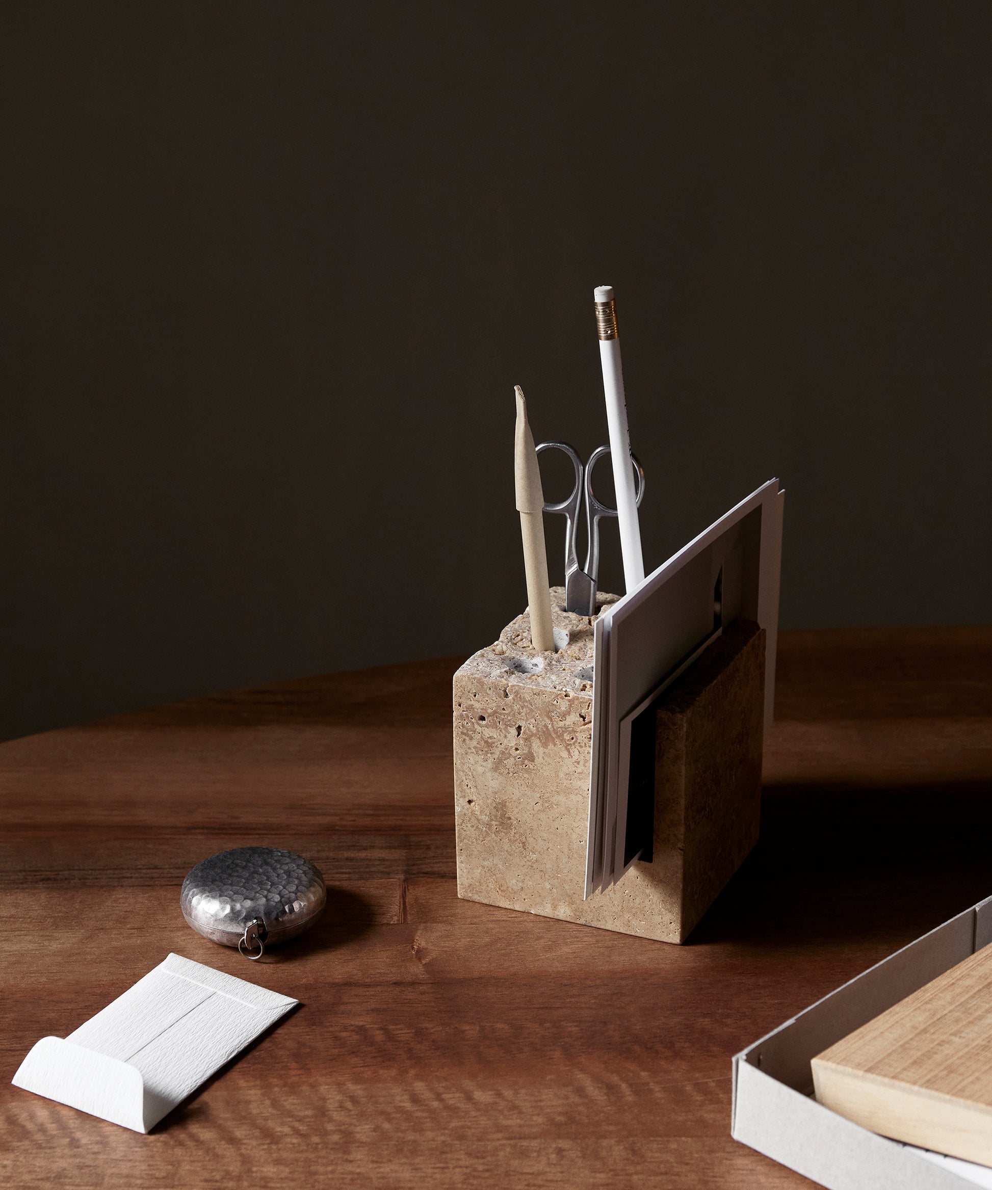 The Klint Pencil Holder is made entirely from travertine stone with a rough, unpolished surface, and is contrasted by the sharp, clean lines of its silhouette. The intriguing contrasts of the piece engage in a beautiful dialogue, creating both aesthetic and practical pencil holder that you can proudly display on your desk, rather than hiding it away in a drawer.