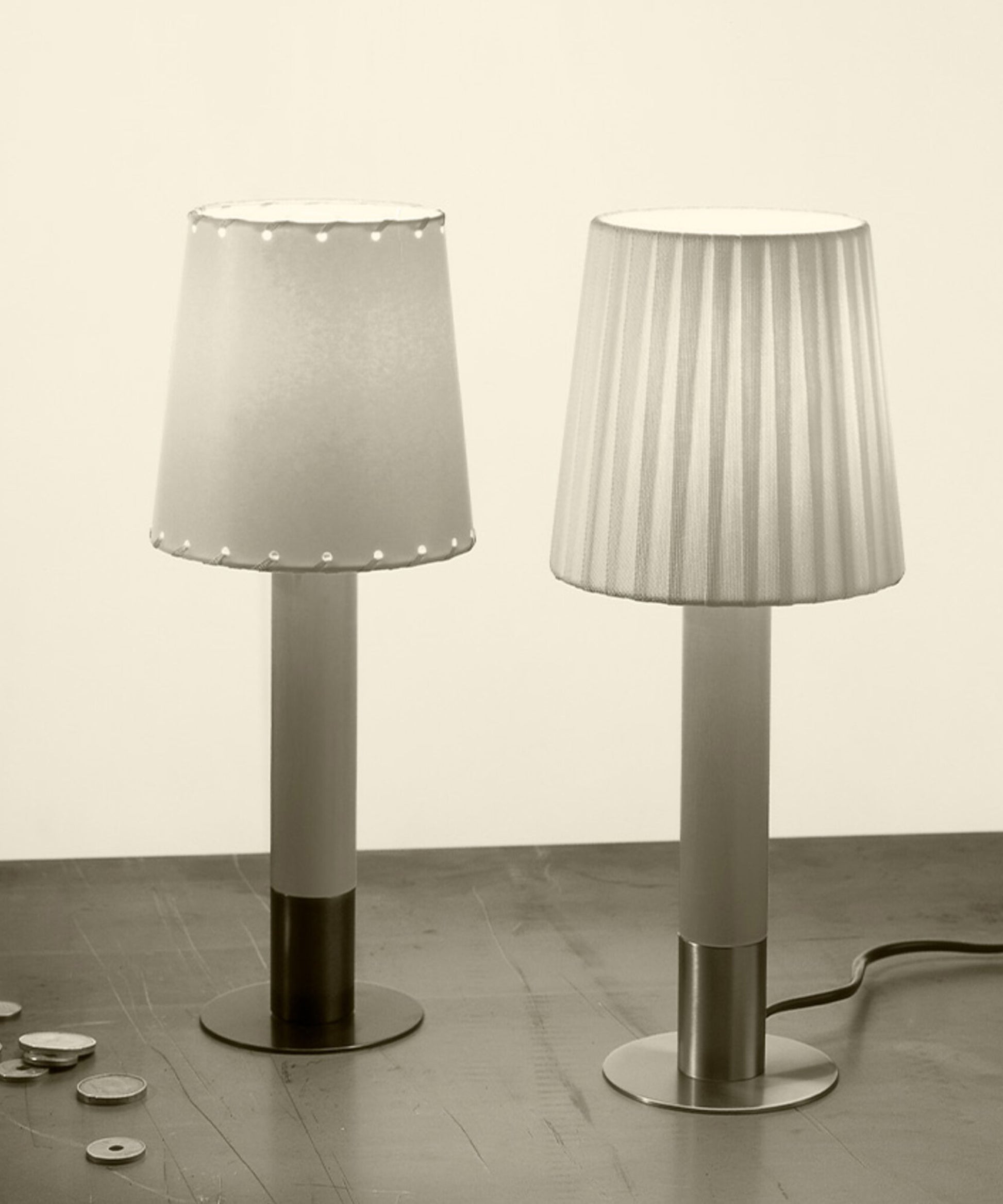 The Mïnima features a small metal base, as inconspicuous as a whisper, that ensures this miniature will never fall off balance. Two unique versions of the shade and finish are available.