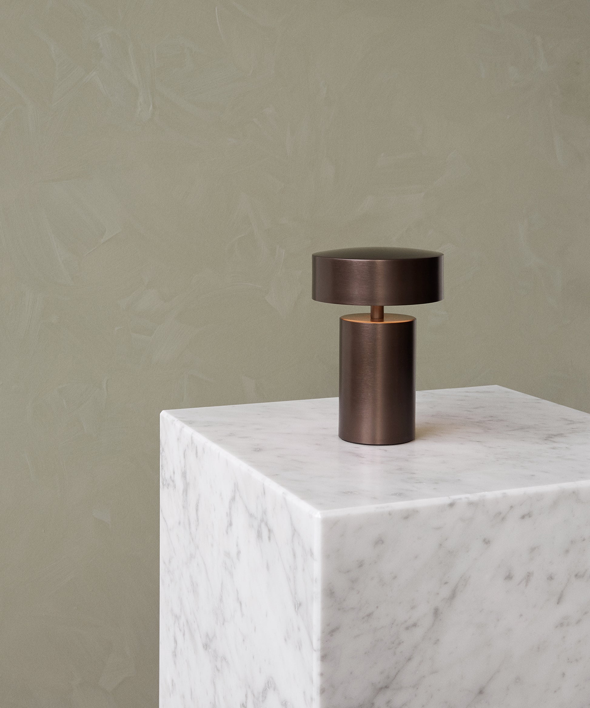 Featuring a simple, mushroom-shaped design and a bronze finish, the Column Table Lamp makes an understated addition to any living room, bedroom, office or dining area. The lamp can function wirelessly and recharges using a USB cord. The LED bulb emits a soft, diffused light in three different settings - something for every mood.