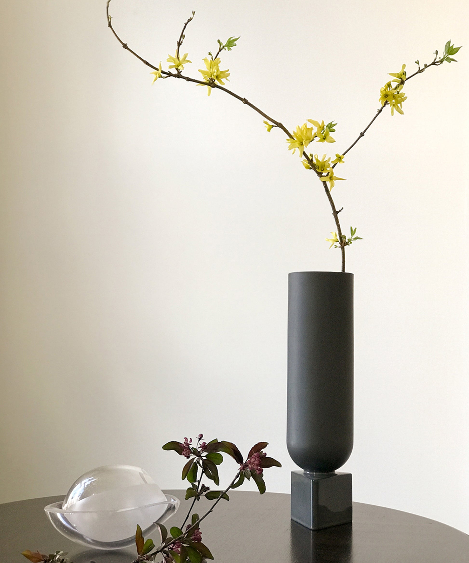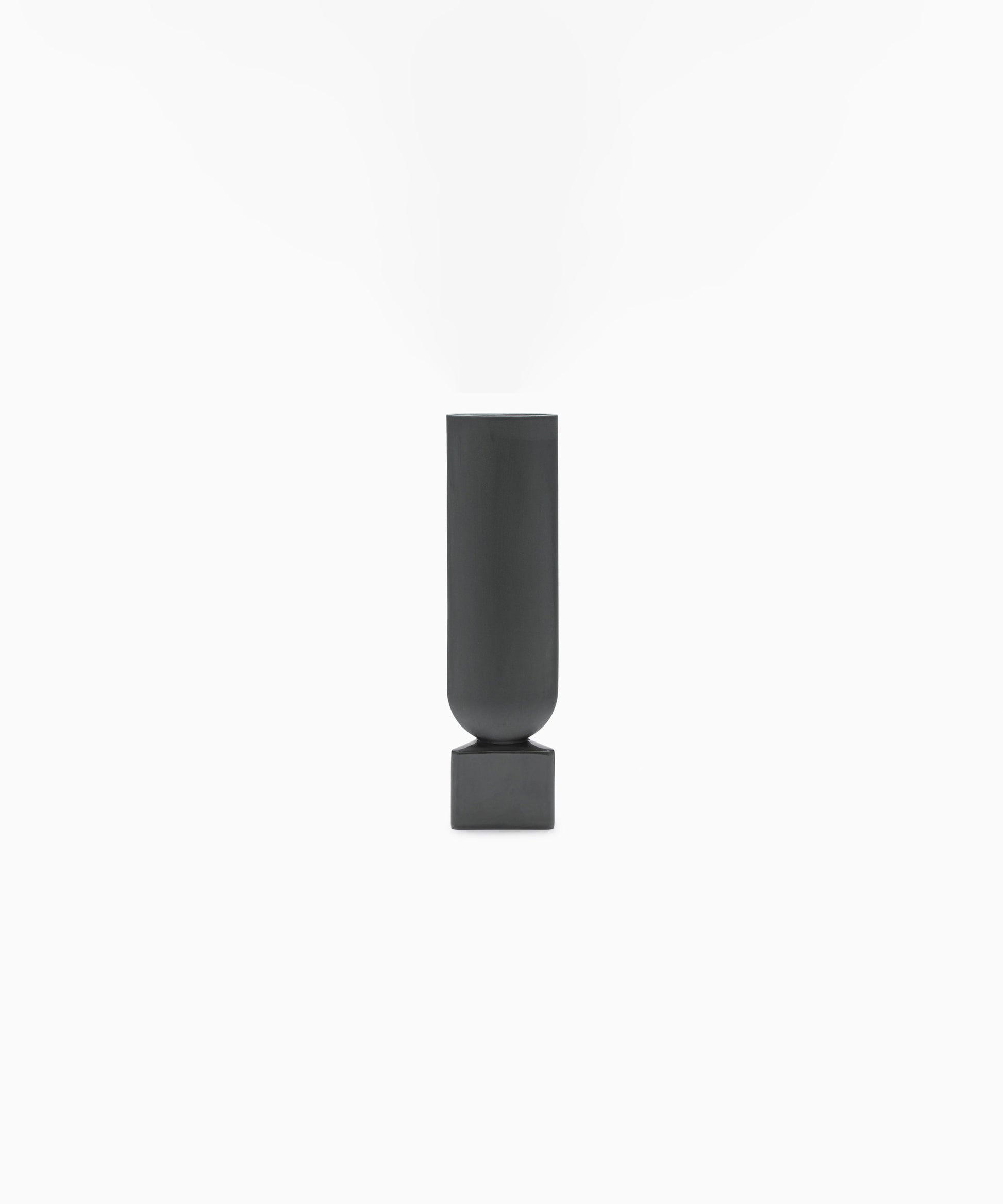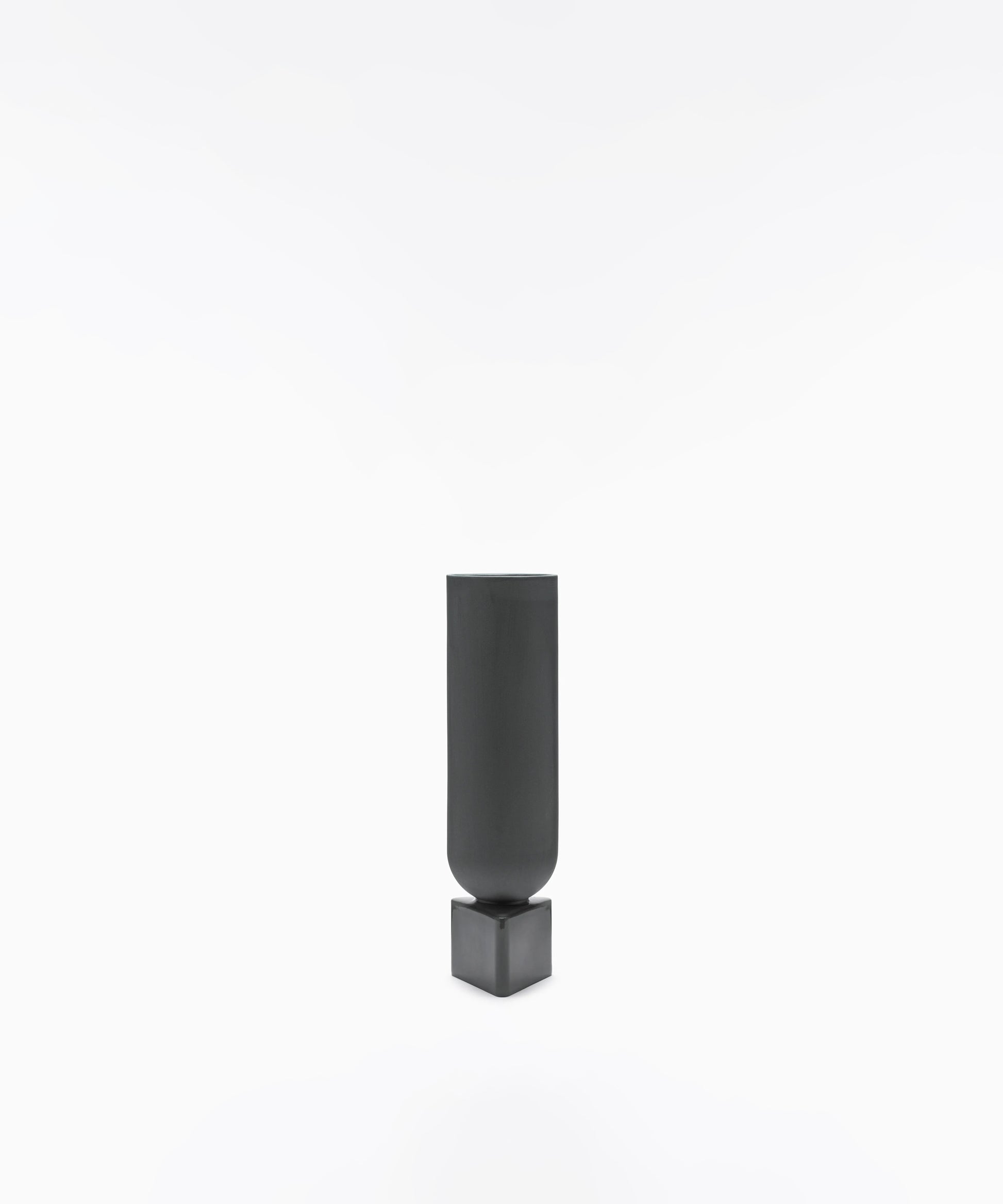 A matte cylinder sits atop a glossy triangular pedestal to form this beautifully sculptural floral vase.
