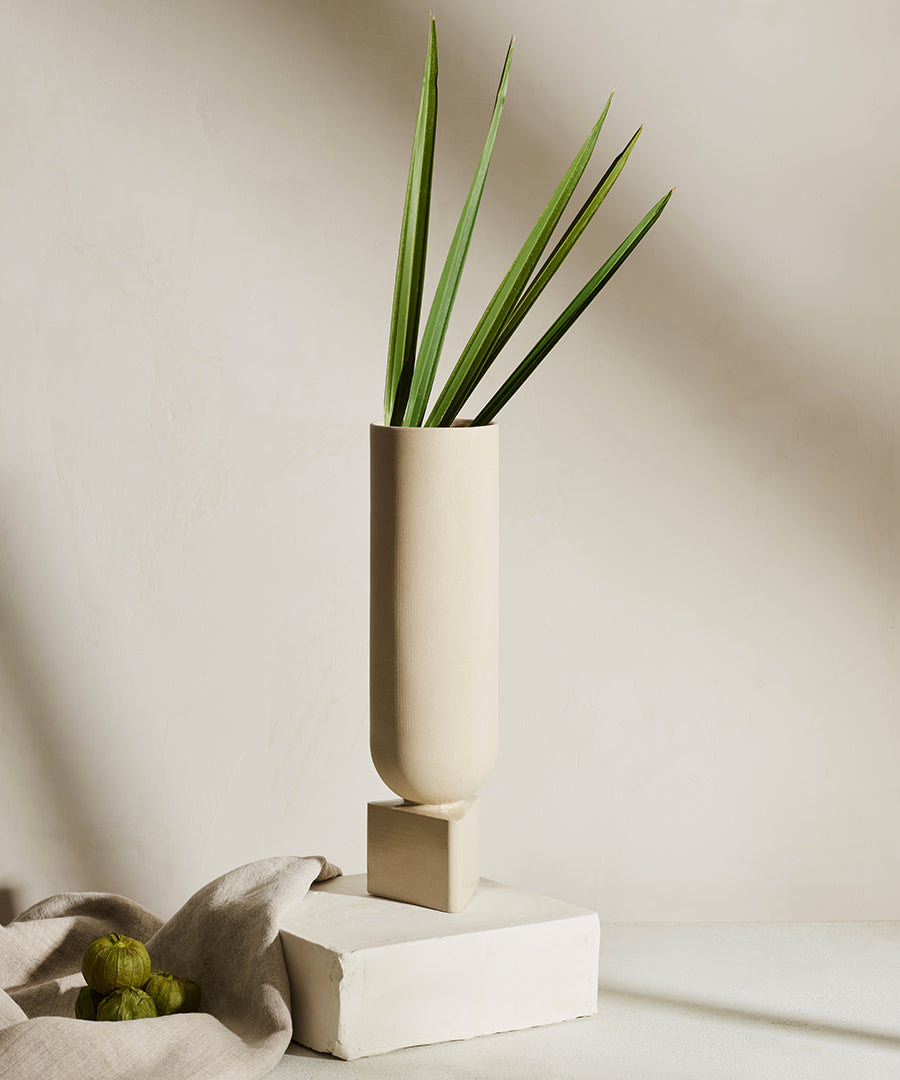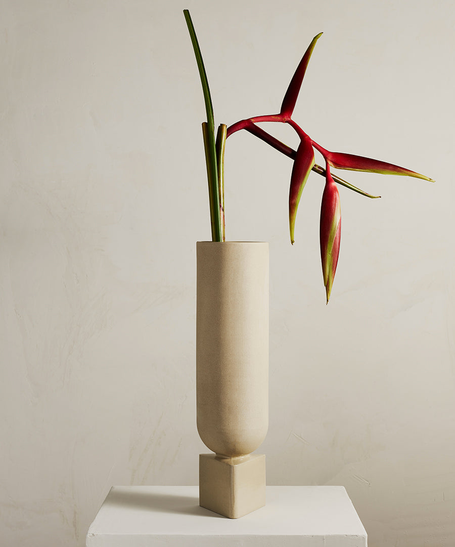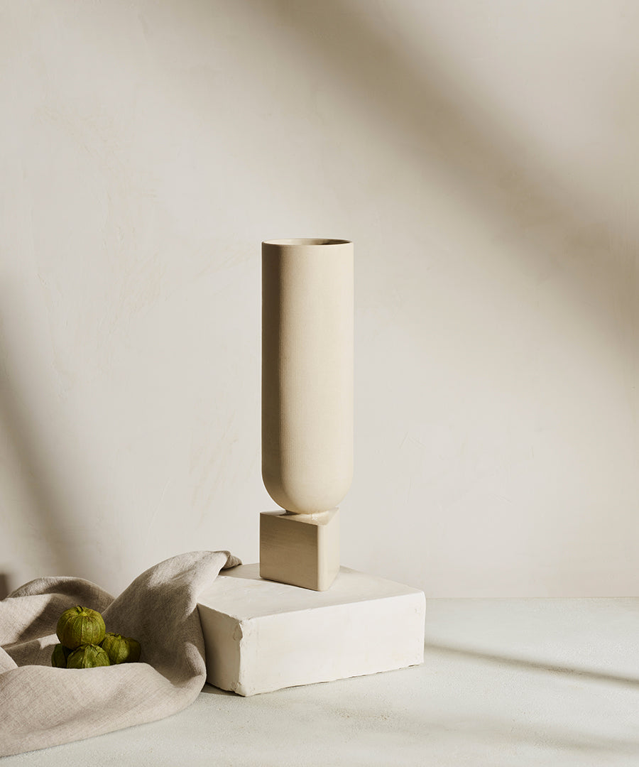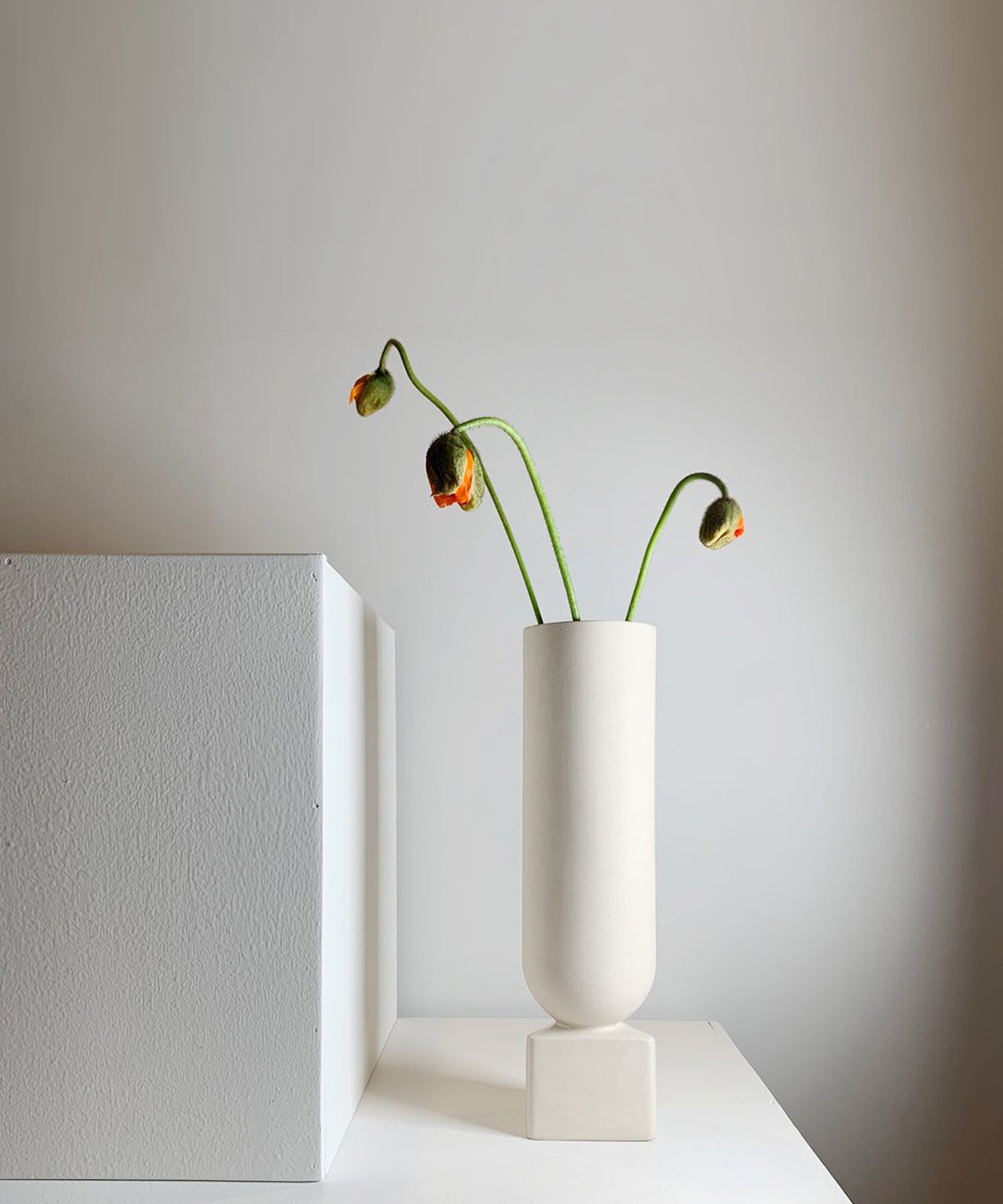 Made from stoneware, the Tava Vase is available in three colors - snowy white, sand and hematite. The interior is finished with clear glaze.
