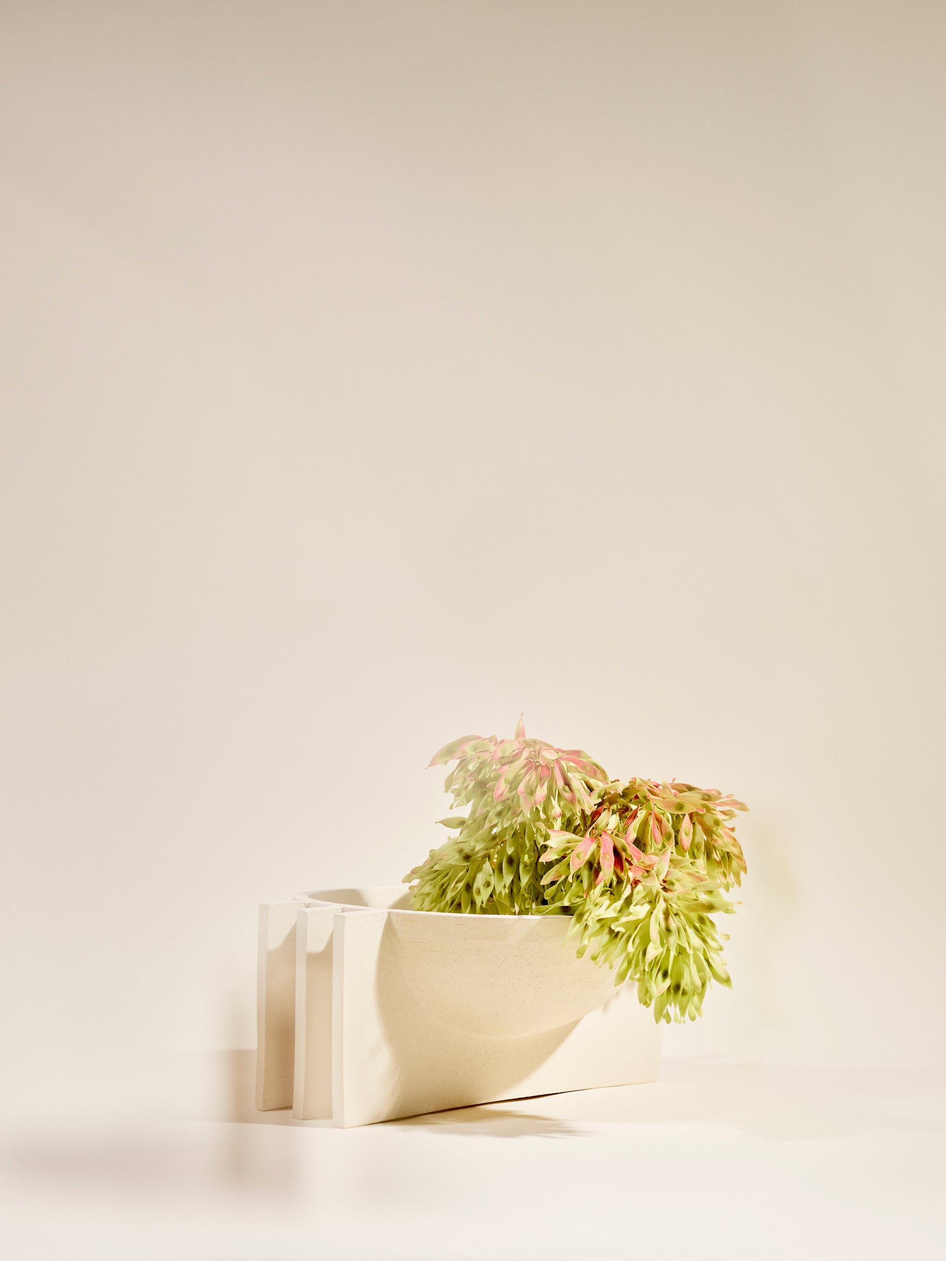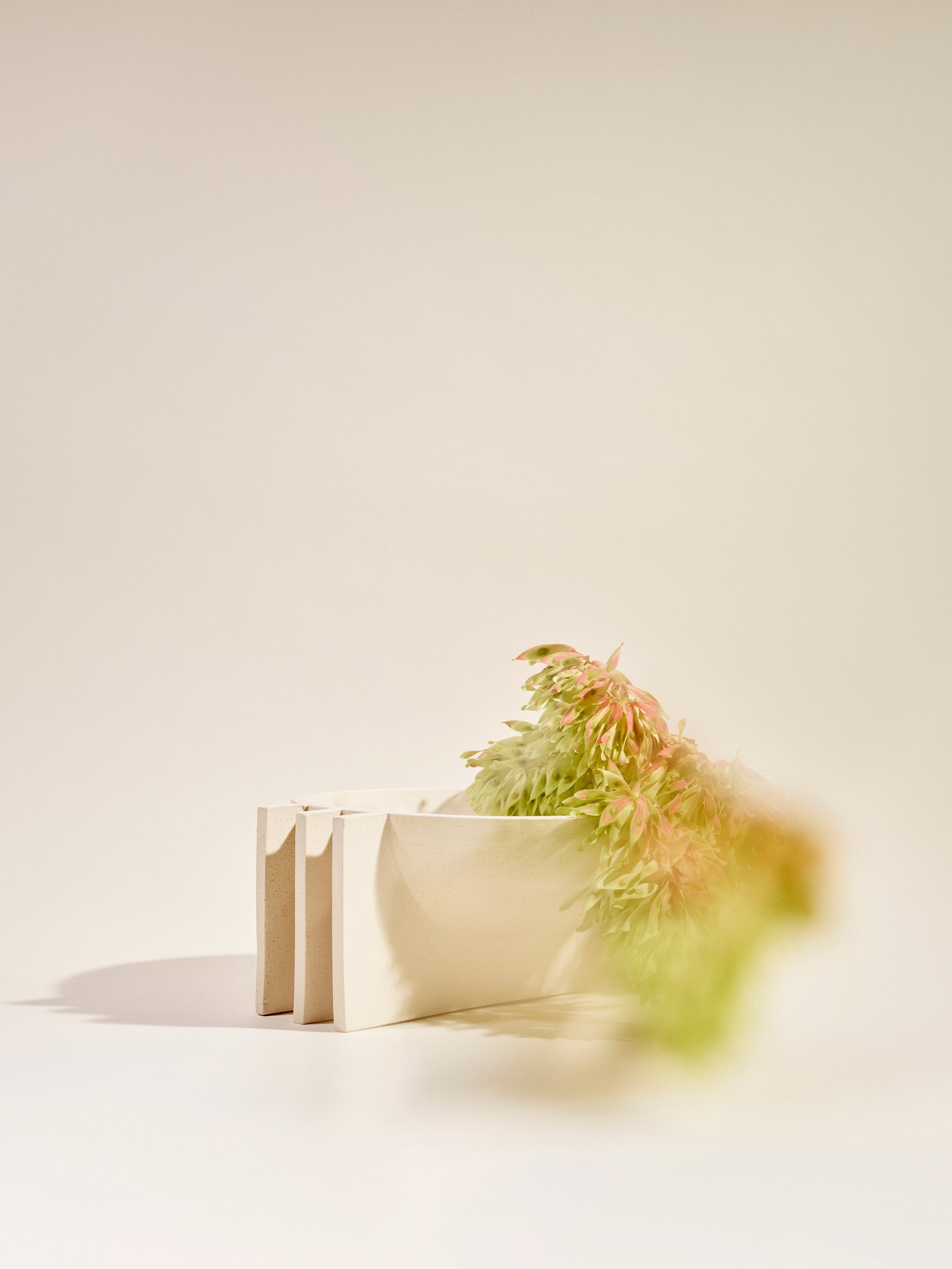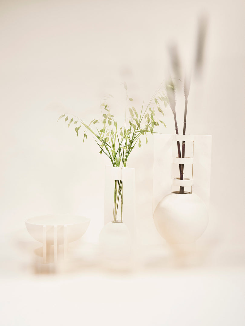 Through removing the expected and leaving the essential. Farrah created a range of neckless vases. Stately and vaguely reminiscent of satellites, these vases embrace negative space, offering framed views of the flora within. A multi-finned bowl and table light, evocative of industrial cooling parts complete this otherworldly assortment.