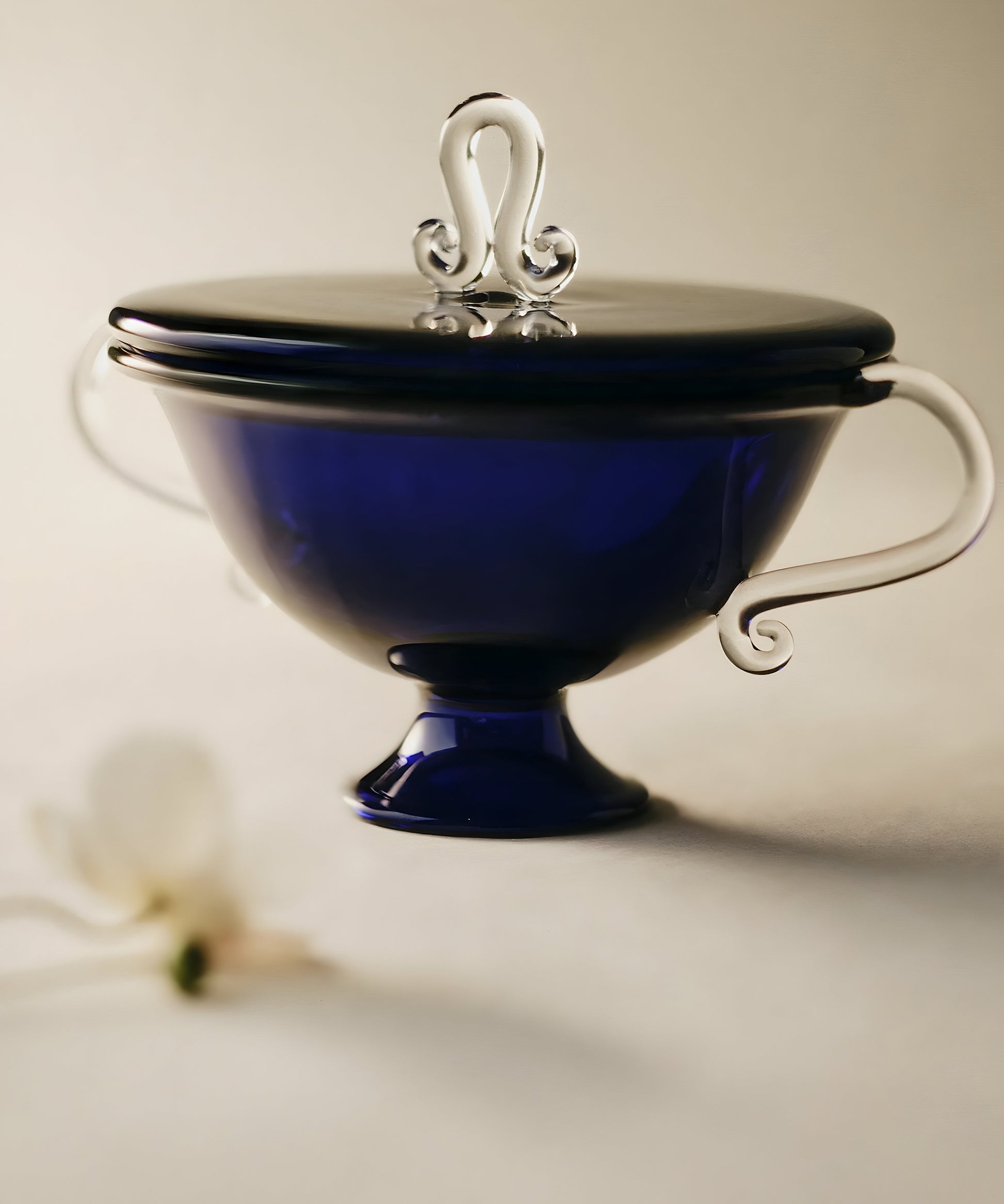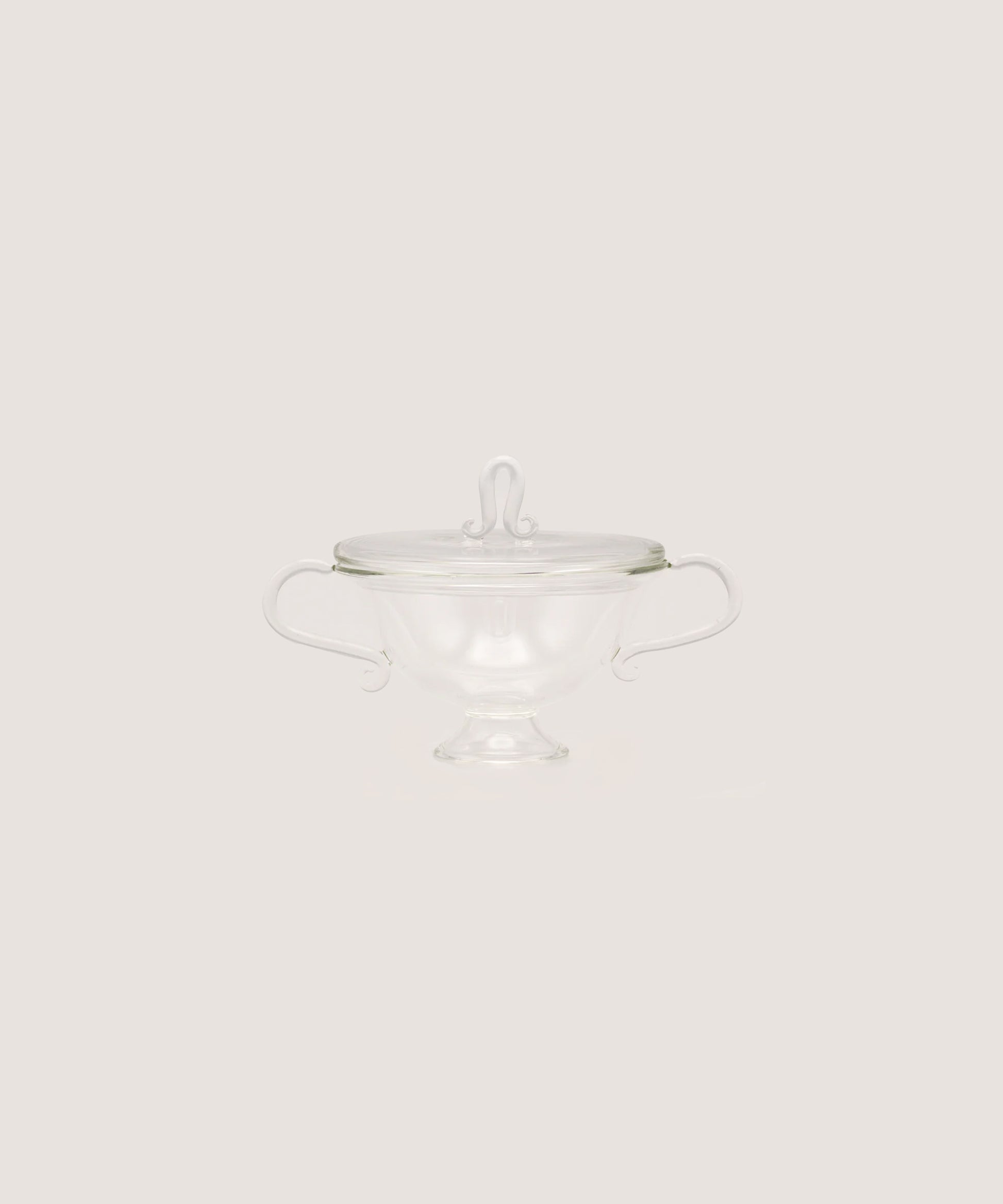 A jar for jam, chutney or sweets, this petit vessel features two delicate yet durable handles and a ribbon of glass at the center of its lid.