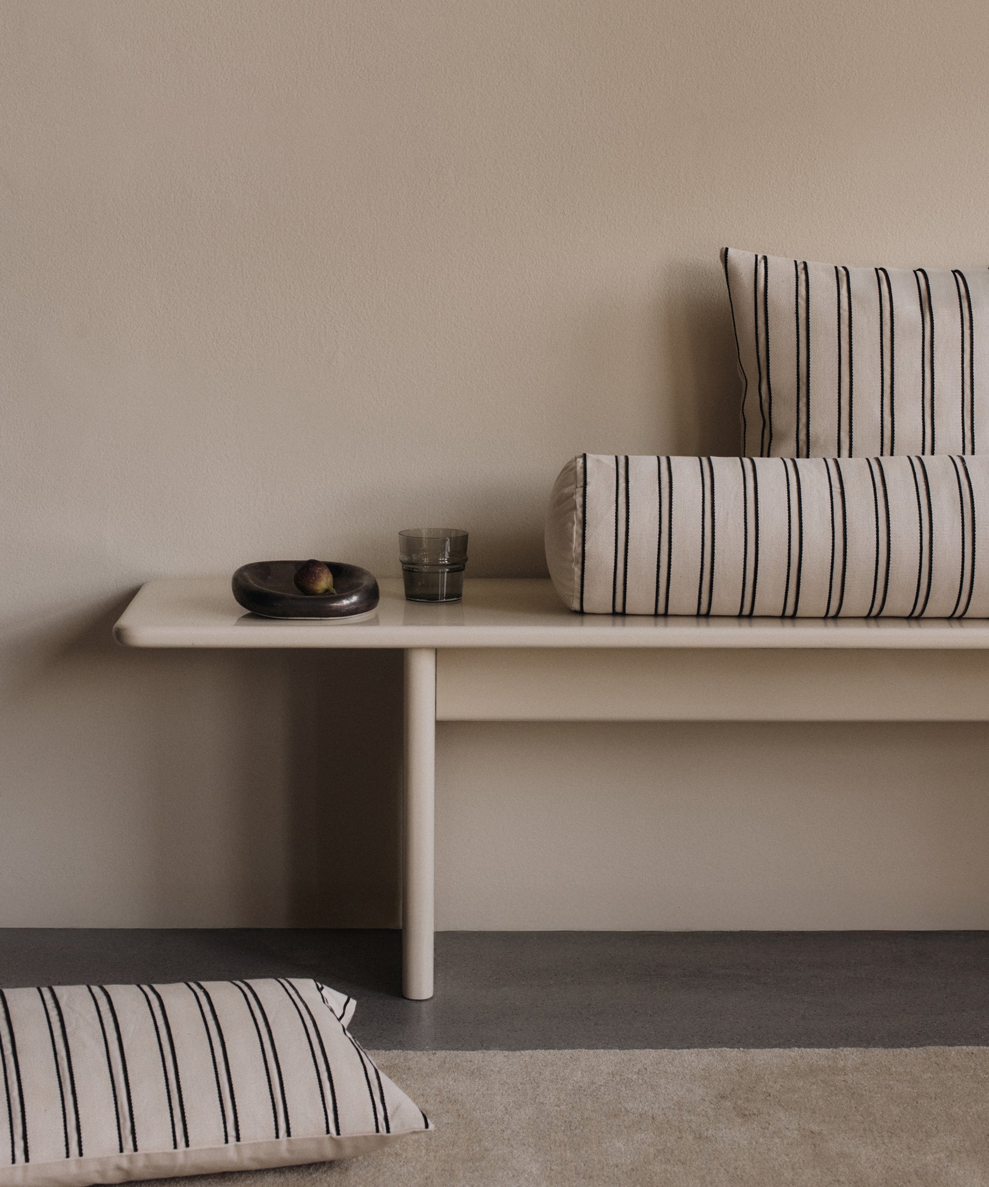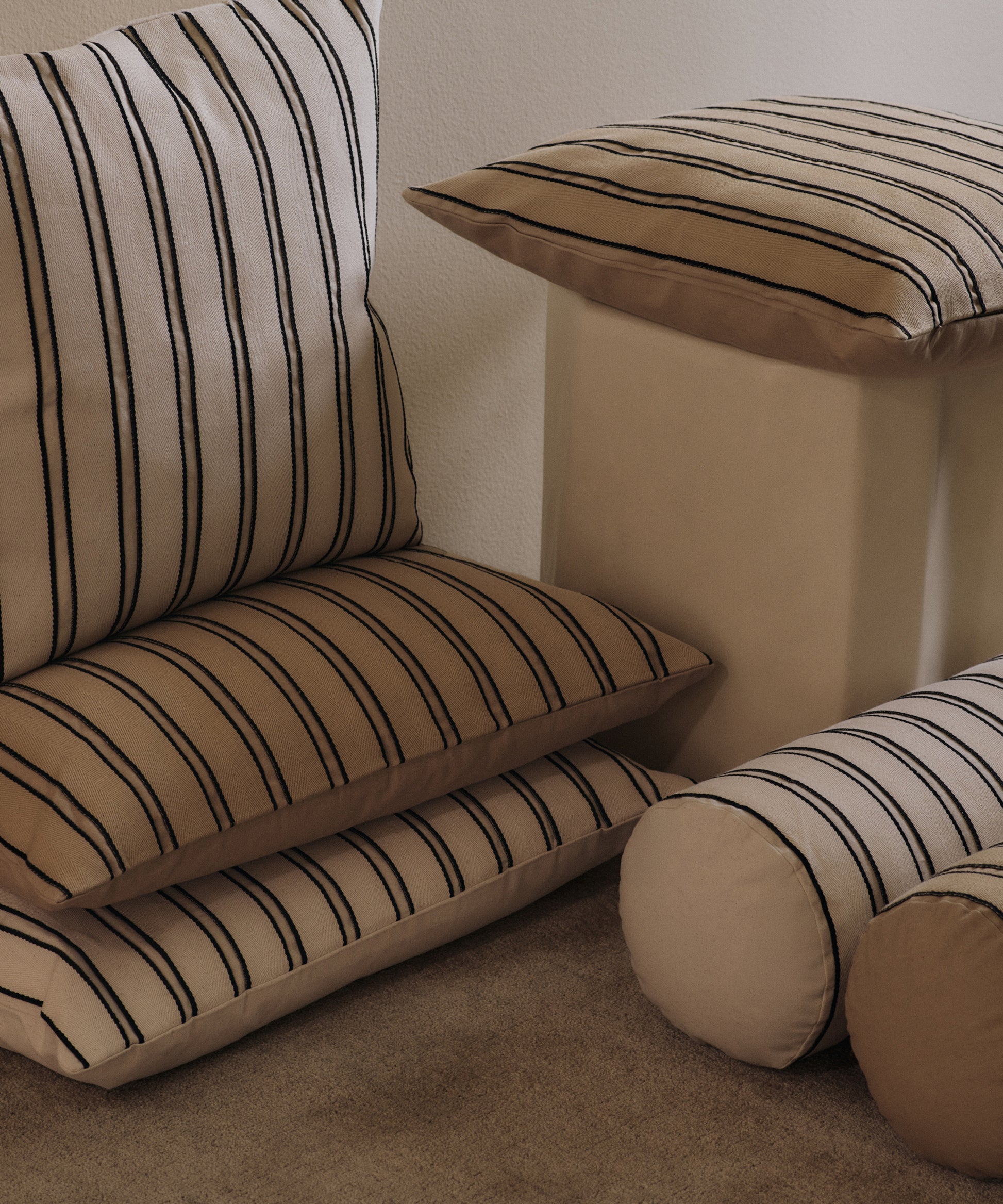 The Twill Bolster Cushion is made from GOTS-certified organic cotton and showcases a series of cotton tapes with a twill weave and woven edging.