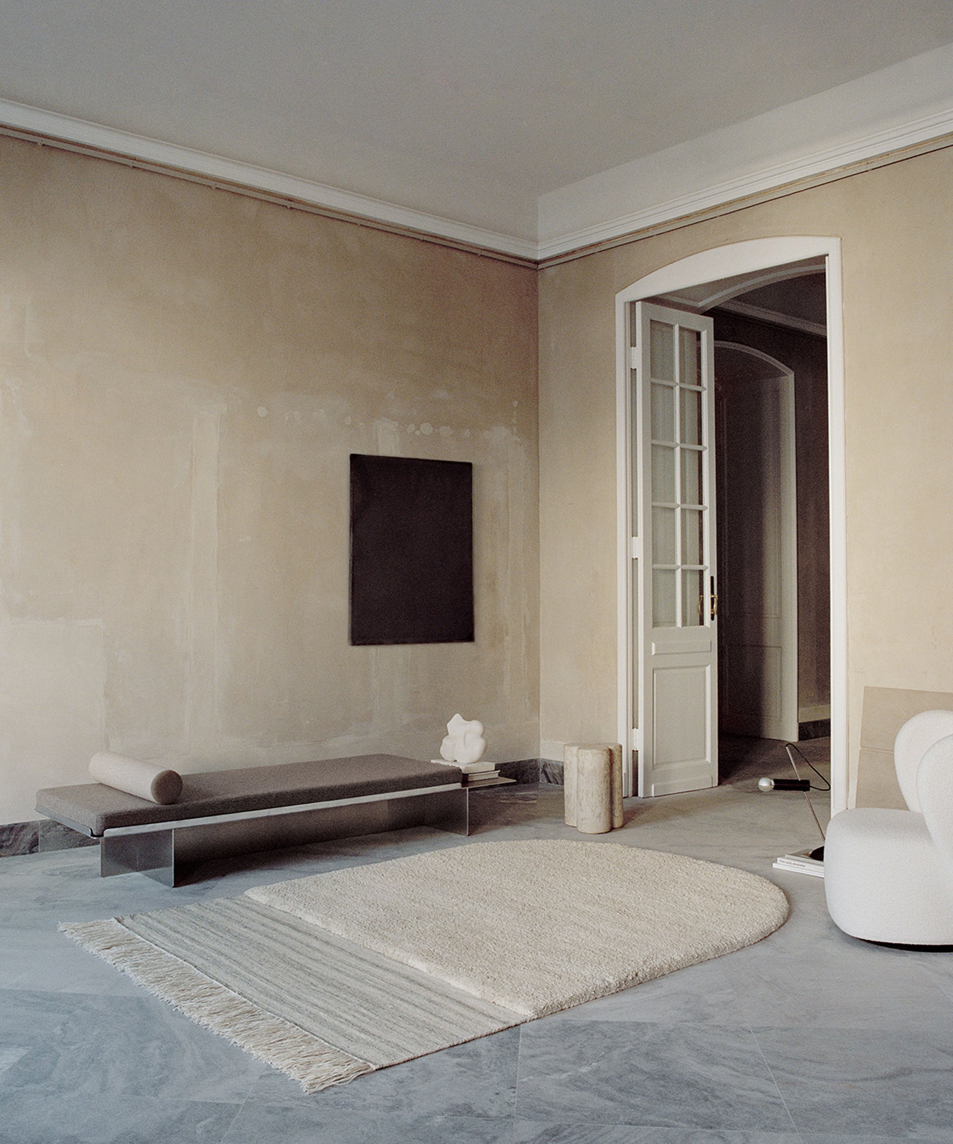 Eternal Eye combines a uniquely rounded shape with textural contrasts to create a characterful rug that appeals to all the senses. The neutral color palette ensures the focus remains on the structure, as it shifts from thick and sumptuous pile to flat-woven, before finishing with generous fringing at the end. Made in a combination of soft RWS wool and GOTS-certified cotton warp-both materials selected for their eco-friendly qualities, durability, and natural rustic beauty. Hand-crafted by Linie Design’s artisan weavers and designed by Urd Moll Gundermann, Eternal Eye is part of the Apertus Collection that focuses on structure and sustainability to create stunning, responsibly produced rugs that feature the Care & Fair label.