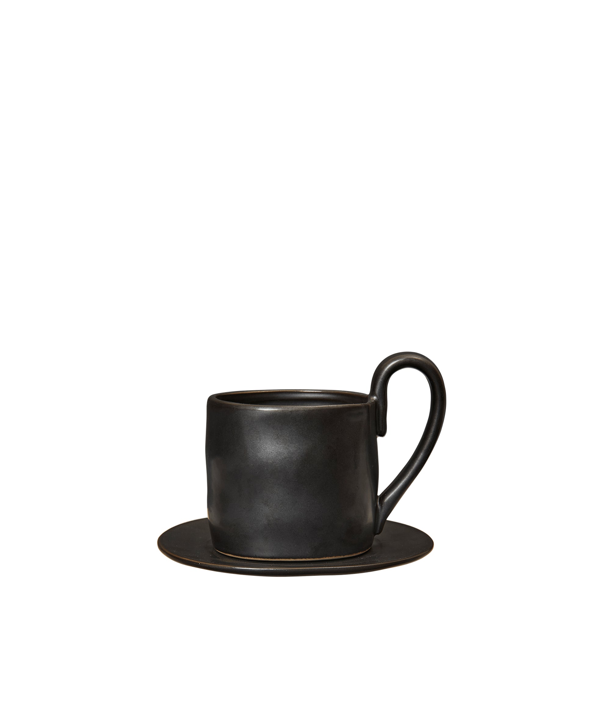 Made from stoneware with a semi-matte glaze, it features a gently rounded silhouette and a curved handle that adds a playful touch. The saucer adds a practical and elegant detail, ideal for serving with a biscuit.