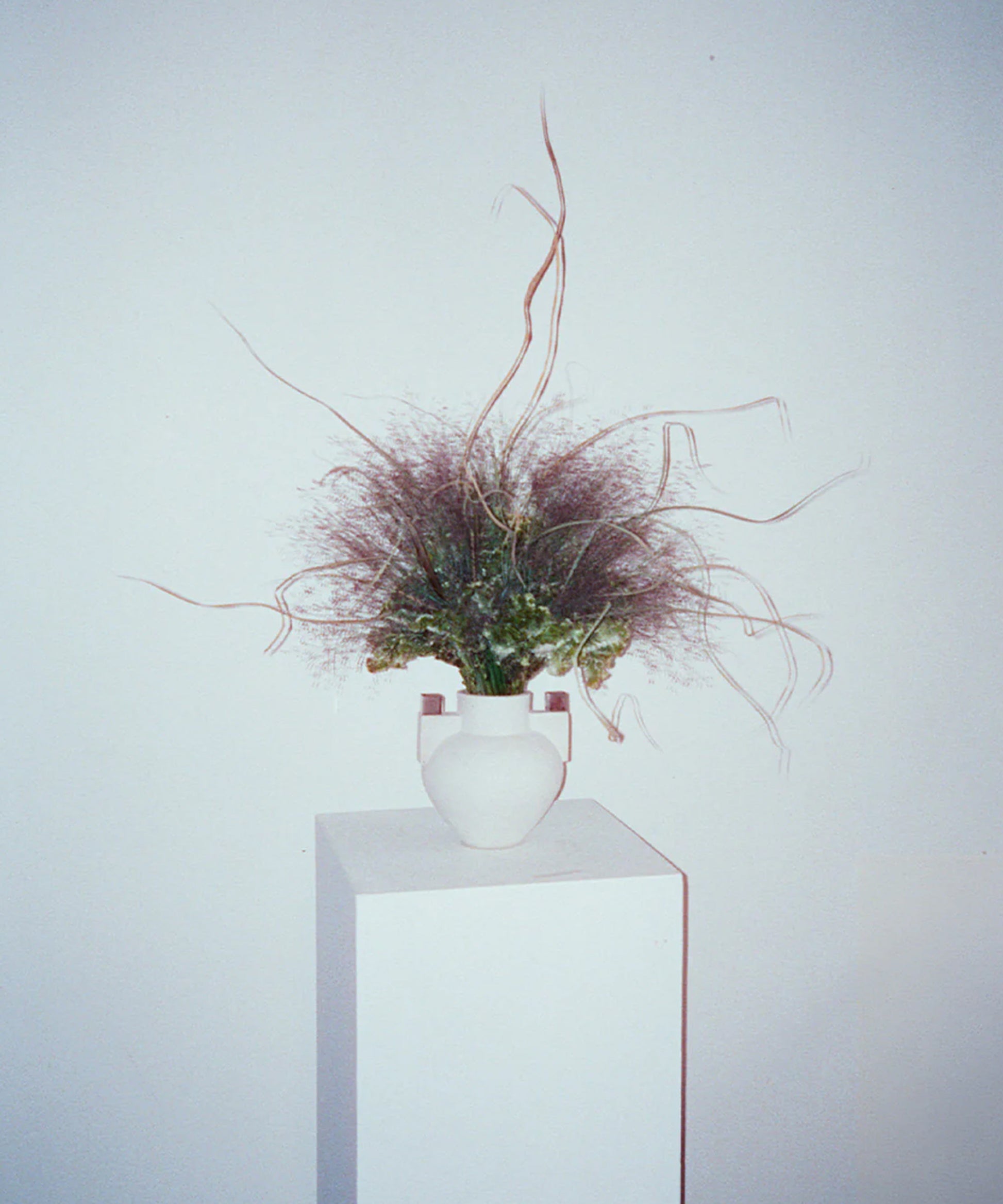 • Brooklyn-crafted sculptural ceramic vessel with metal accents, echoing Grecian forms.