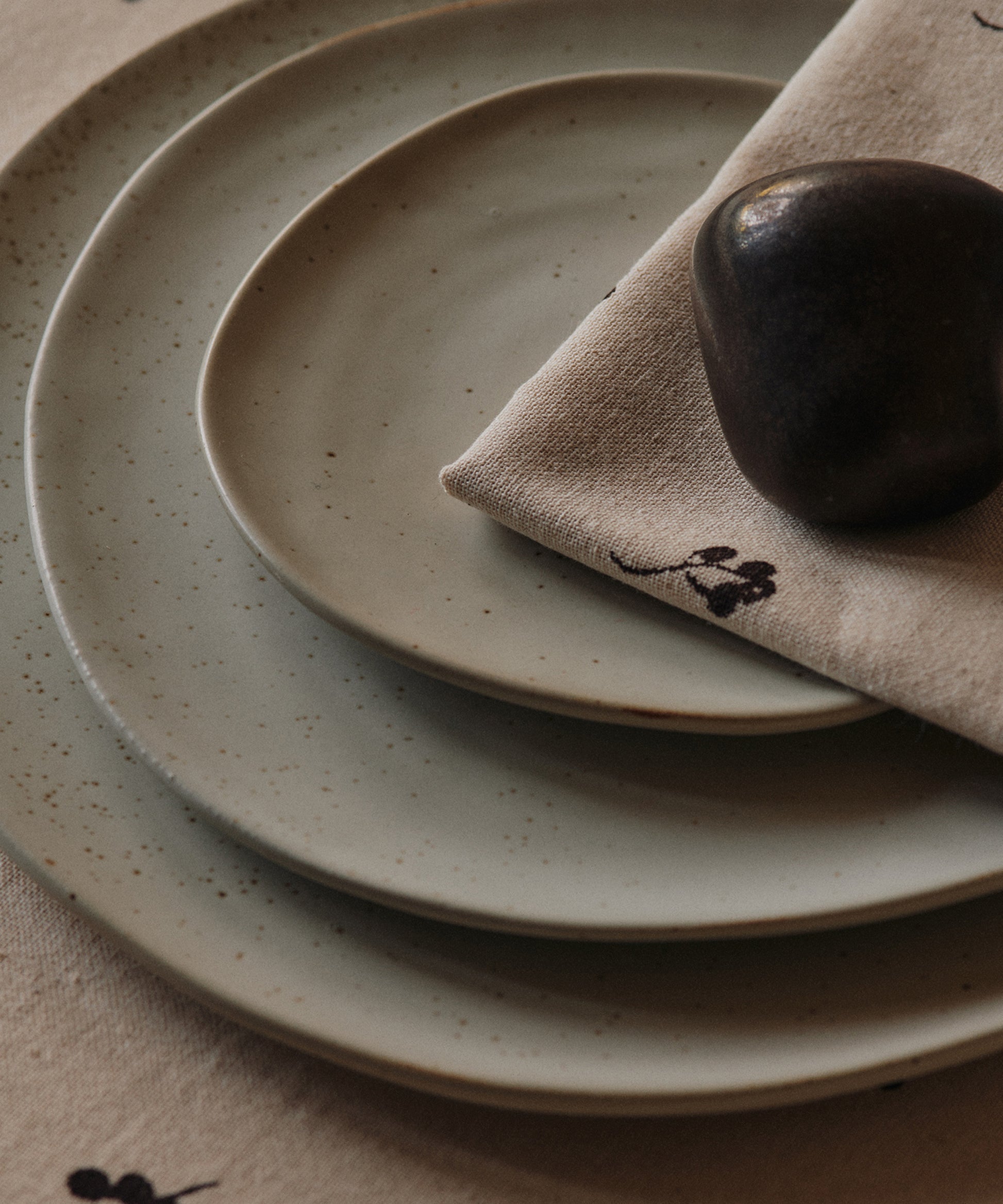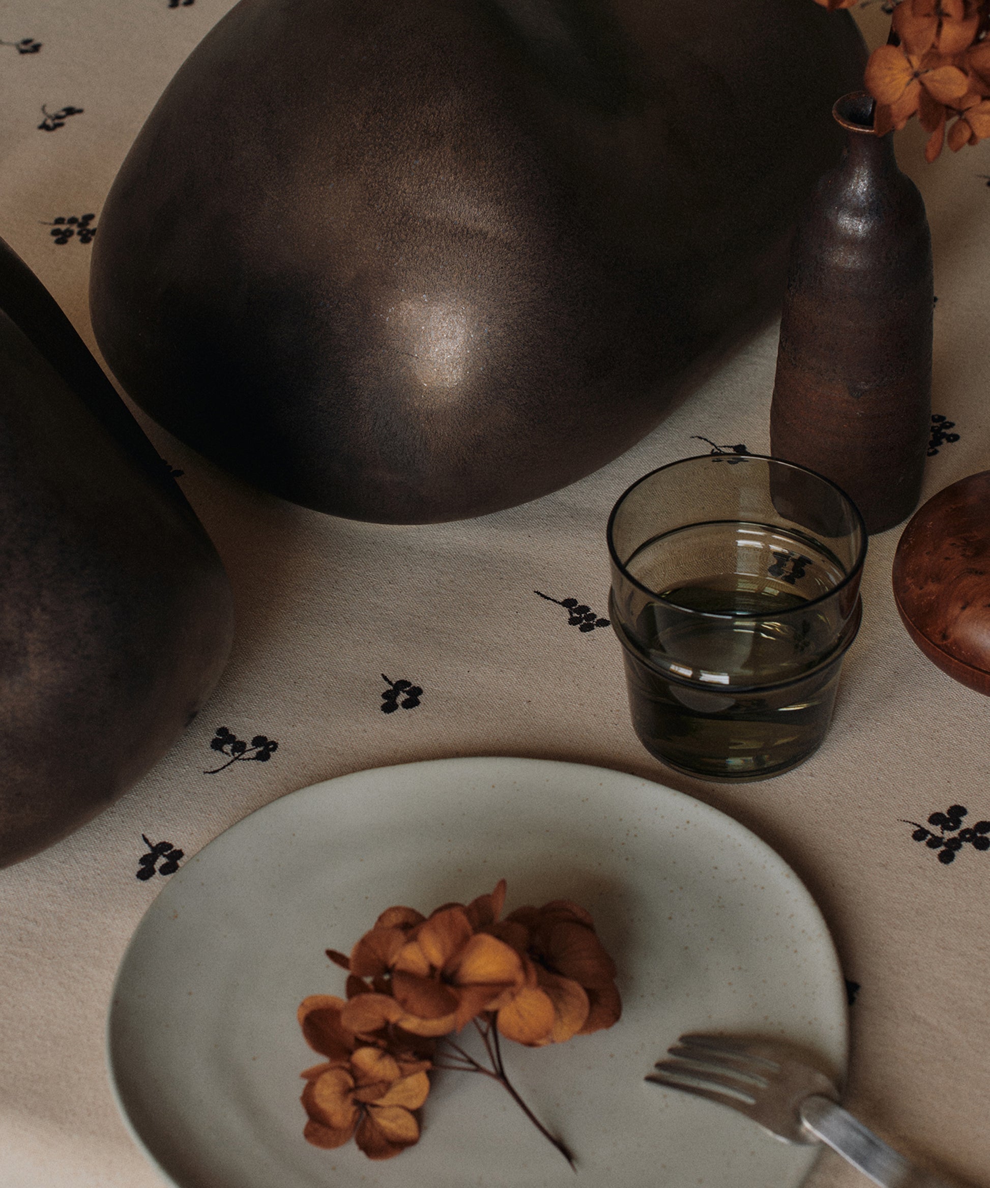 The Baies Tablecloth is made from 100% GOTS-certified organic cotton and adorned with delicately screen-printed, hand-drawn berry sprigs that lend a refined, artisanal touch. Its calm, understated design sets an elegant tone for festive gatherings.