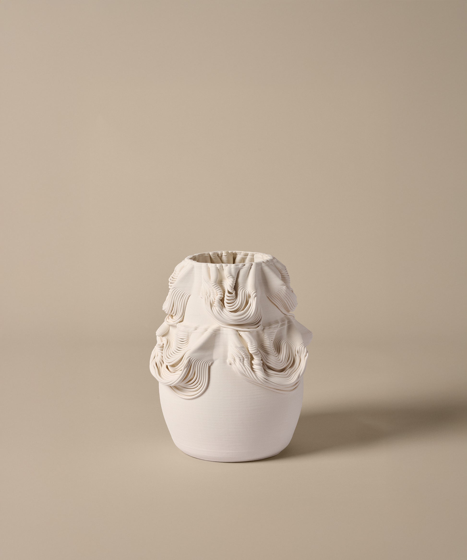 Its unglazed, matte surface highlights the tactile quality of the material, while ribbon-like patterns evoke the flow of fabric. Suitable for dried flowers or as a standalone display, it brings sculptural presence to shelves, consoles or pedestals.