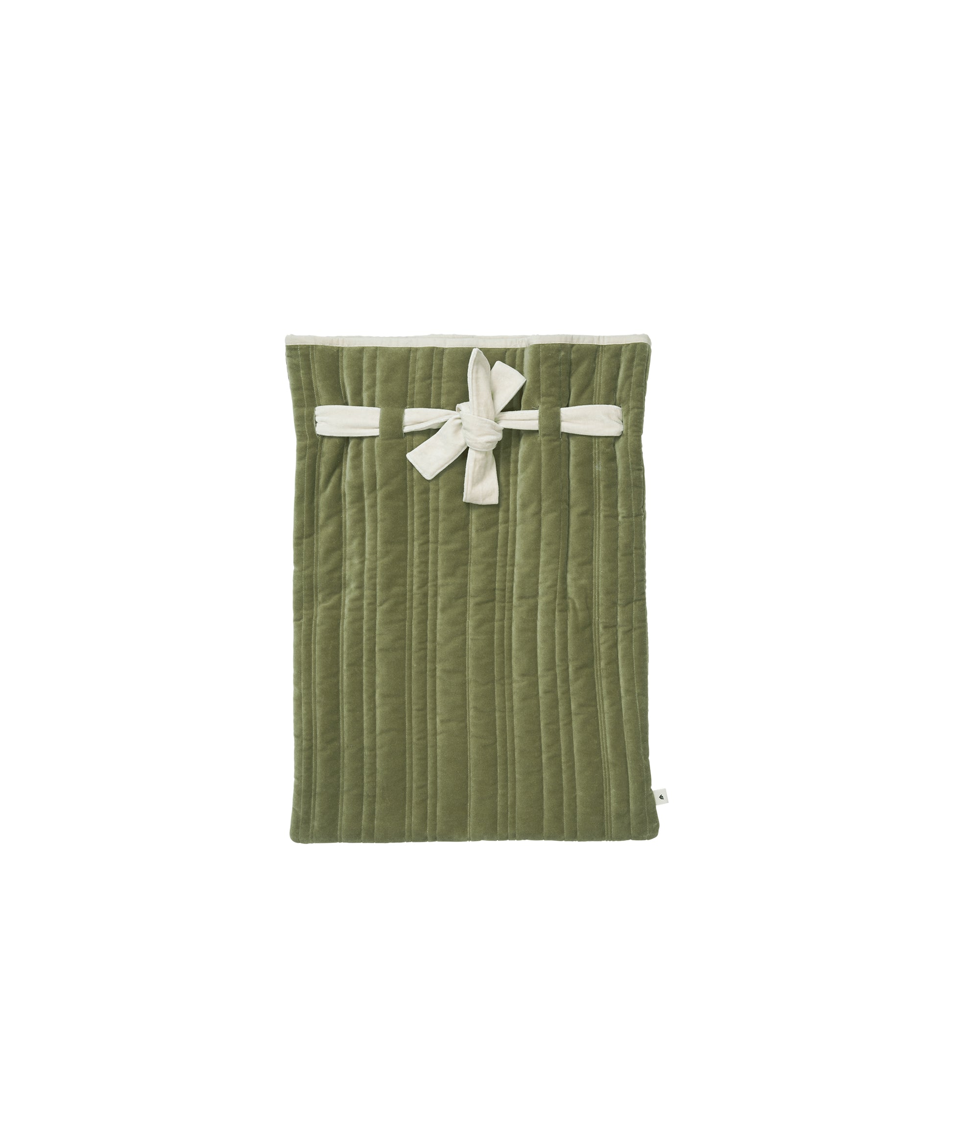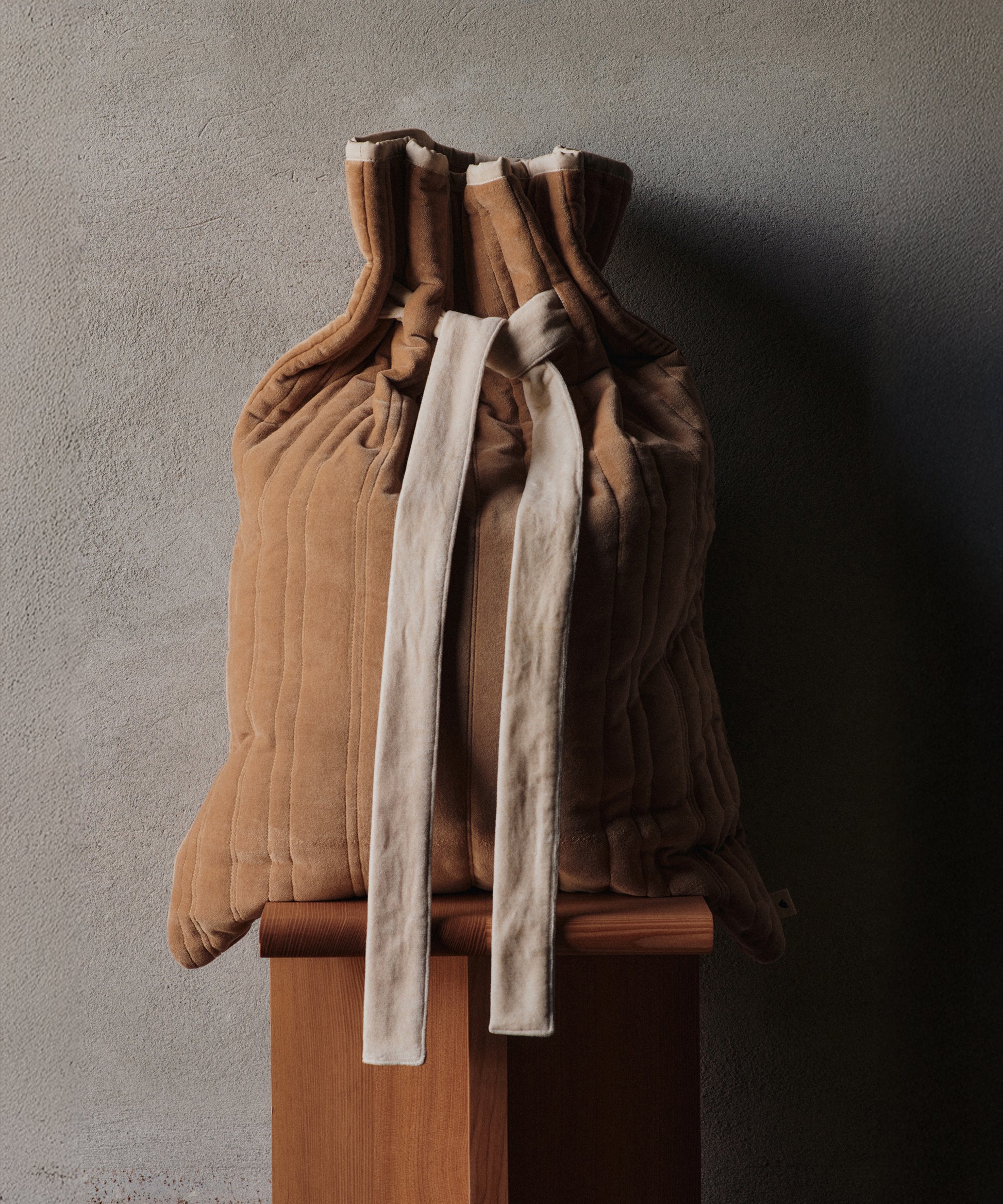 The Vari Quilted Sack is a spacious gift bag made from organic cotton velvet with recycled polyester filling, offering a soft and cosy feel.