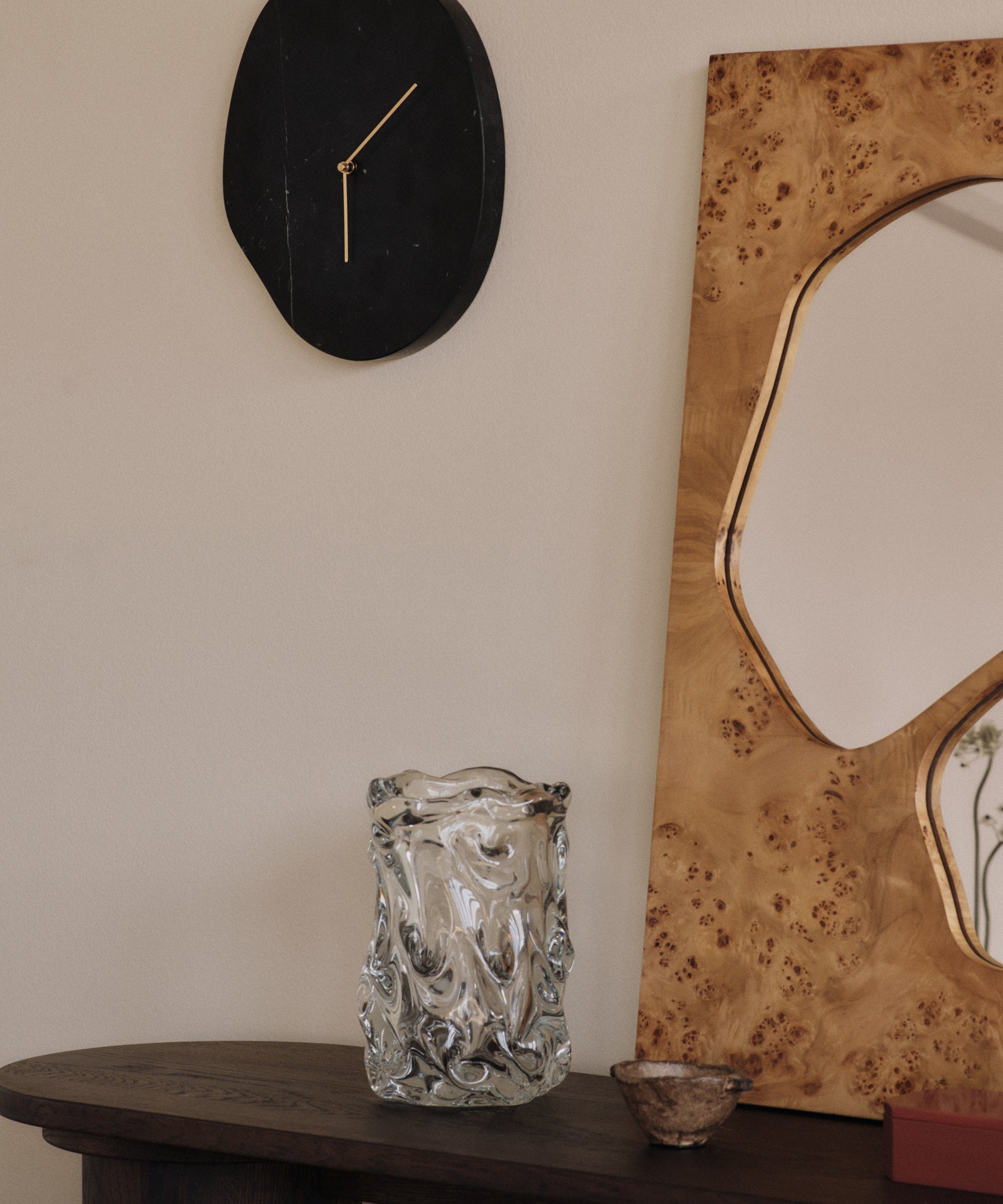 The Virelle Vase is crafted from mouth-blown glass with a form that captures gentle motion. Its rippling silhouette evokes the feeling of swells and vibrations, bringing a fluid, sculptural presence to the room. A considered piece that adds a quiet sense of movement to your space.