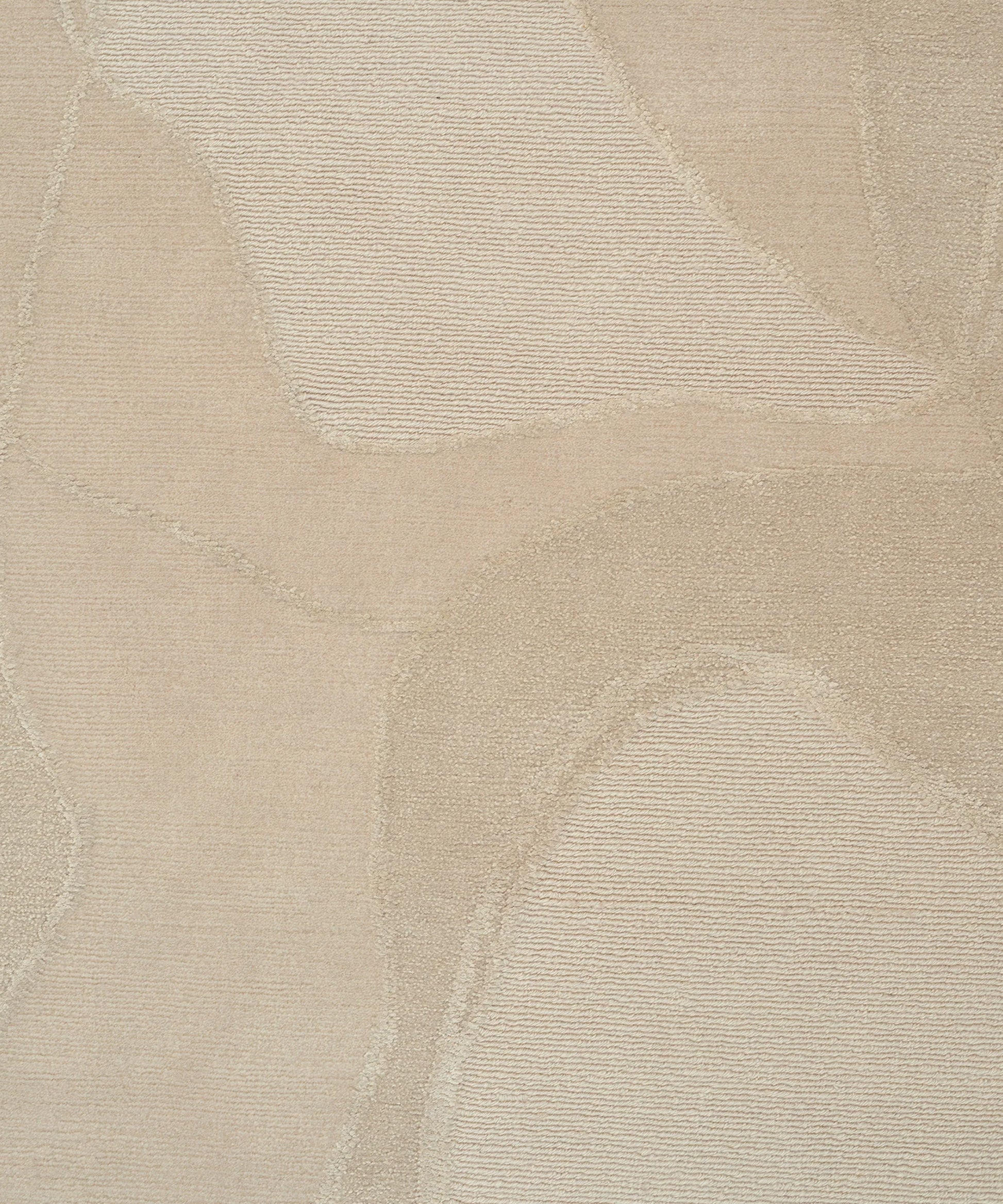 The silk lines separate the areas into whirling wave-like segments, each one defined by contrasting surfaces in sheared or boucle wool or wool-silk blend creating a beautiful structural pattern on a rug that will bring visual and tactile pleasure for many years to come.