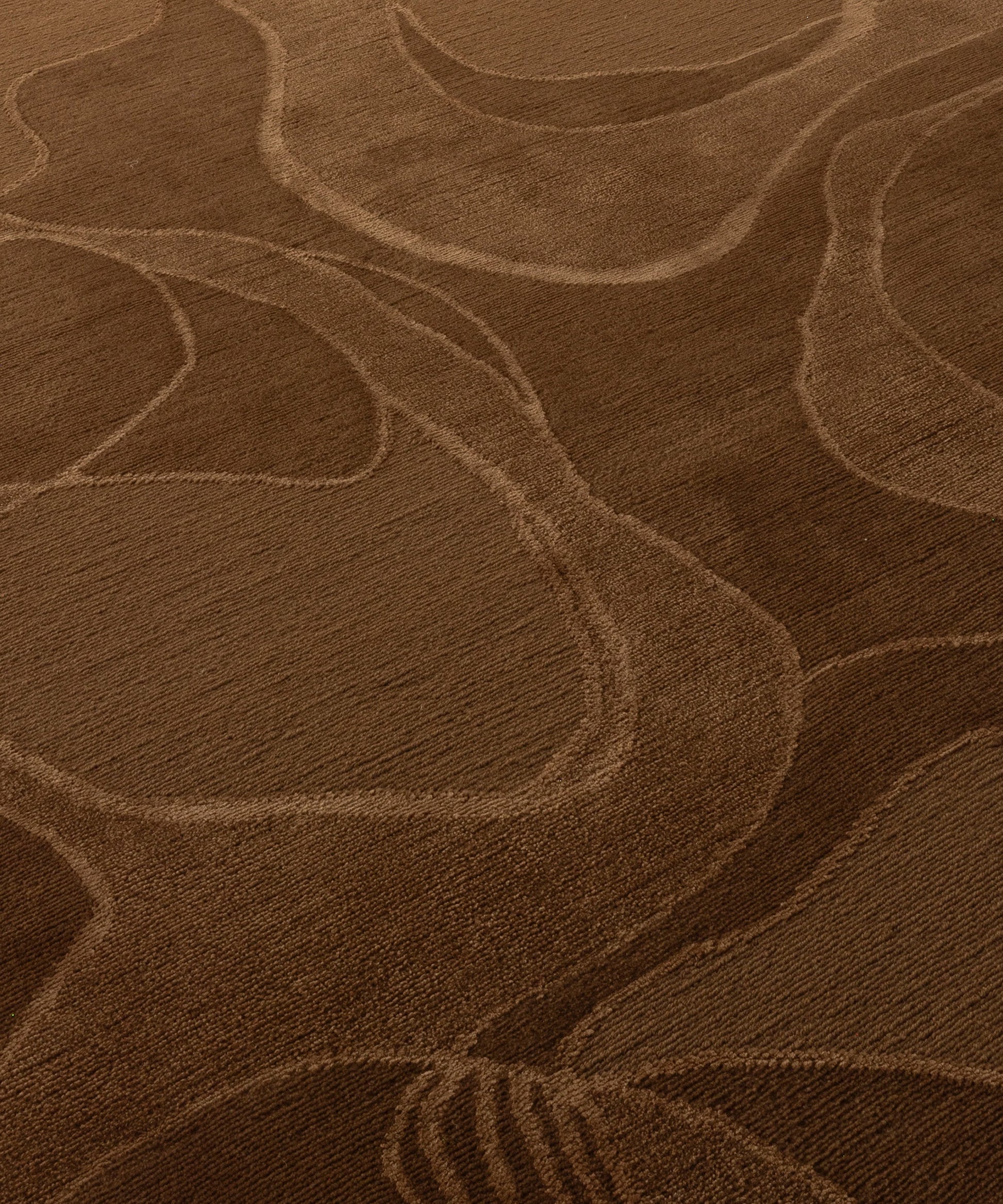 The silk lines separate the areas into whirling wave-like segments, each one defined by contrasting surfaces in sheared or boucle wool or wool-silk blend creating a beautiful structural pattern on a rug that will bring visual and tactile pleasure for many years to come.