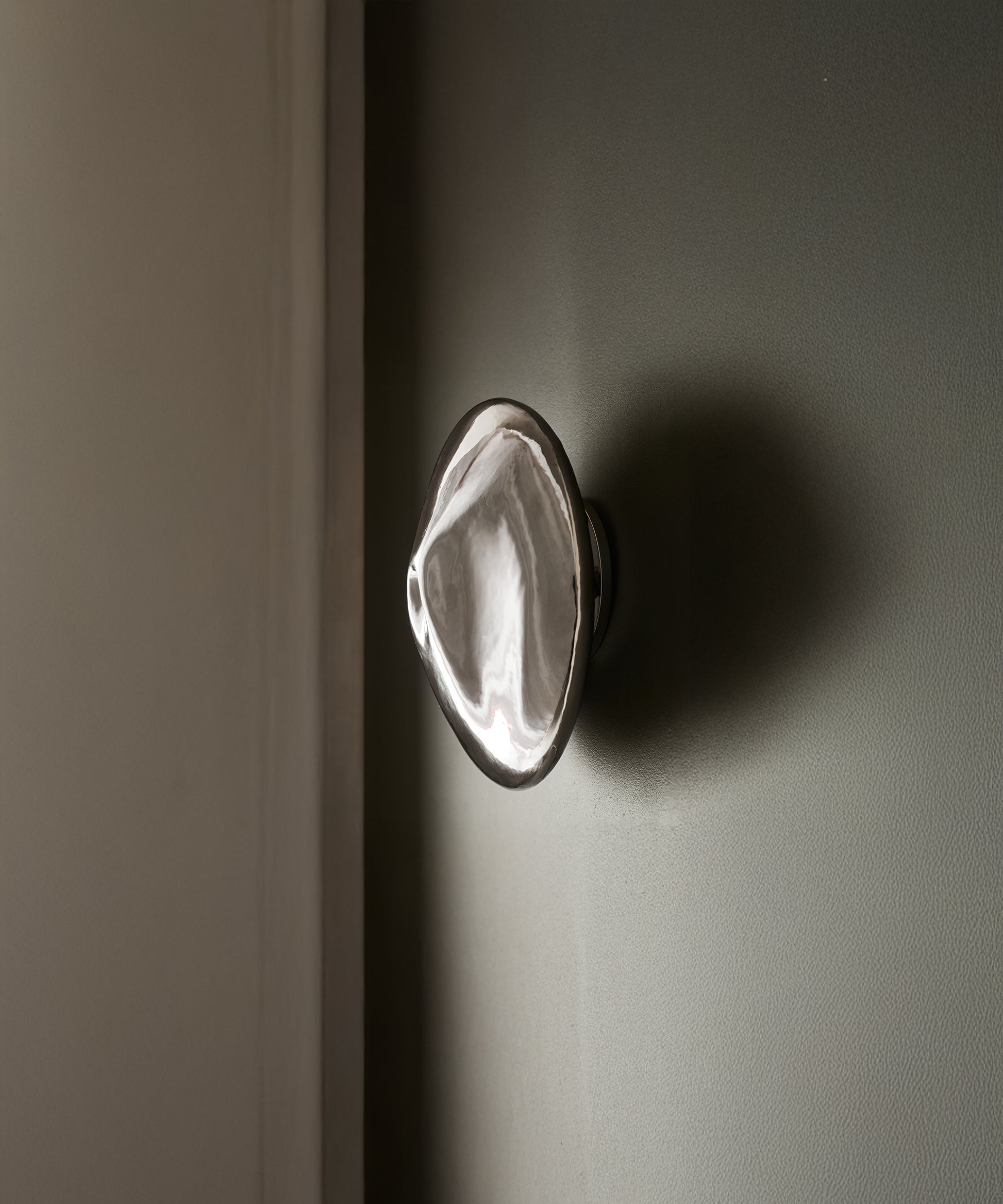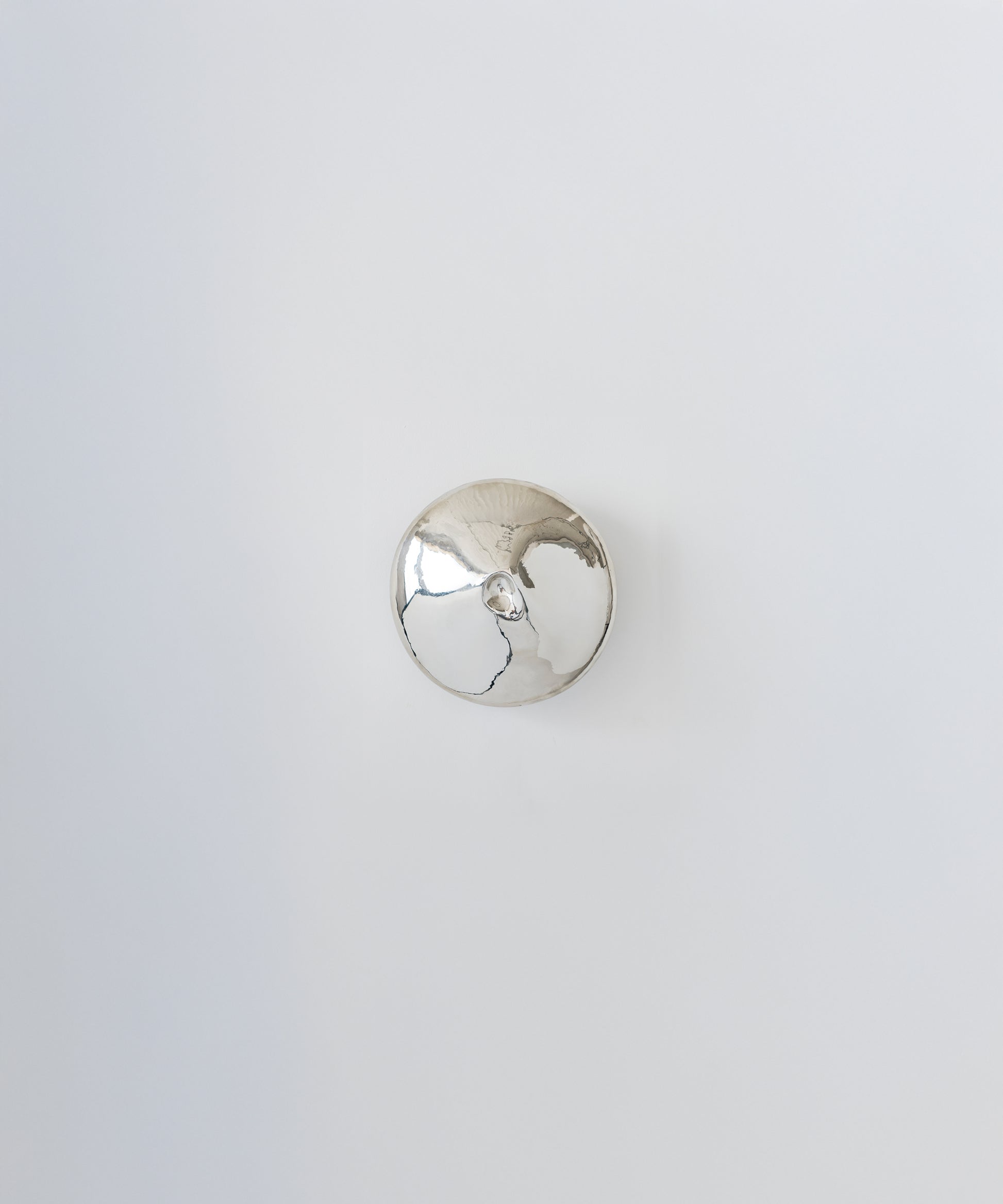Polished to a high sheen, the white brass is transformed into sculptural mirrors, adorning the space to subtly reflect the movement and life of the people in it. One sconce has a small glass mirror set directly into the crater-like opening. When lit, the sconces cast a halo against the wall, inviting intimacy.