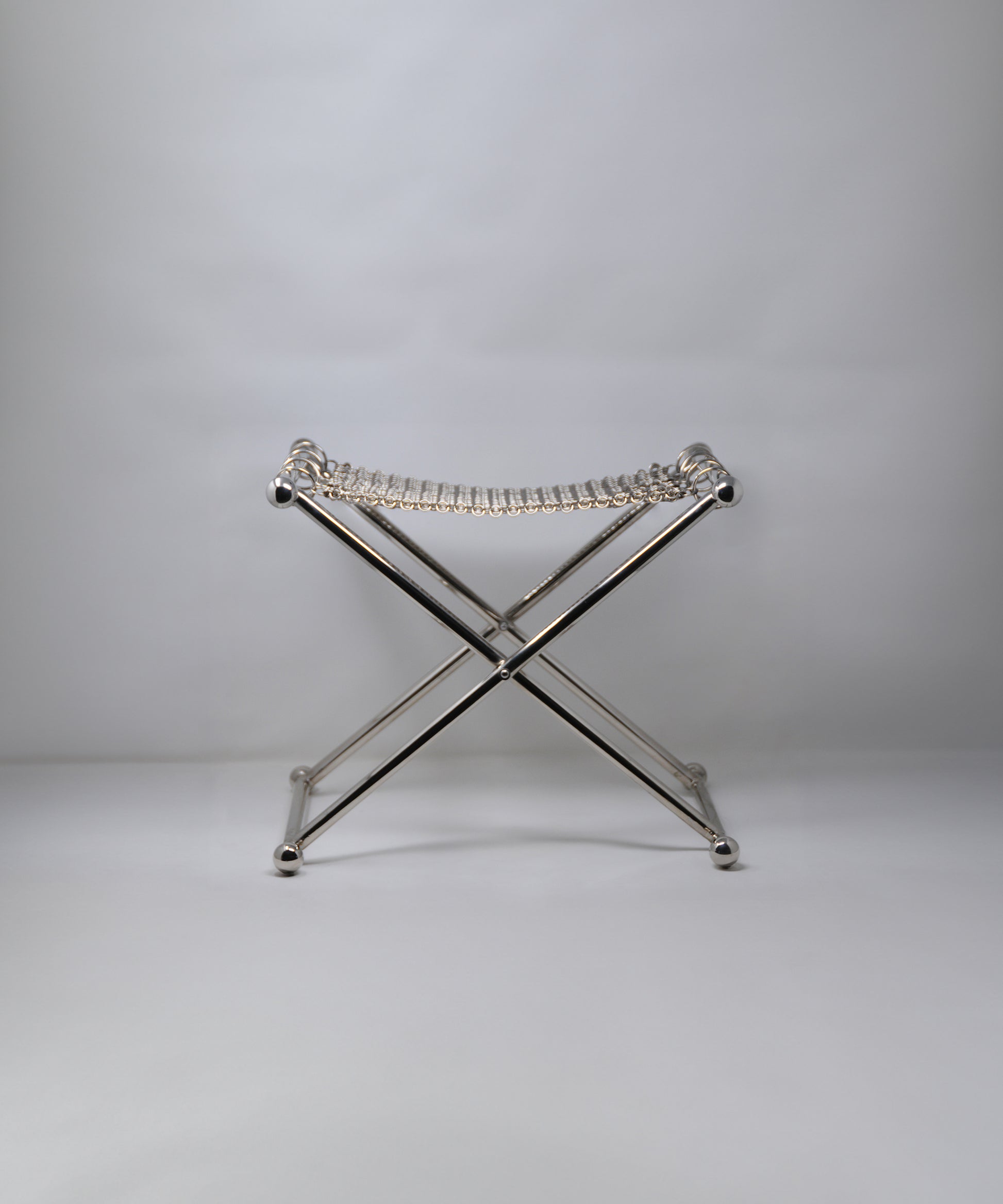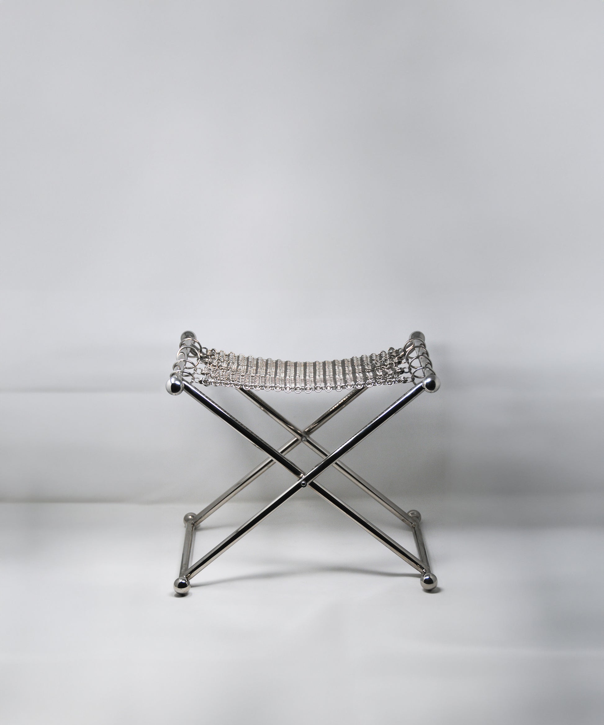 Its unique seat, crafted from intricately woven chainmail, brings an unexpected elegance to a traditionally rugged, outdoor item. Each piece is meticulously assembled, highlighting both durability and aesthetic refinement. Part of an exclusive collection of design objects, this stool elevates a functional accessory into a statement piece, ideal for enthusiasts who appreciate the convergence of design innovation and practicality.