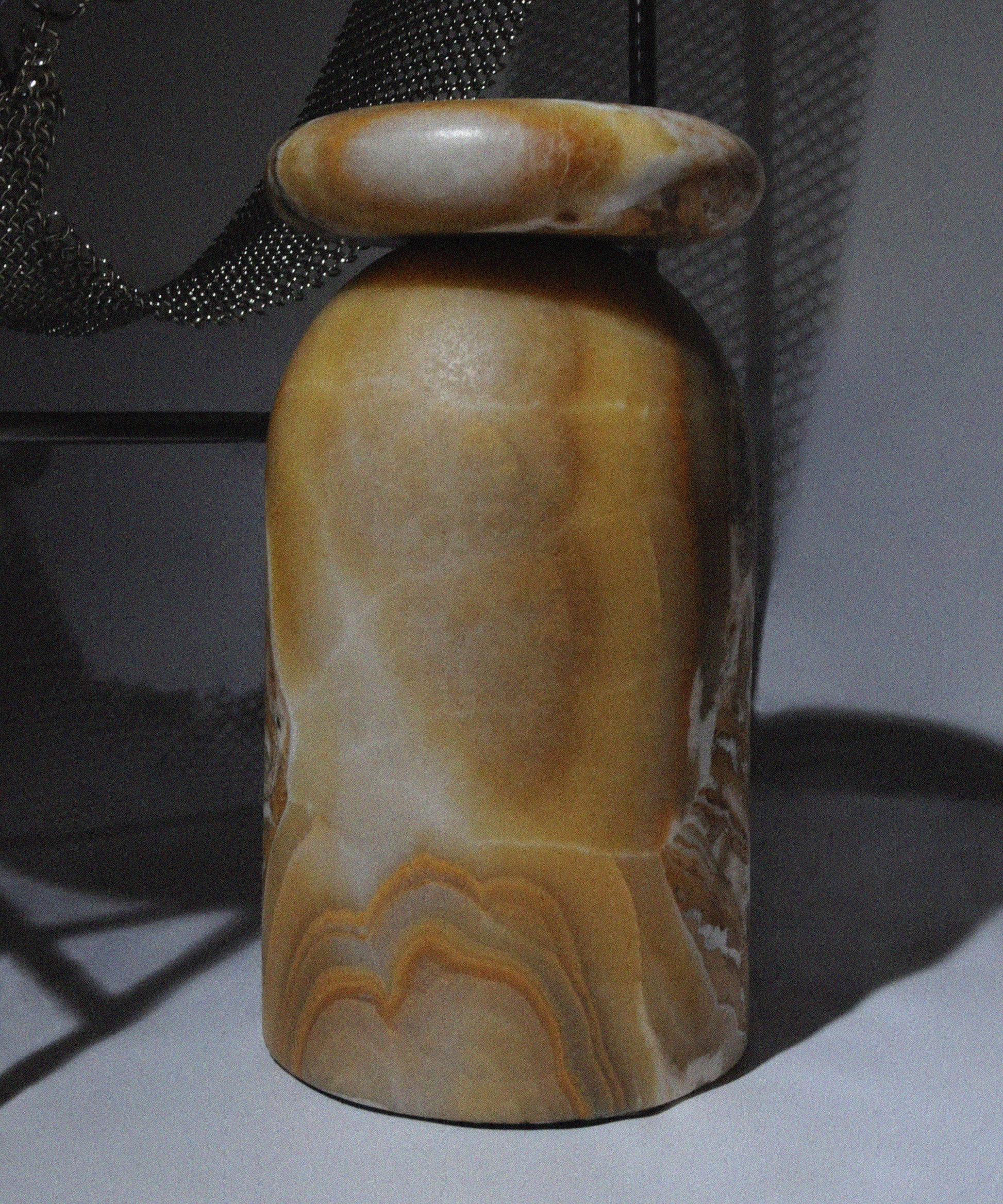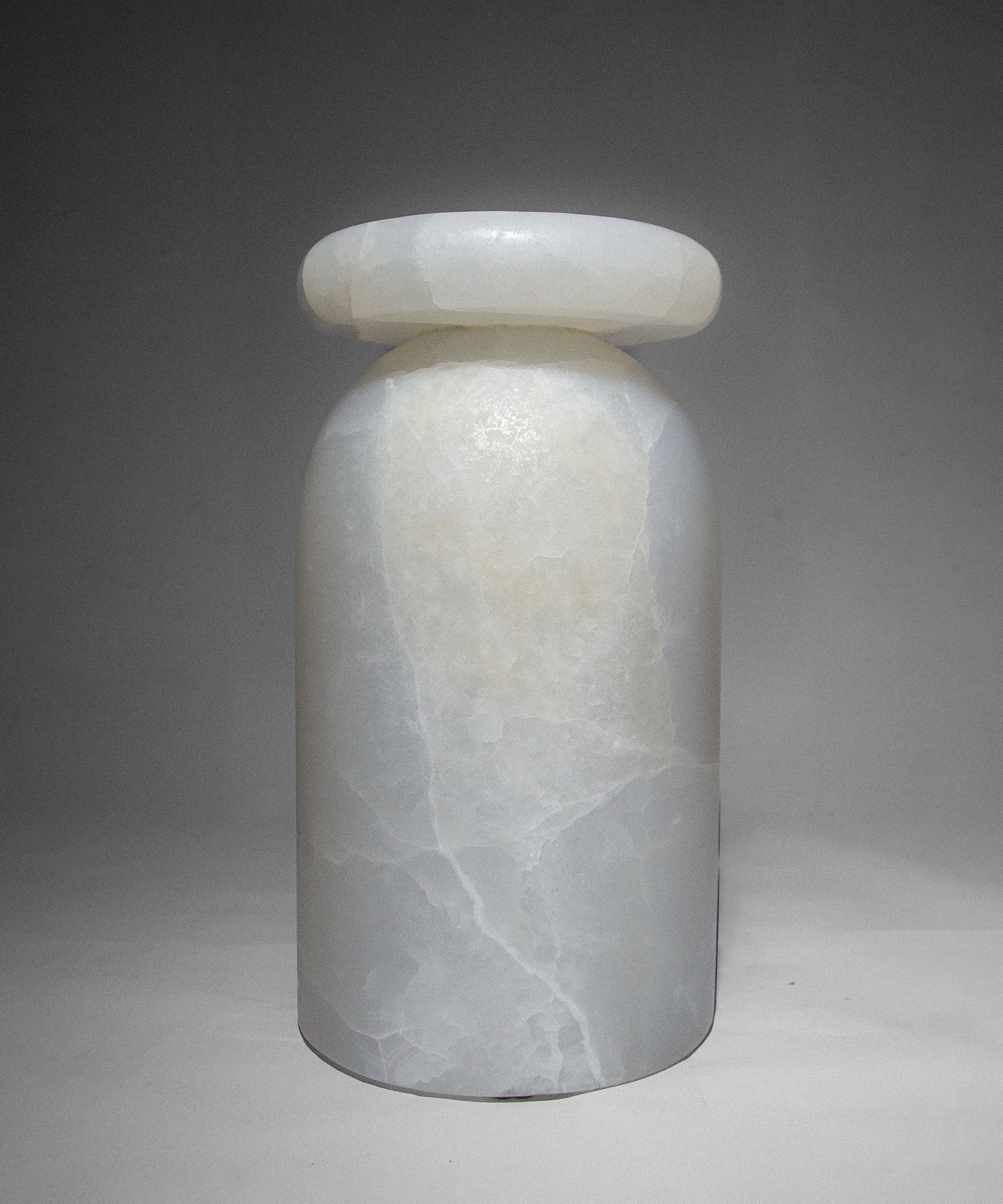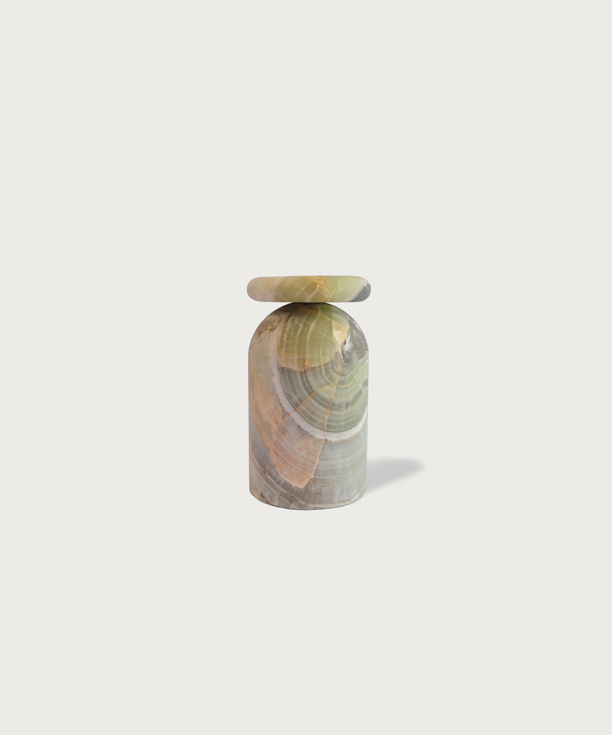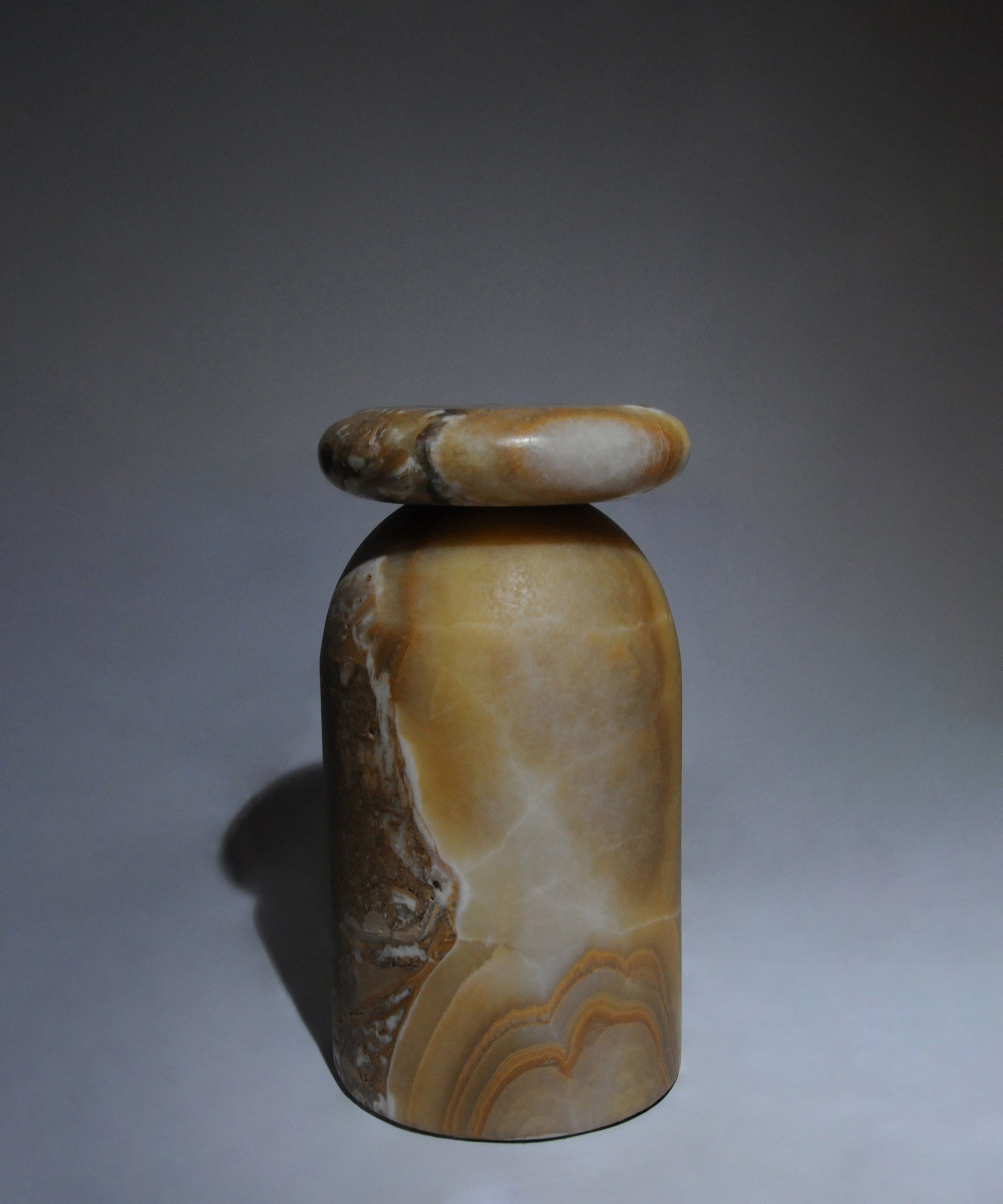• Cult stool/ side table; a hand-sculpted stone from a Mexican marble and Mexican onyx conglomerate, remits to primal sculptural-architectural language while displaying materials in a modernist manner.