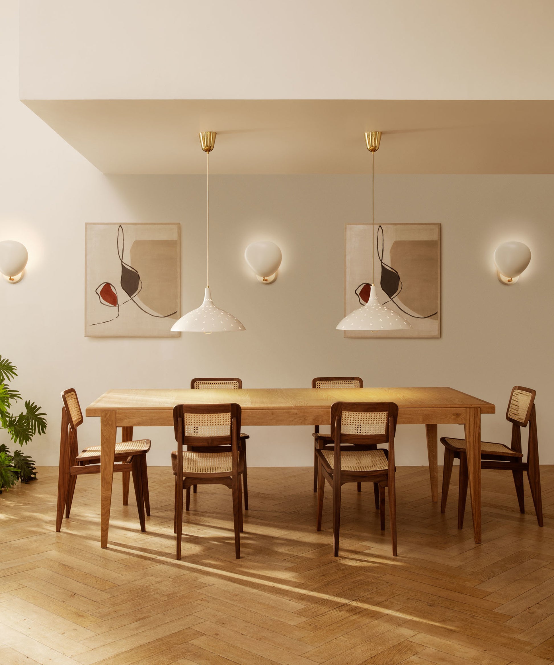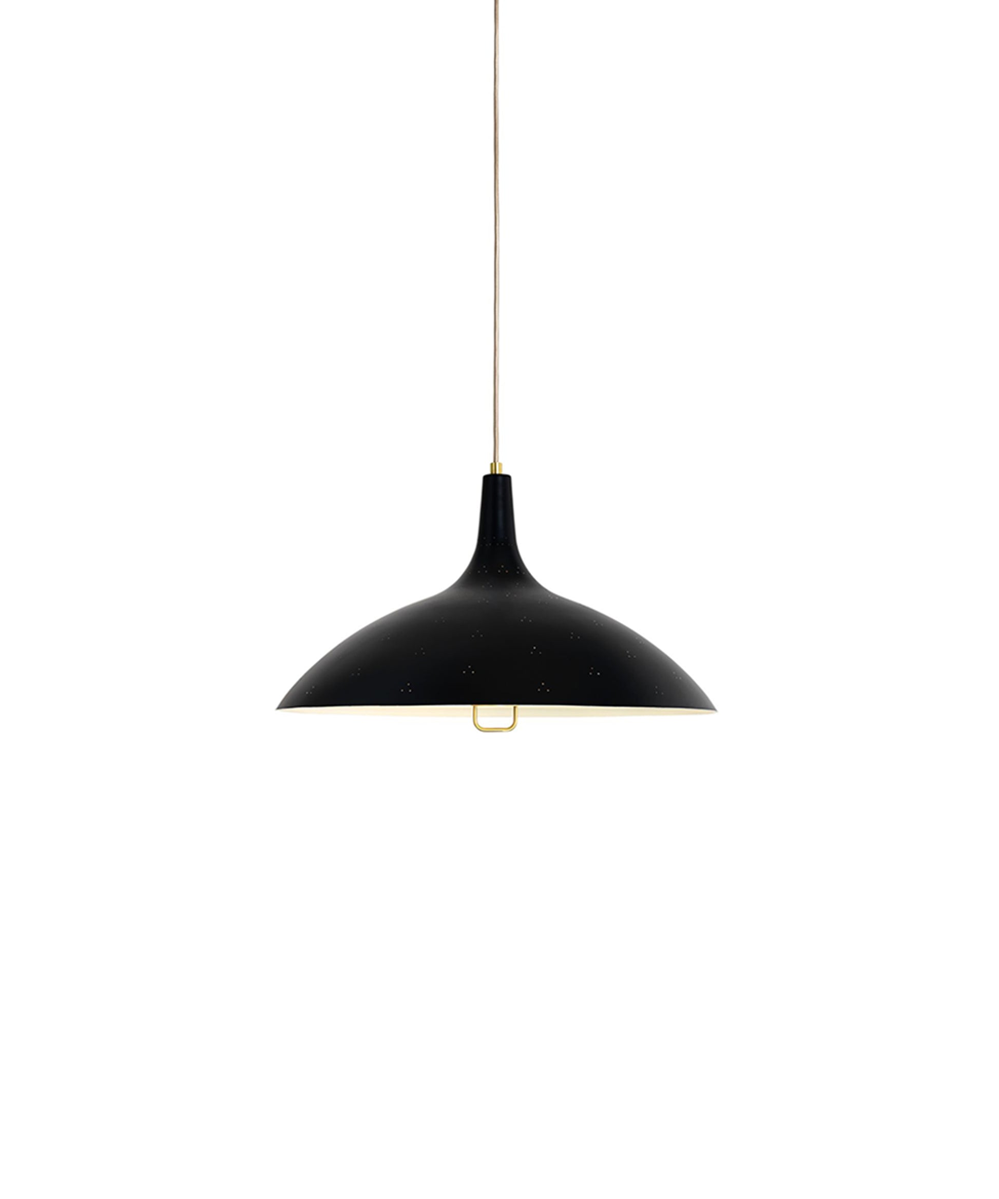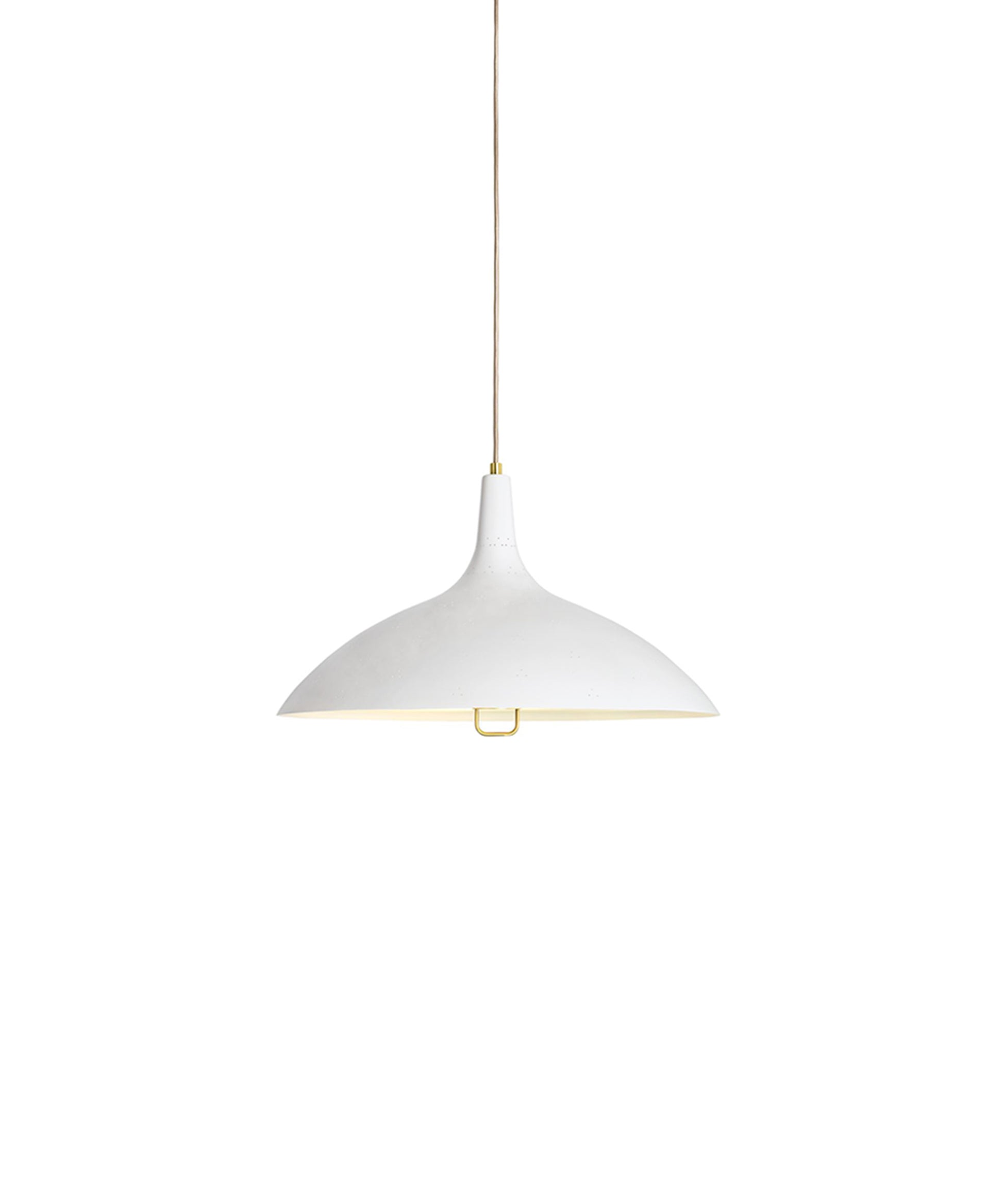 Like many of his best-known designs, the pendant was designed for the Finland House in New York - one of the most ambitious and successful projects of all time to showcase Finnish design. Known for perfecting the techniques of metal finishes, the 1965 Pendant captures Tynell's masterful understanding of brass. Characterized by its triangular perforation pattern - an artistic detail utilized by Tynell in several of his lighting objects - the pendant includes a frosted glass diffuser that softens the light.
