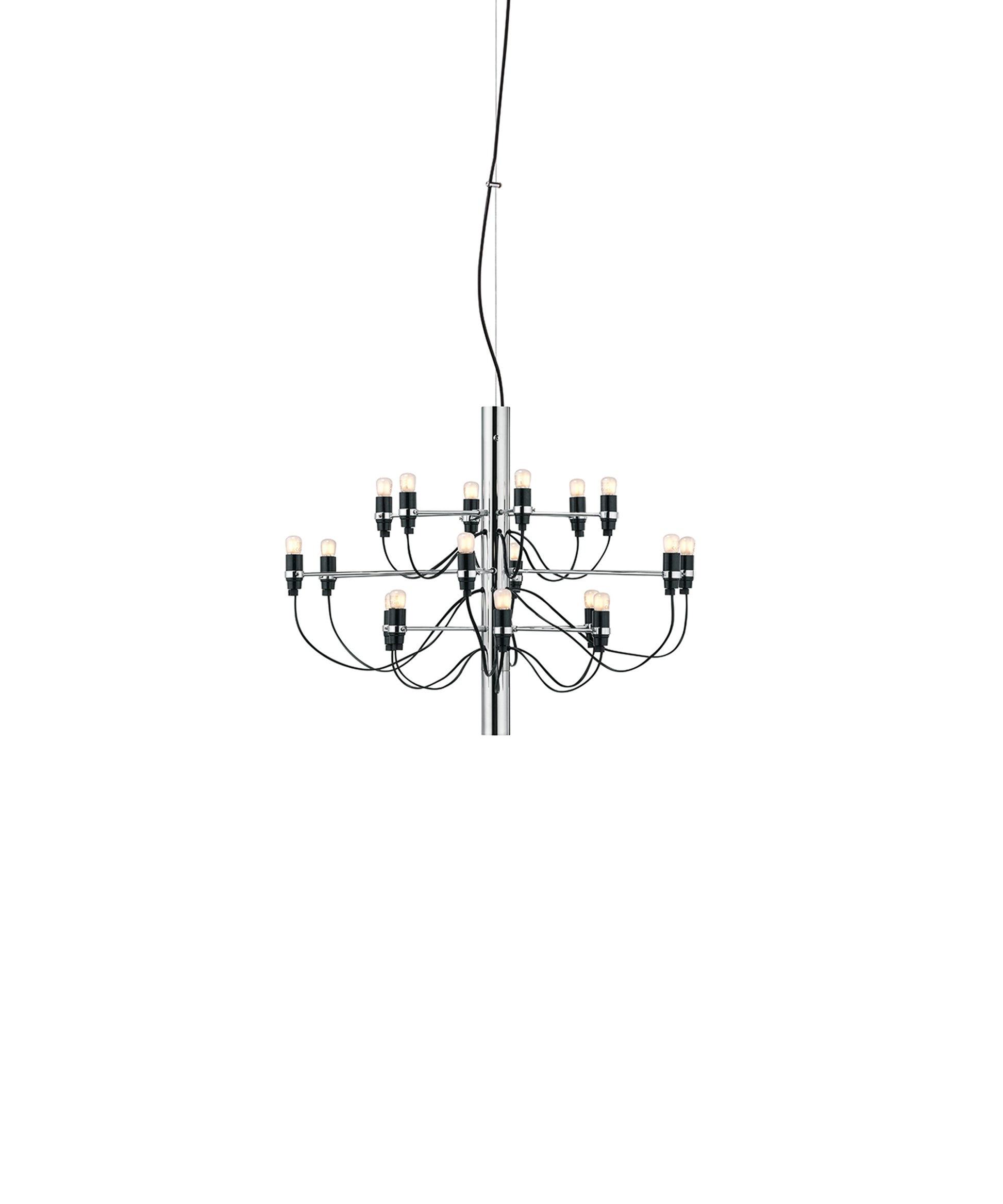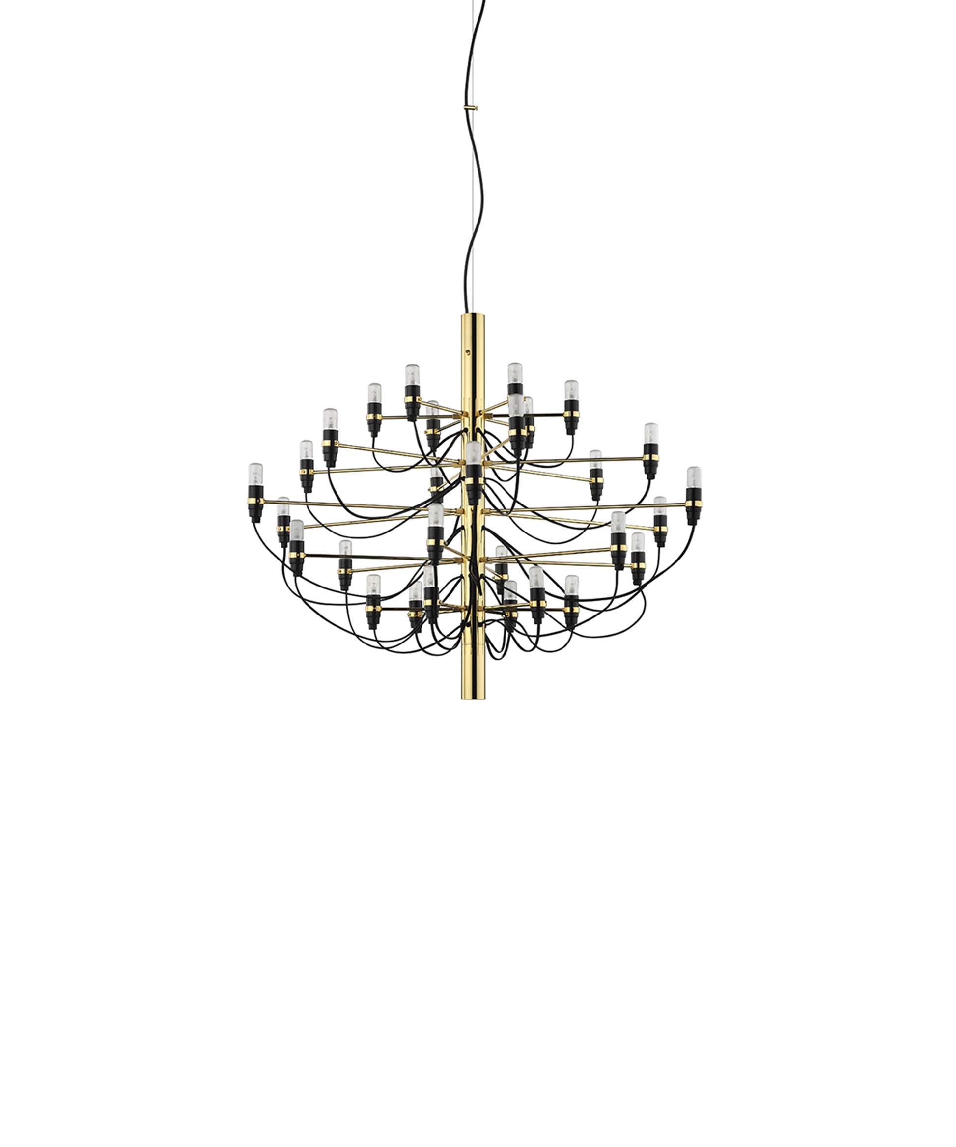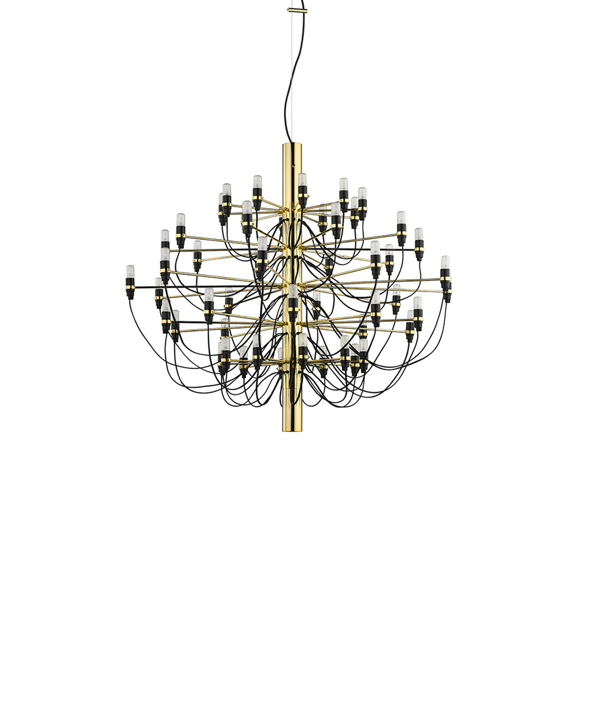 Every detail of this state-of-the-art ceiling light is exceptional, from the mirror-polish finish of its main steel structure to the way each bulb is fitted with its own horizontal arm and the graceful wiring meanders down the stem. The Mod 2097 by Gino Sarfatti holds 18, 30, or 50 incandescent bulbs, emitting indirect light. It features a ceiling fitting and includes a suspension cable. Available in brass, chrome, and matte black plating in 3 models: 2097/18: 18 X 15W E14 clear bulb incandescent - 20.1" x 27.2" 2097/30: 30 x 15W E14 clear bulb incandescent - 28" x 35" 2097/50: 50 x 15W E14 clear bulb incandescent - 34.6" x 39.7" Inspiration behind the design: Renowned for his contribution to the modern architectural movement in lighting, creator Gino Sarfatti designed the FLOS 2097 Chandelier in accordance with his legendary utilitarianism and overall desire to create humble yet powerful pieces.