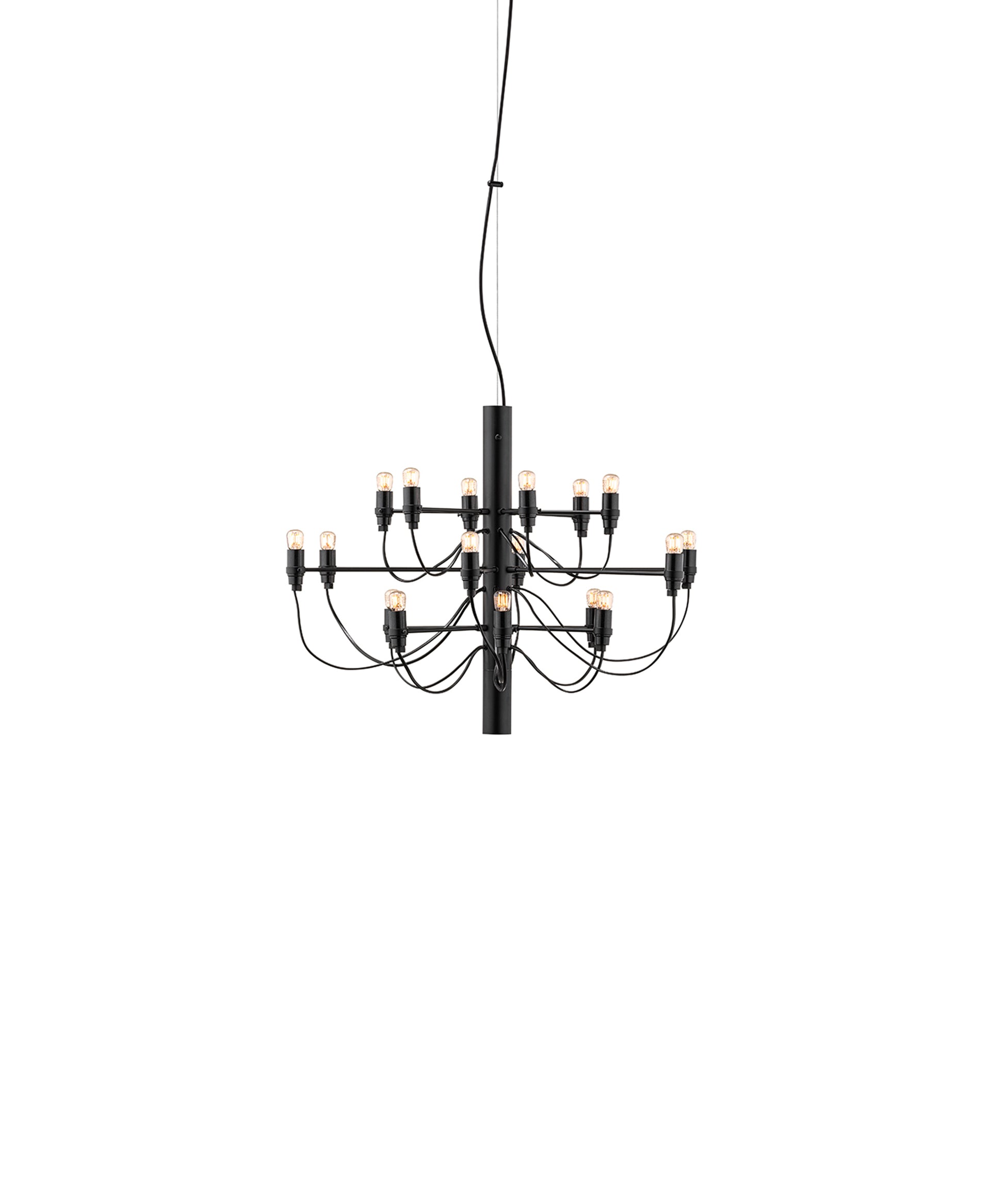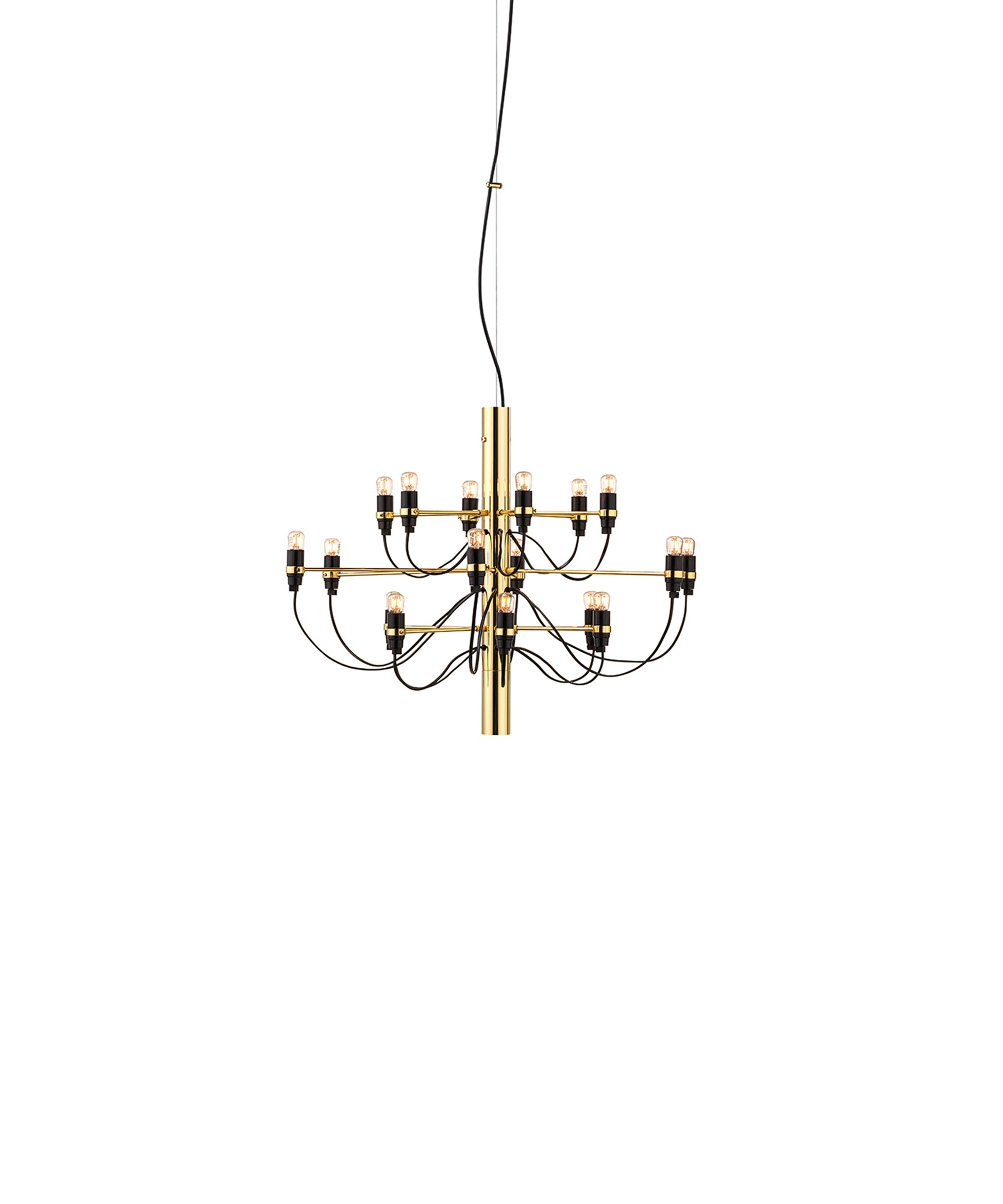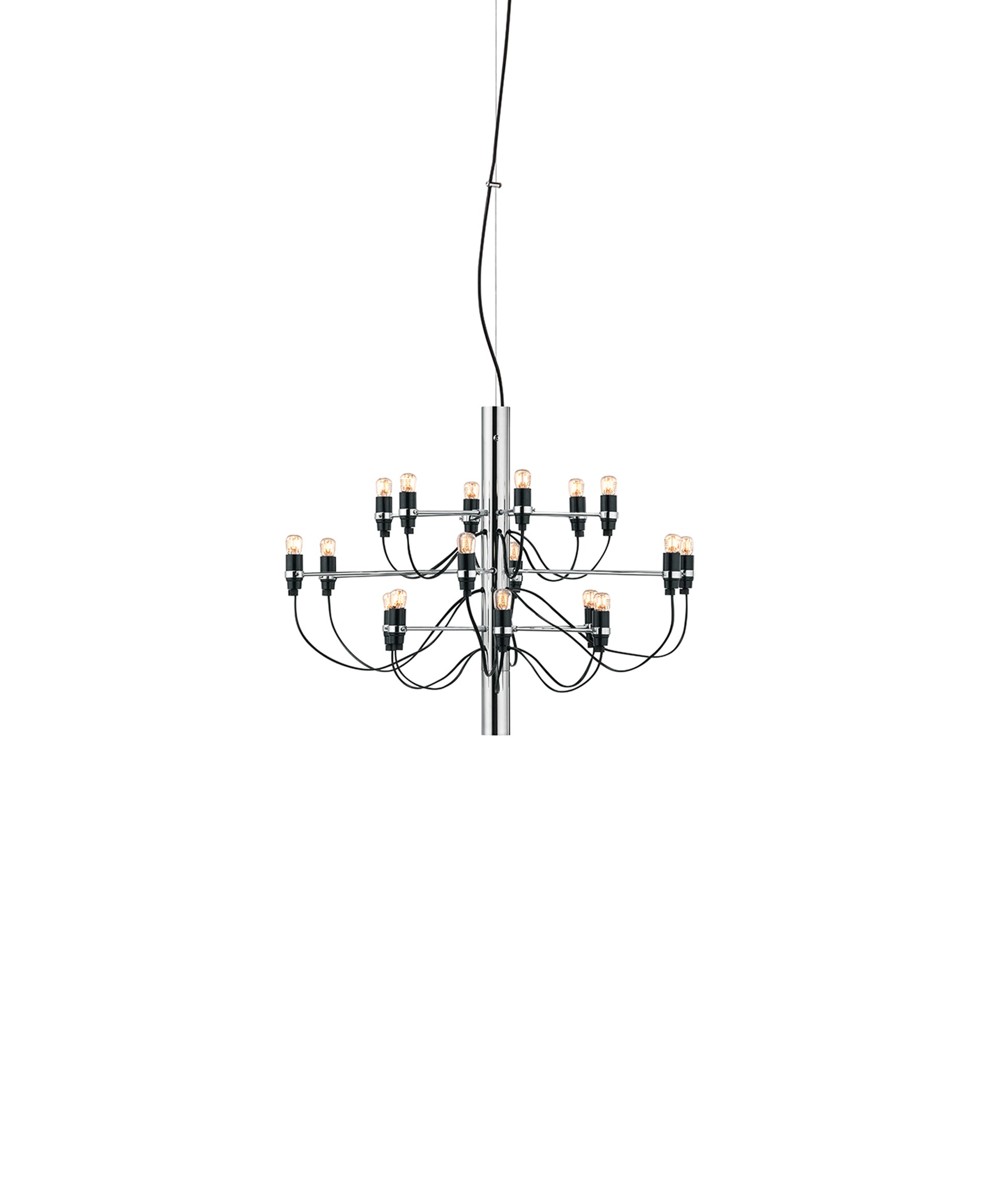 Every detail of this state-of-the-art ceiling light is exceptional, from the mirror-polish finish of its main steel structure to the way each bulb is fitted with its own horizontal arm and the graceful wiring meanders down the stem. The Mod 2097 by Gino Sarfatti holds 18, 30, or 50 incandescent bulbs, emitting indirect light. It features a ceiling fitting and includes a suspension cable. Available in brass, chrome, and matte black plating in 3 models: 2097/18: 18 X 15W E14 clear bulb incandescent - 20.1" x 27.2" 2097/30: 30 x 15W E14 clear bulb incandescent - 28" x 35" 2097/50: 50 x 15W E14 clear bulb incandescent - 34.6" x 39.7" Inspiration behind the design: Renowned for his contribution to the modern architectural movement in lighting, creator Gino Sarfatti designed the FLOS 2097 Chandelier in accordance with his legendary utilitarianism and overall desire to create humble yet powerful pieces.