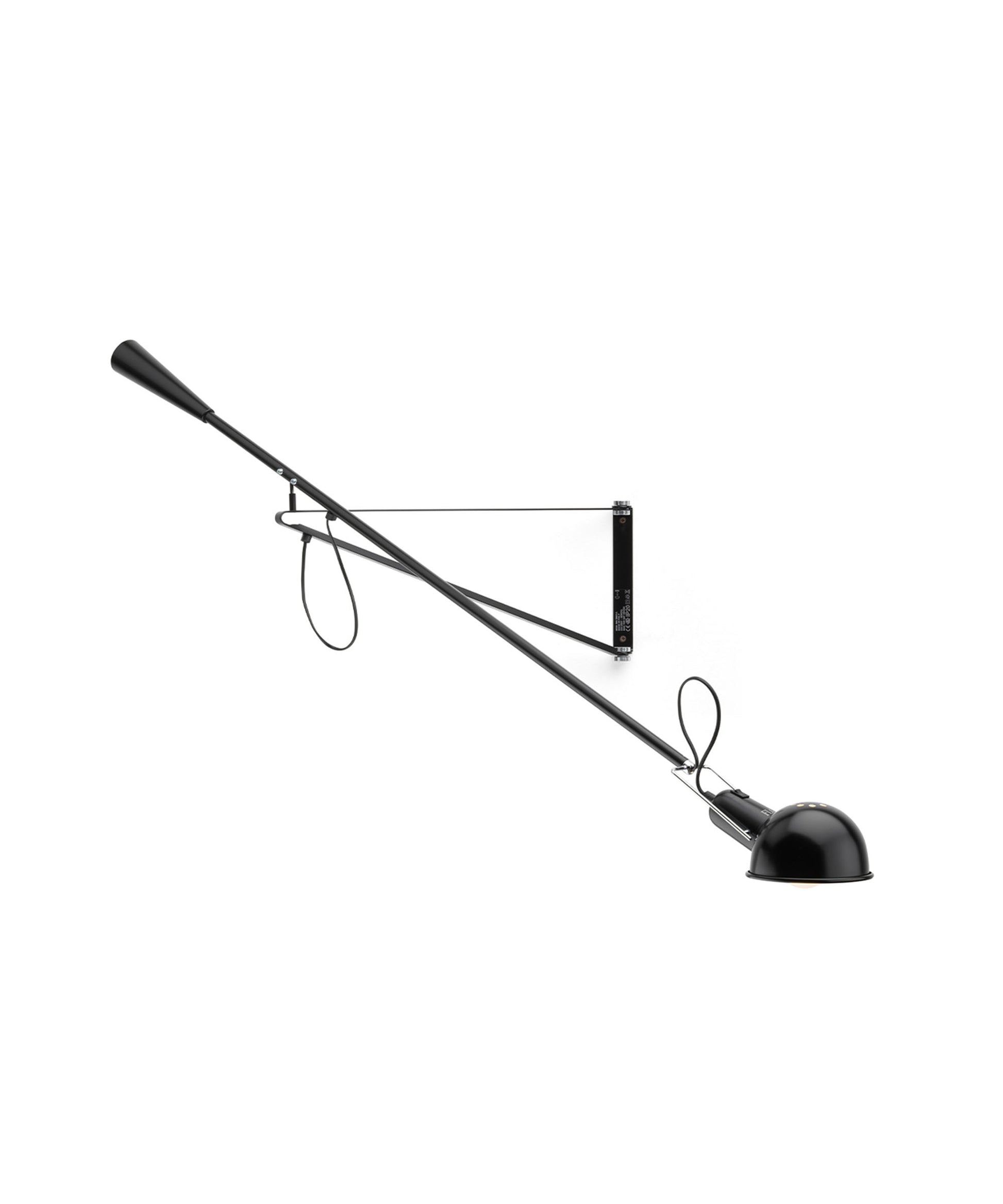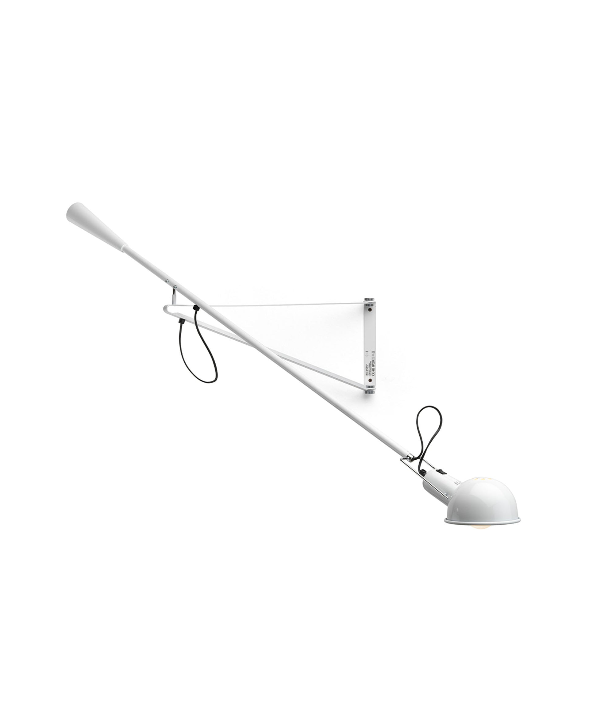 Multi-angle rotatable head and long, adjustable swing arm wall lamp. The lamp head-which rotates 360 degrees so that it can be aimed in any direction-provides a clean, direct light. The body is painted steel, with an adjustable arm and reflector. There is a chrome-plated brass reflector support. The counterweight is tapered cast iron. There is an on/off switch on the socket holder and a plug in power cord measuring 80-inches. Available in black and white finish. Perfect for illuminating a dining table or the bedside. Inspired by a minimalist design, Paolo Rizzatto created this timeless piece in 1973.