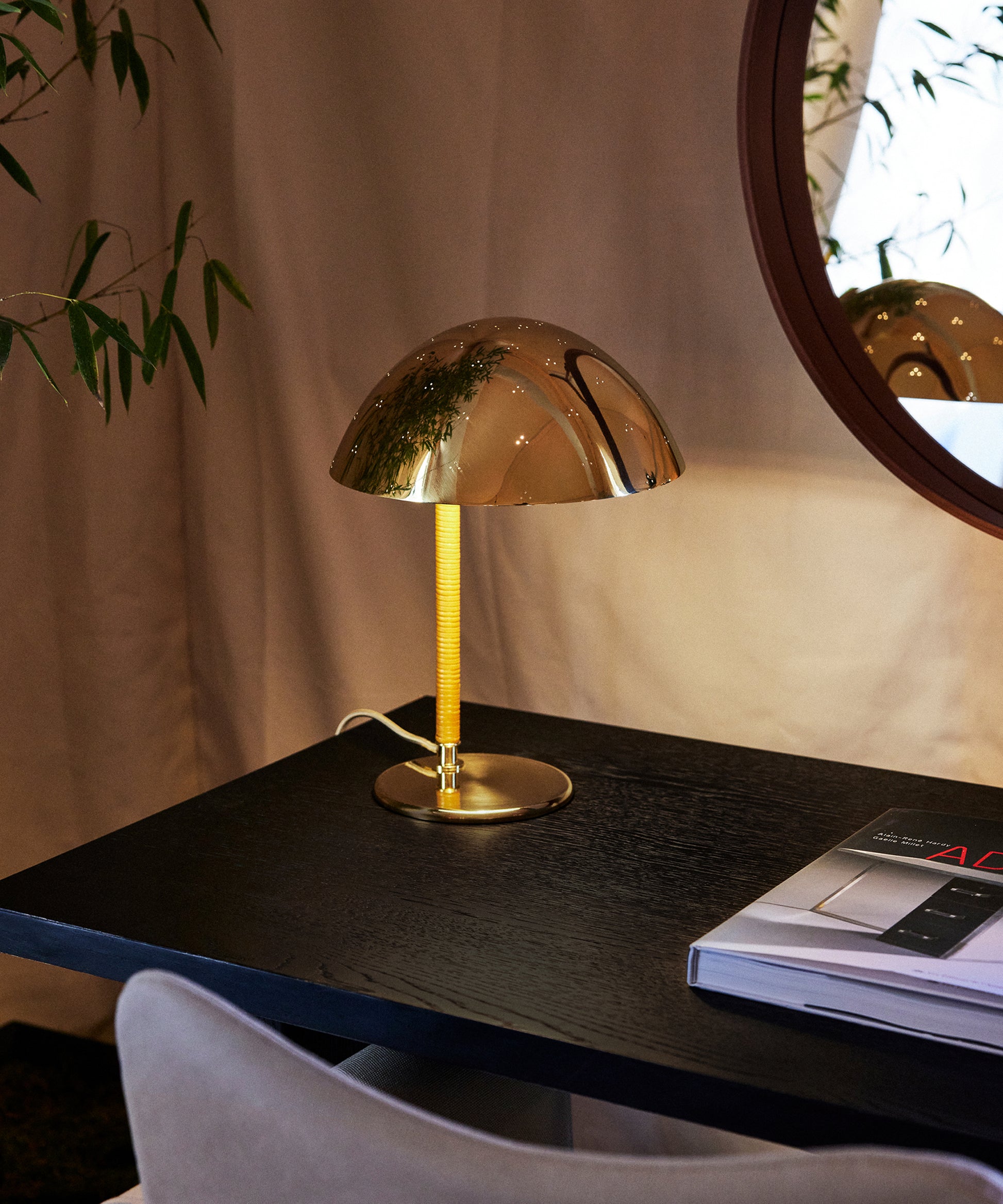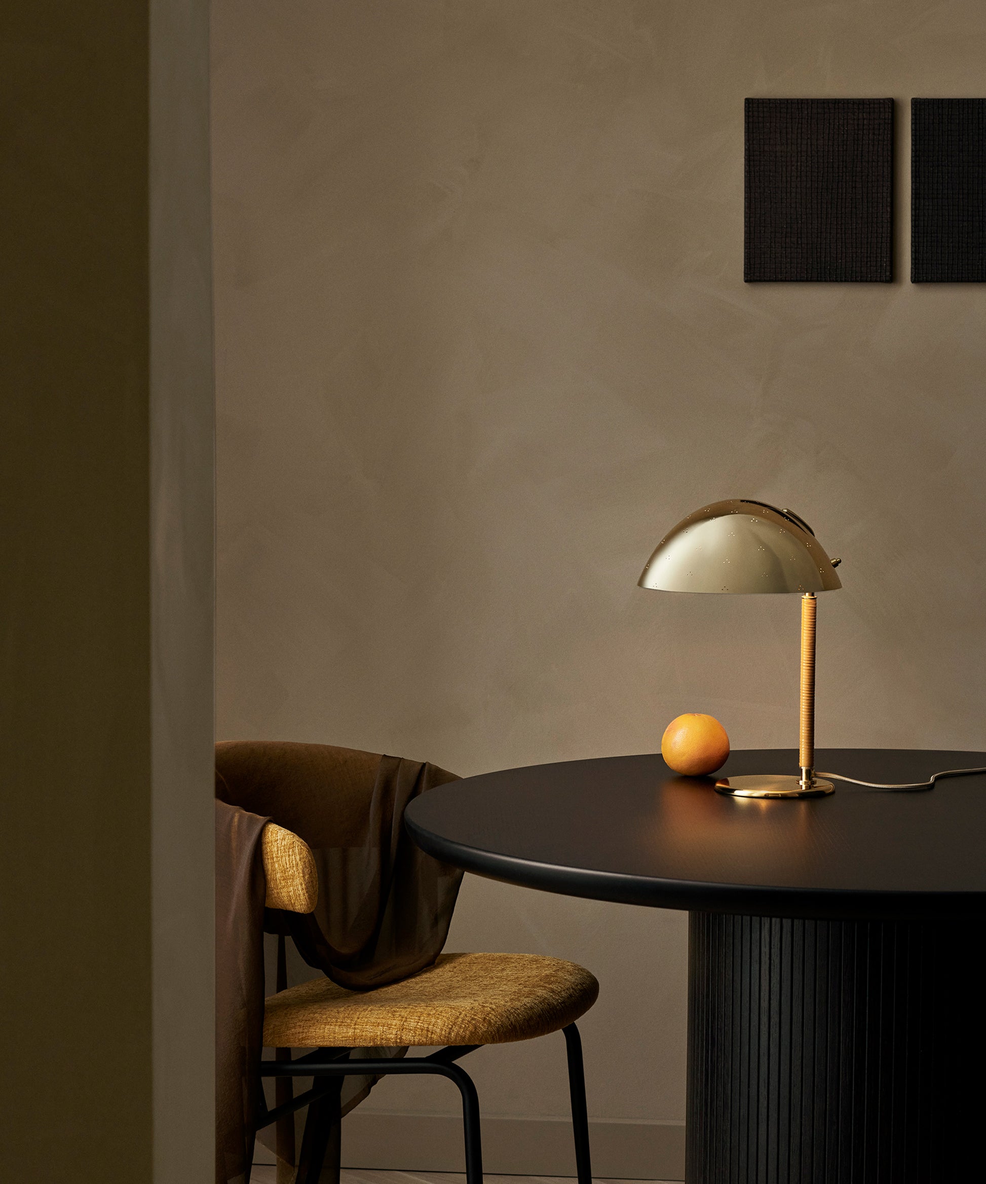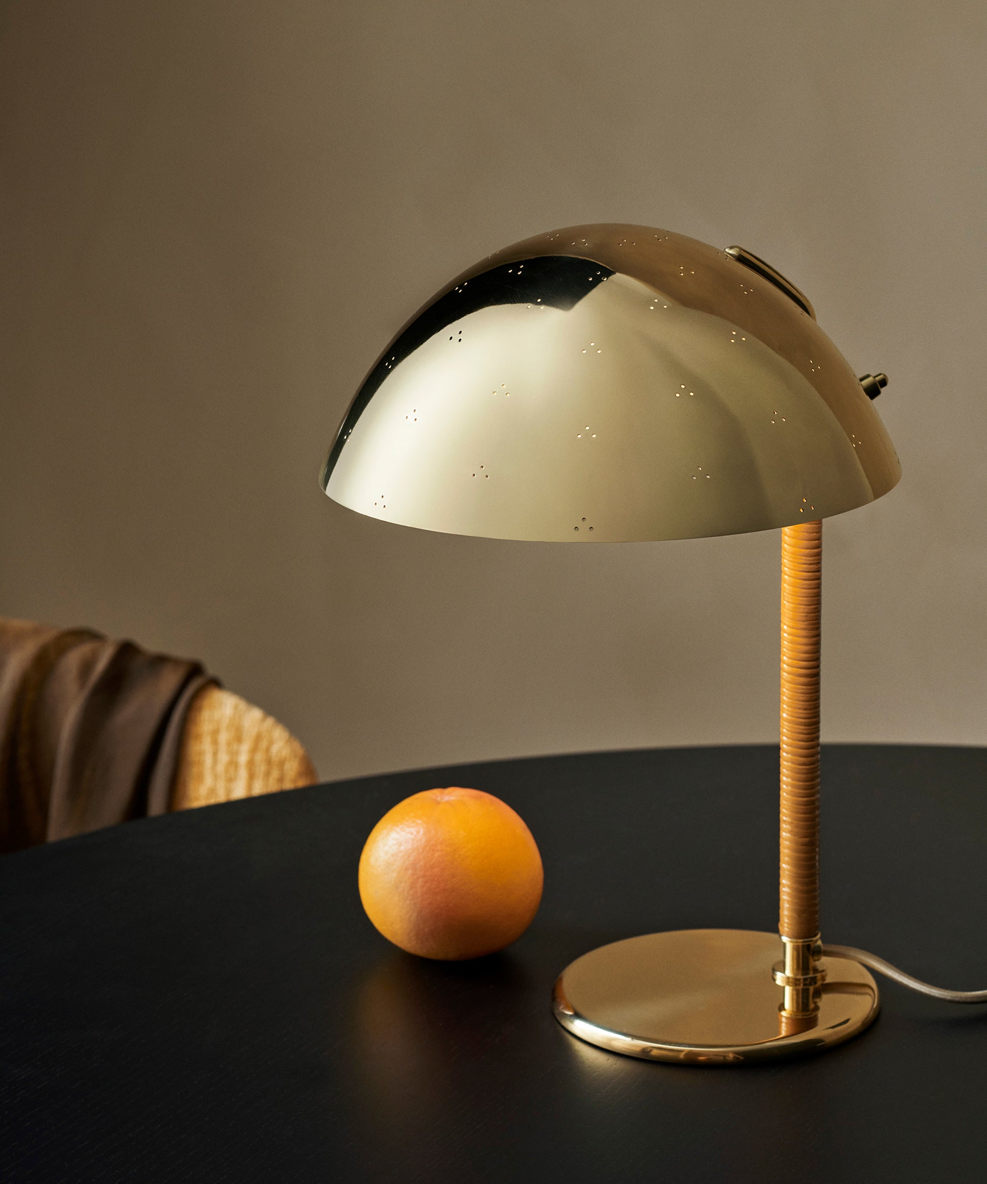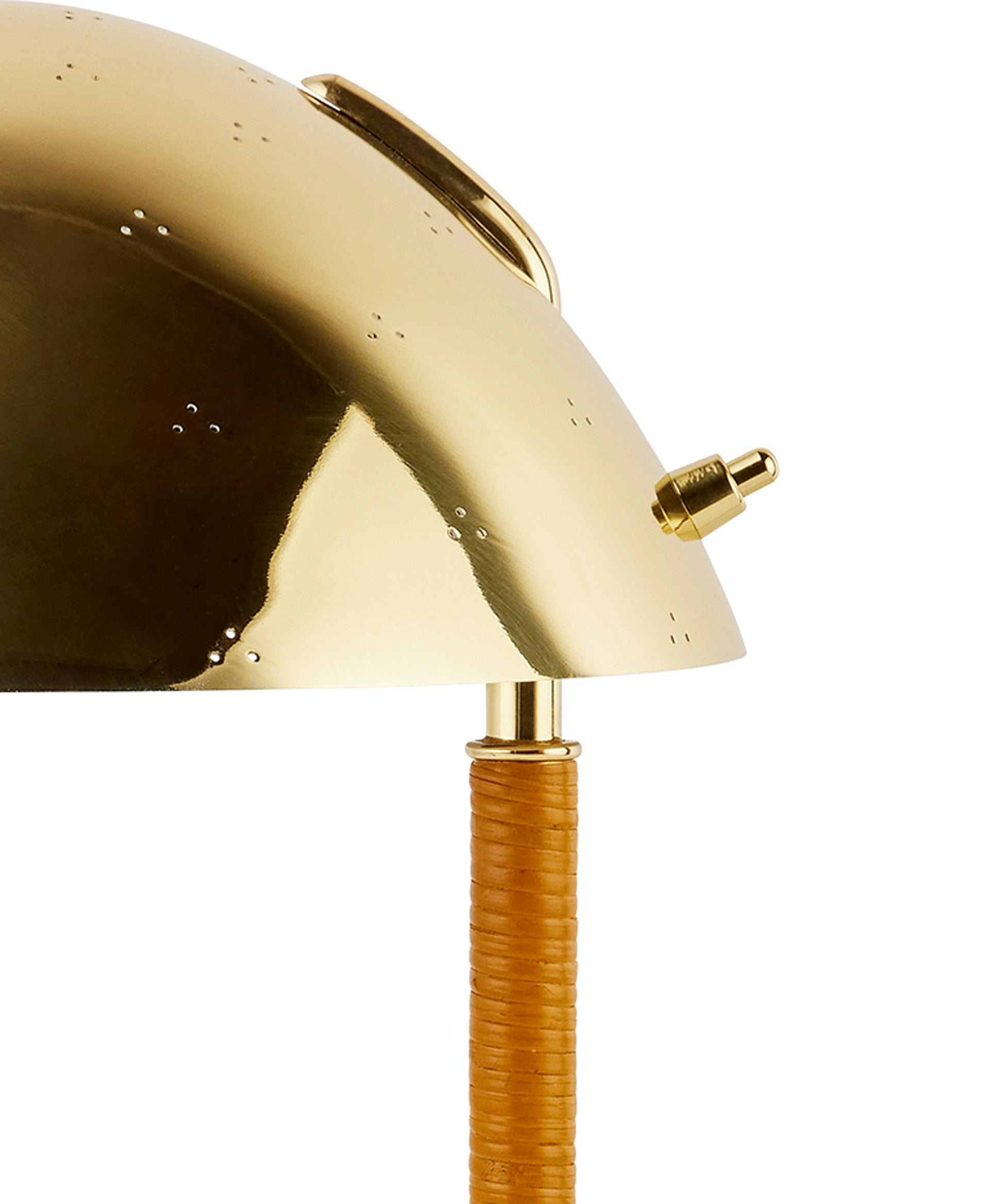 The 9209 has a distinctively shaped shade in spun brass that has led to it being referred to as the ‘Kypärä’ – the Finnish word for ‘helmet’. Held in place by a curved brass arm, the individually molded shade is decorated with triangular patterns of perforation – a Tynell decorative signature – which requires a specialist punch tool and the utmost precision to achieve by hand. As well as guiding the light downward, thanks to the holes punched in the surface, the shade also allows pinpricks of light through, creating a soft, textured glow and a starlight-like sparkle.