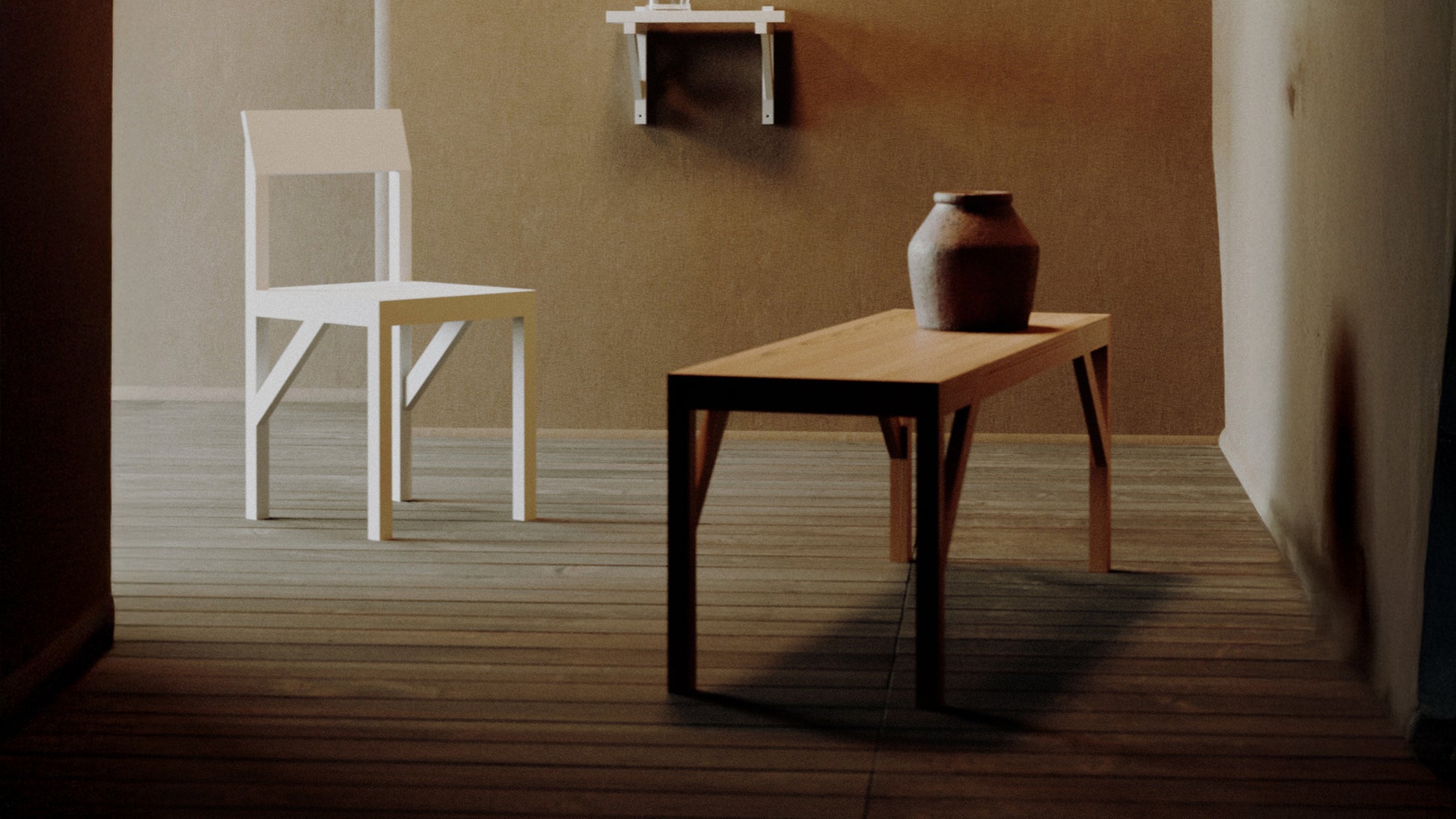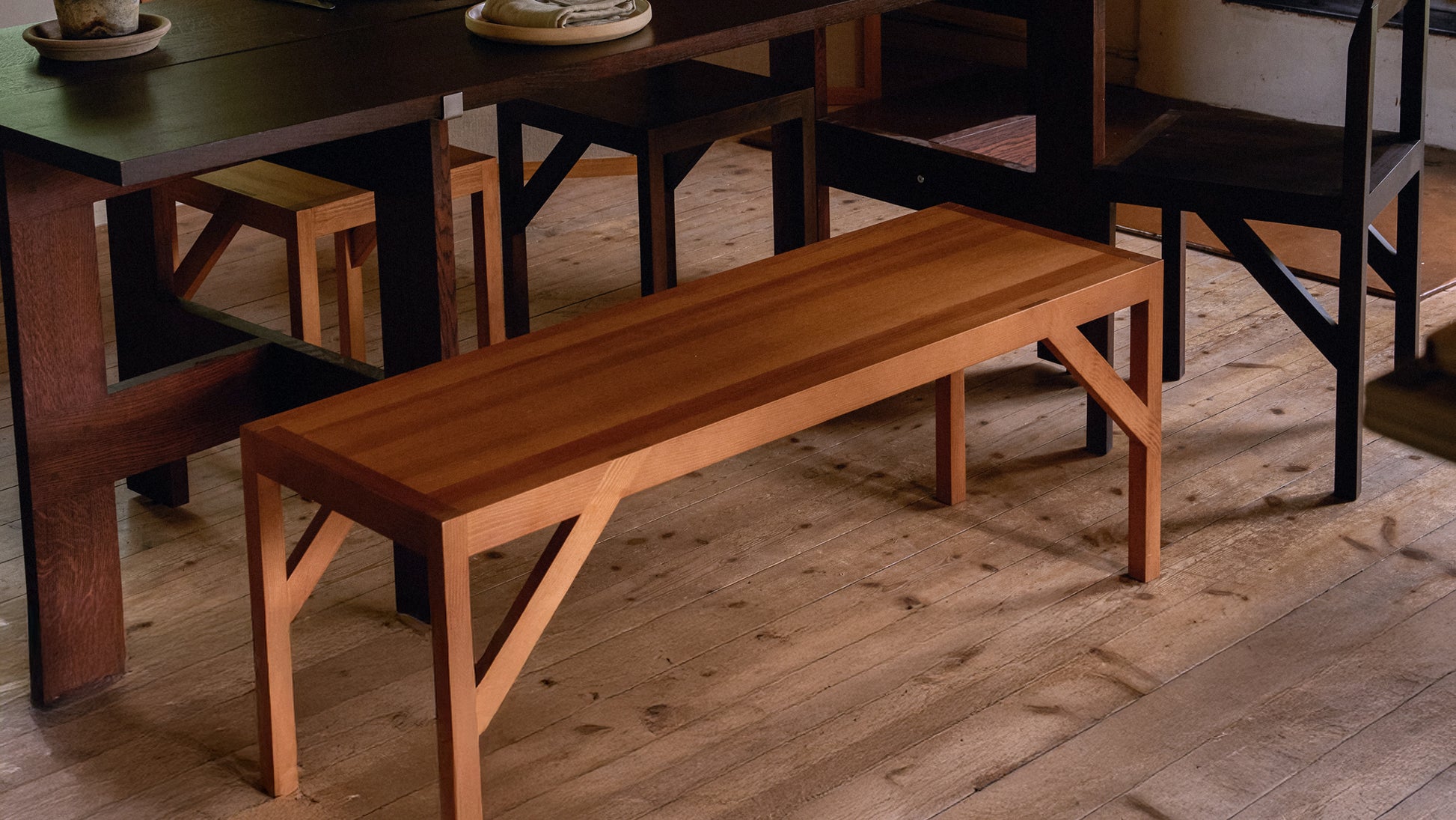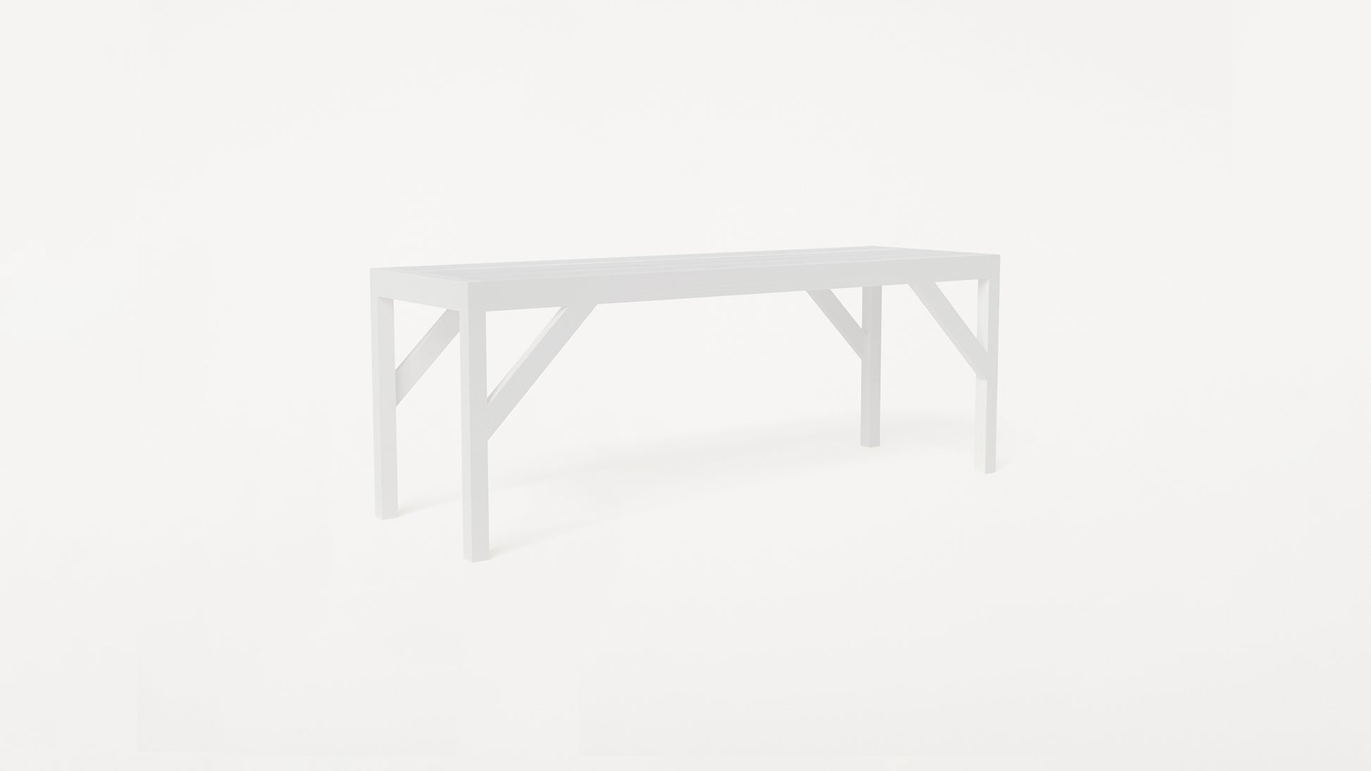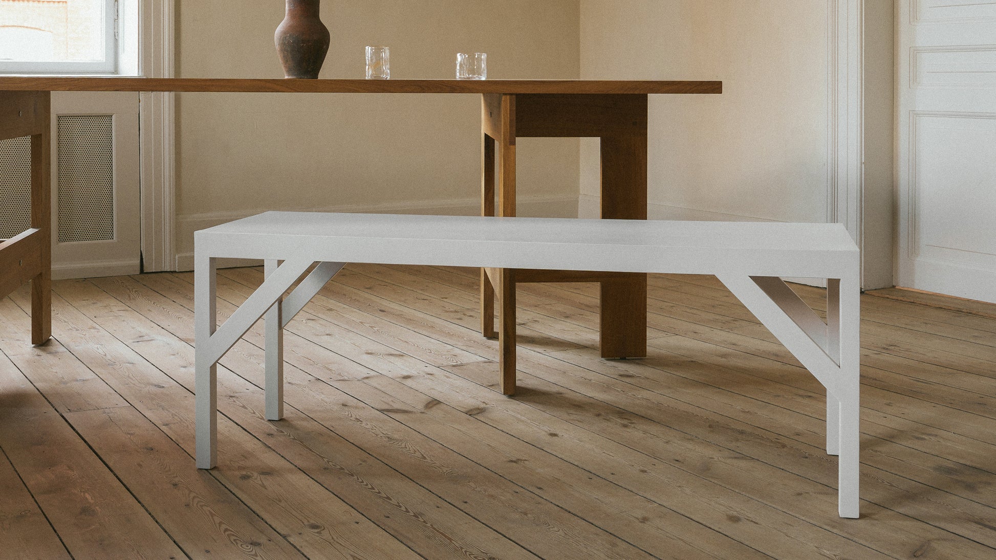 The Bracket Bench, designed in collaboration with Copenhagen-based design studio Frederik Gustav, is a four-legged, two-person long seat fabricated in solid oiled pine highlighted by a structural component, the bracket.