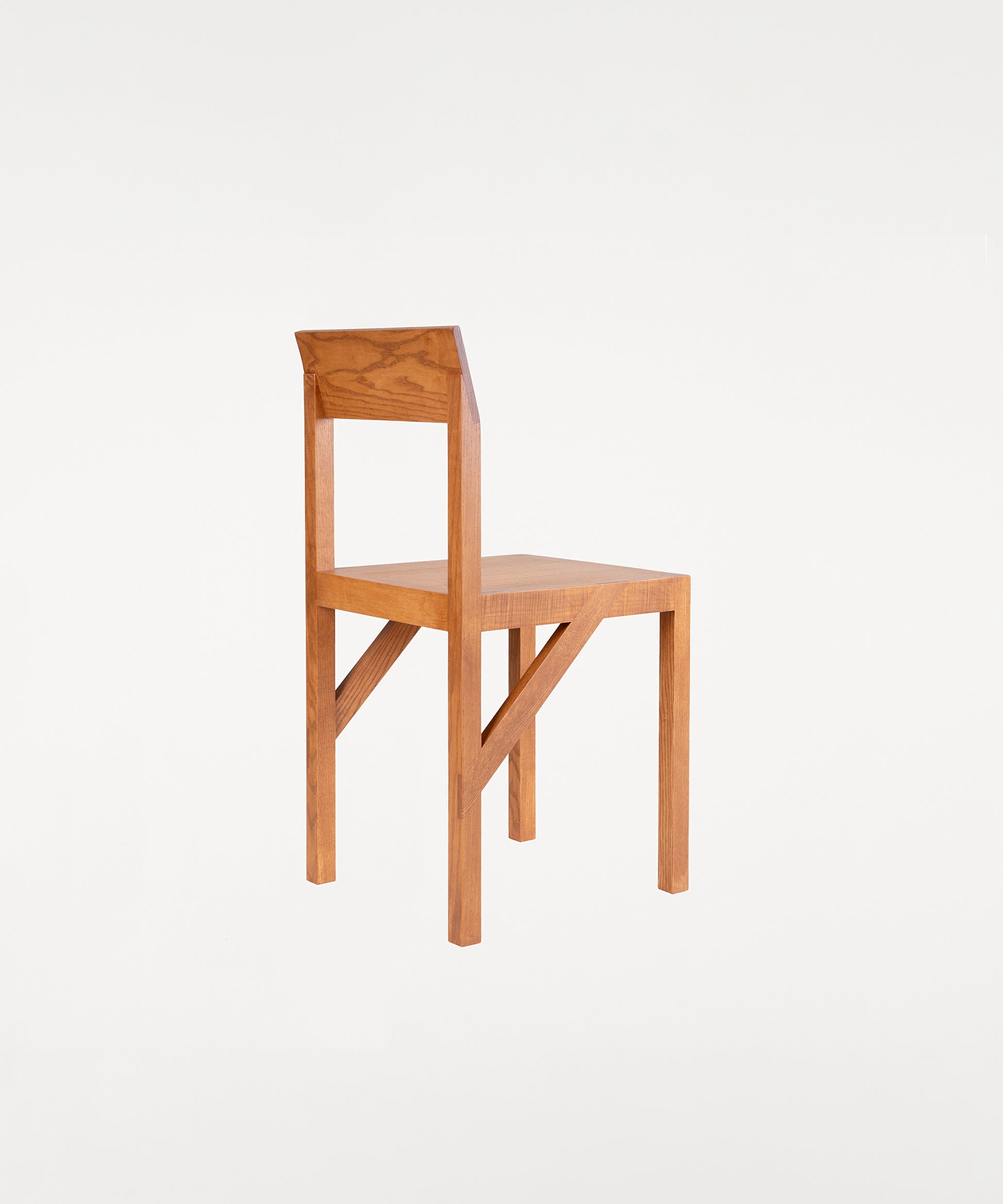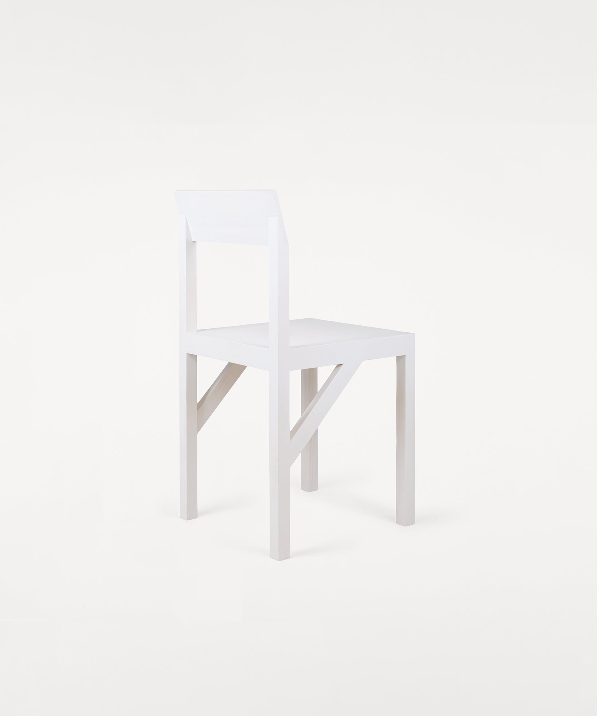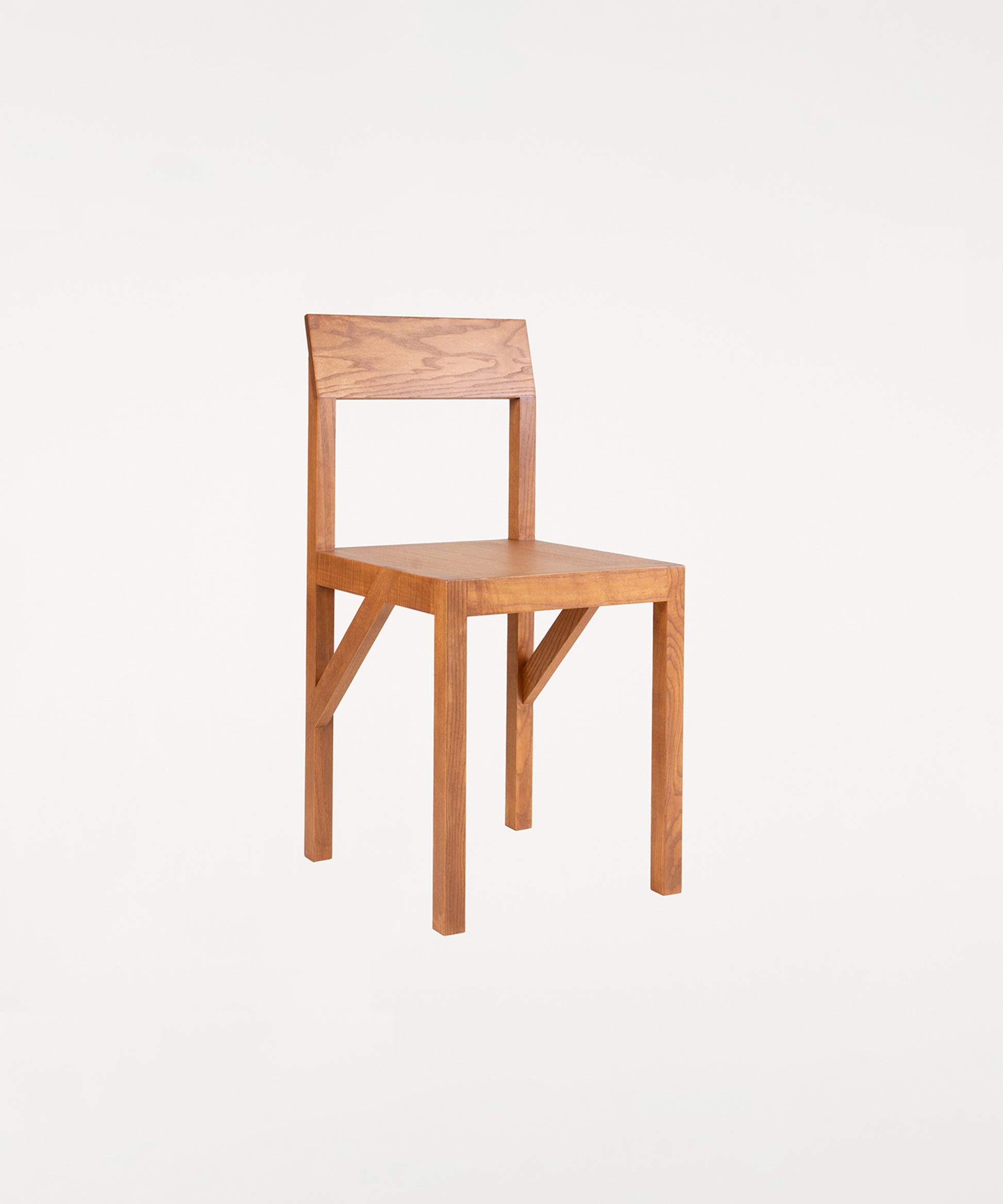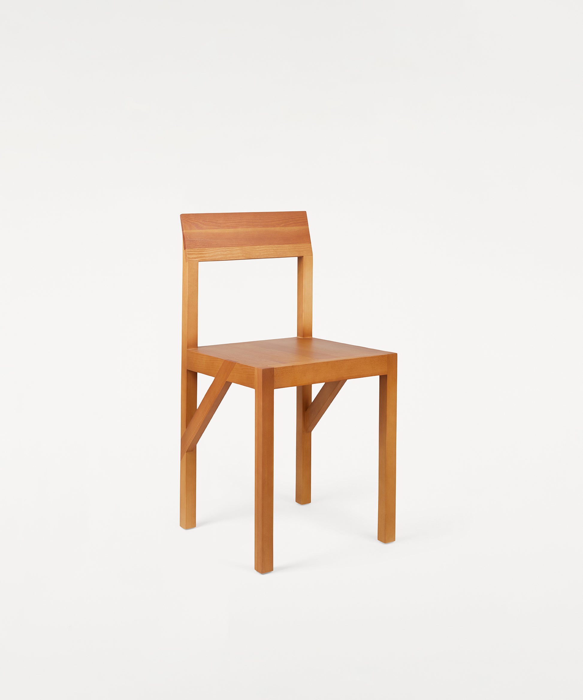 The Bracket Chair, designed in collaboration with Copenhagen-based design studio Frederik Gustav, is a four-legged piece fabricated in solid oiled pine with a flat seat and a slightly angled backrest highlighted by a structural component, the bracket.