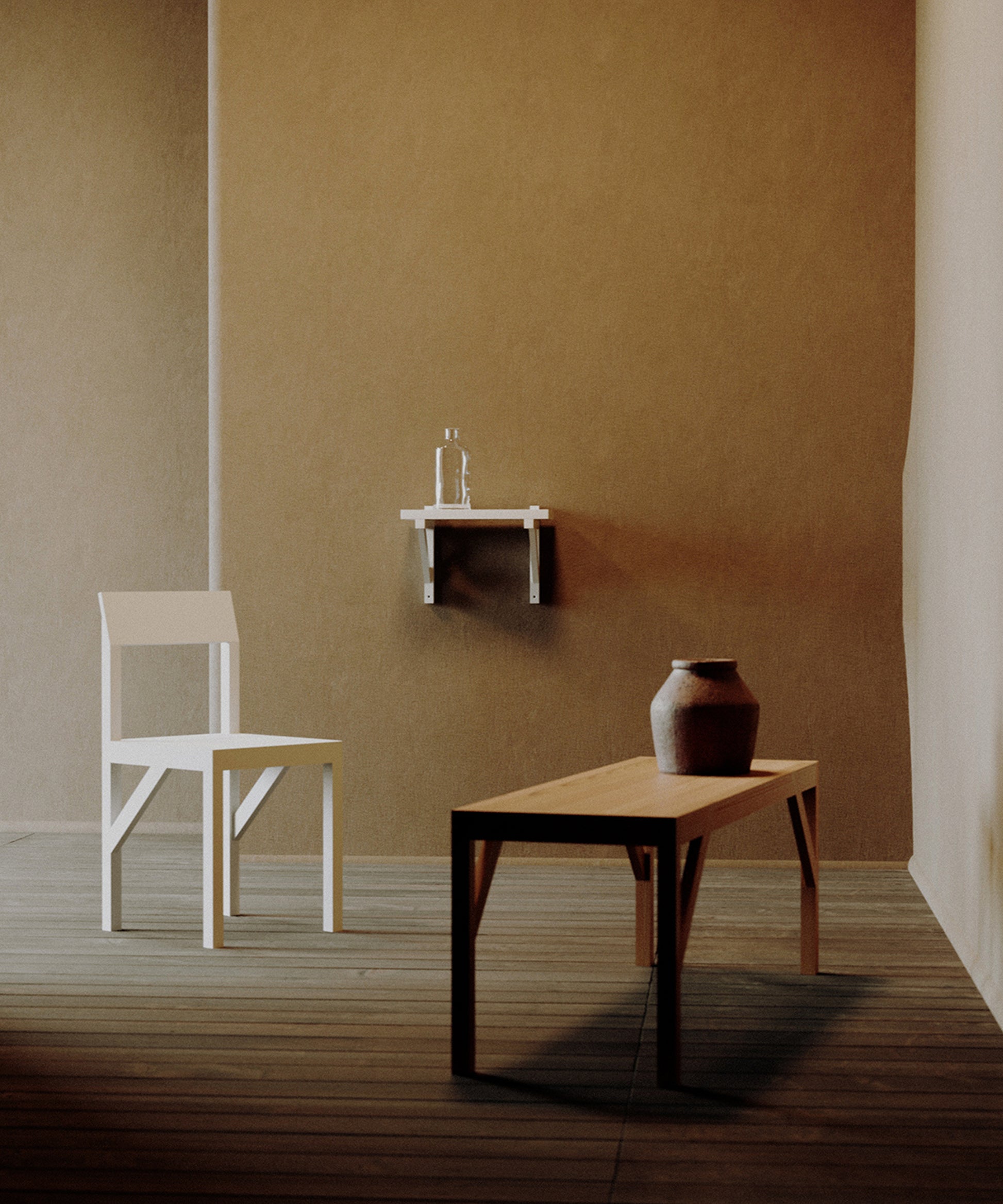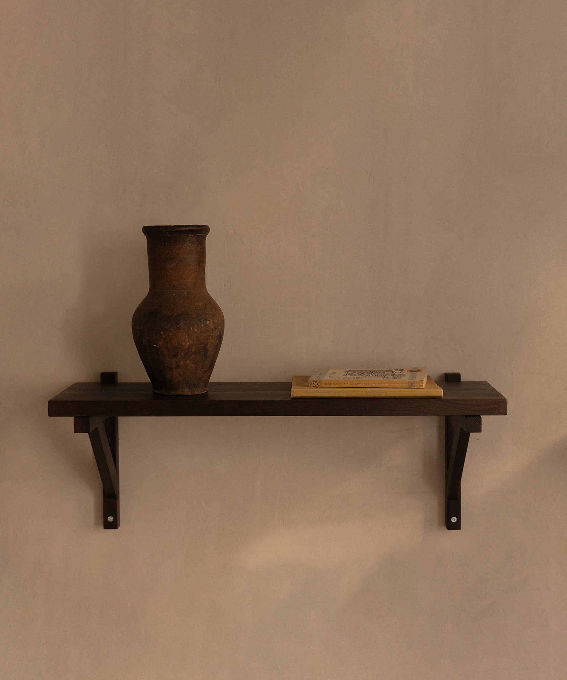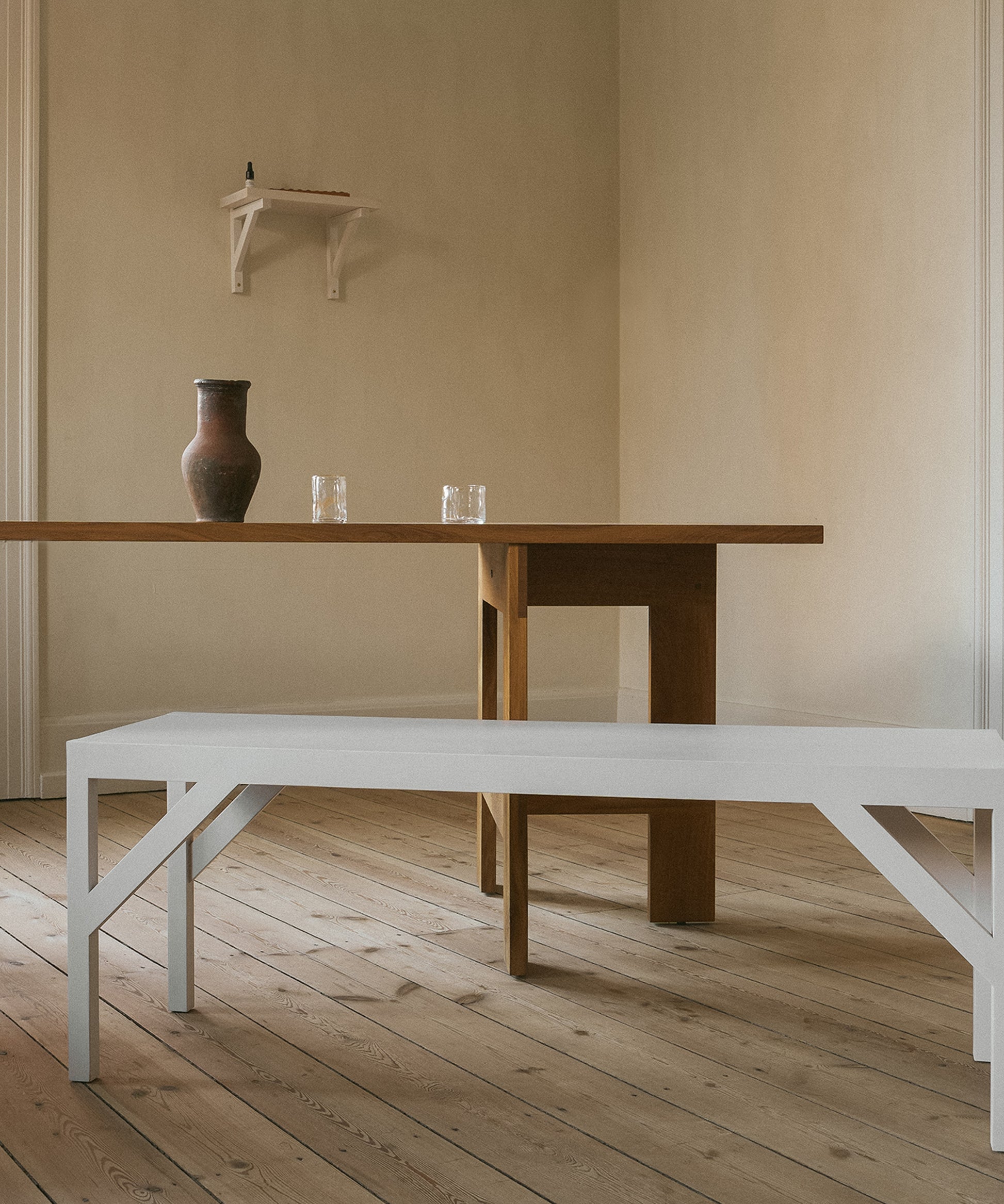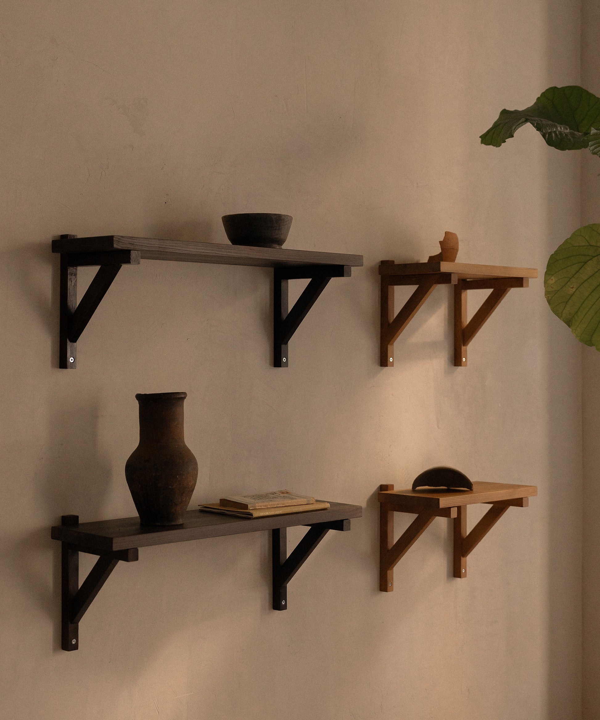 This purely functional element turned into an aesthetic feature is mounted to the wall and supports the shelf providing stability—an architectural influence, a nod to timeless construction.