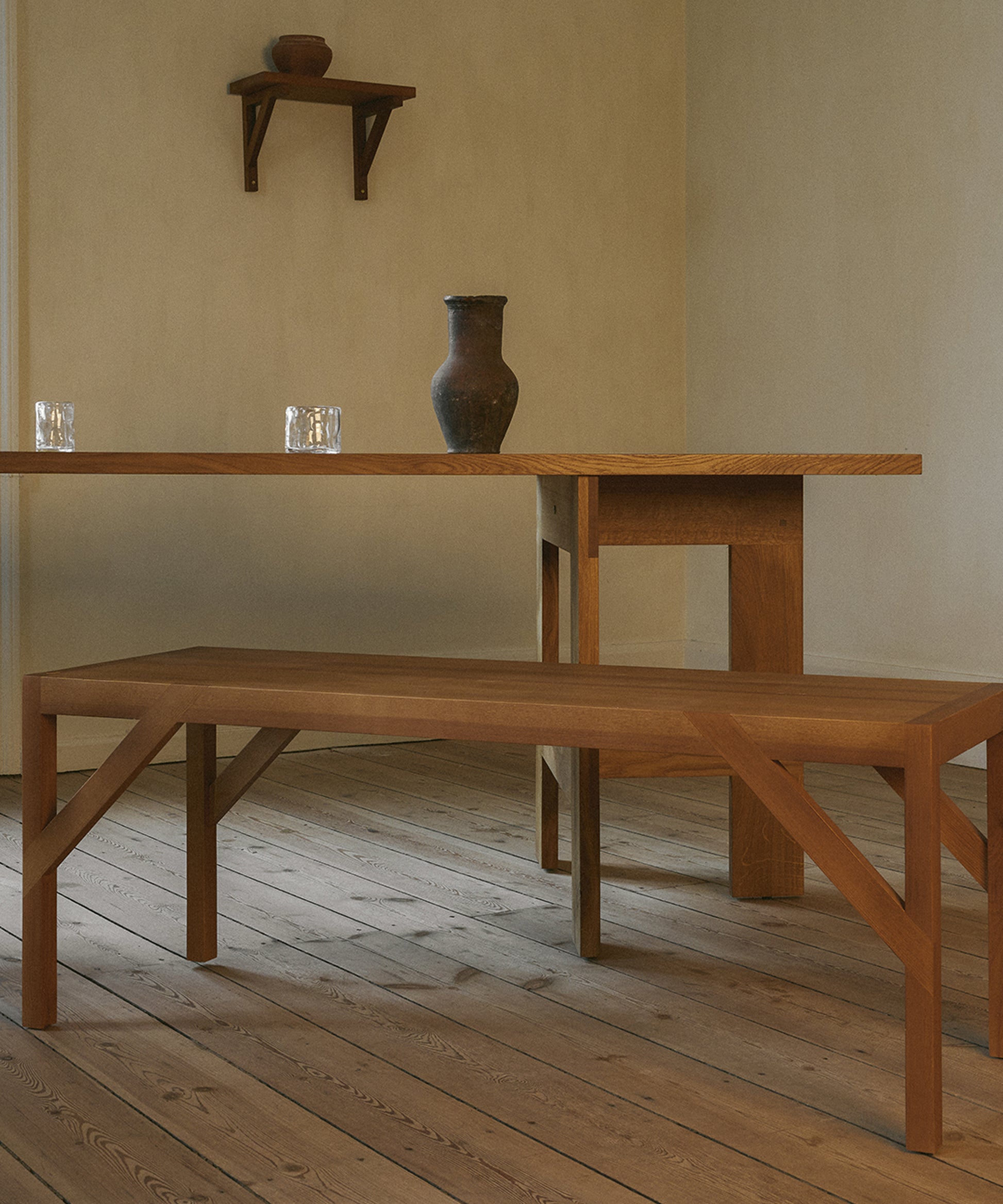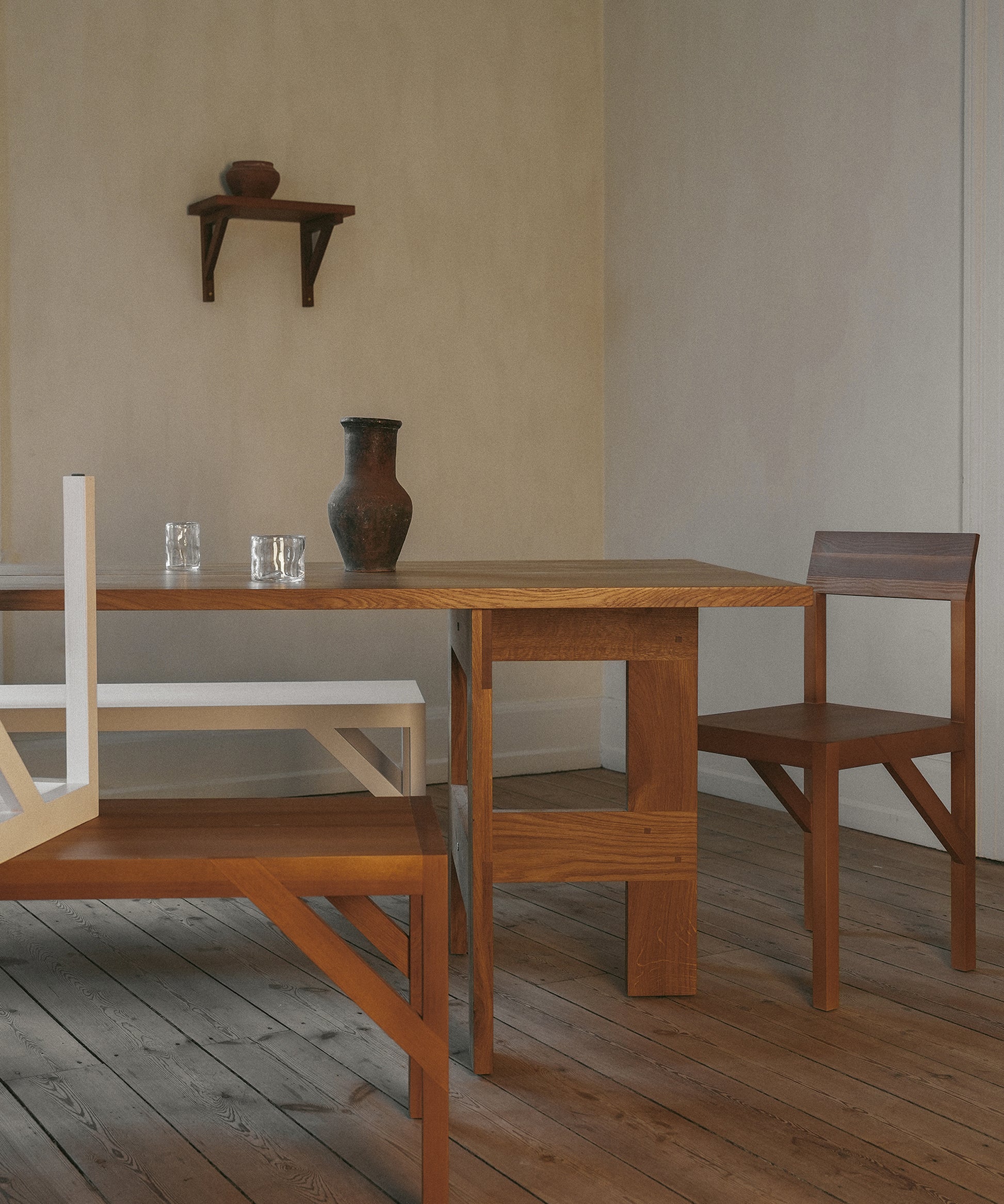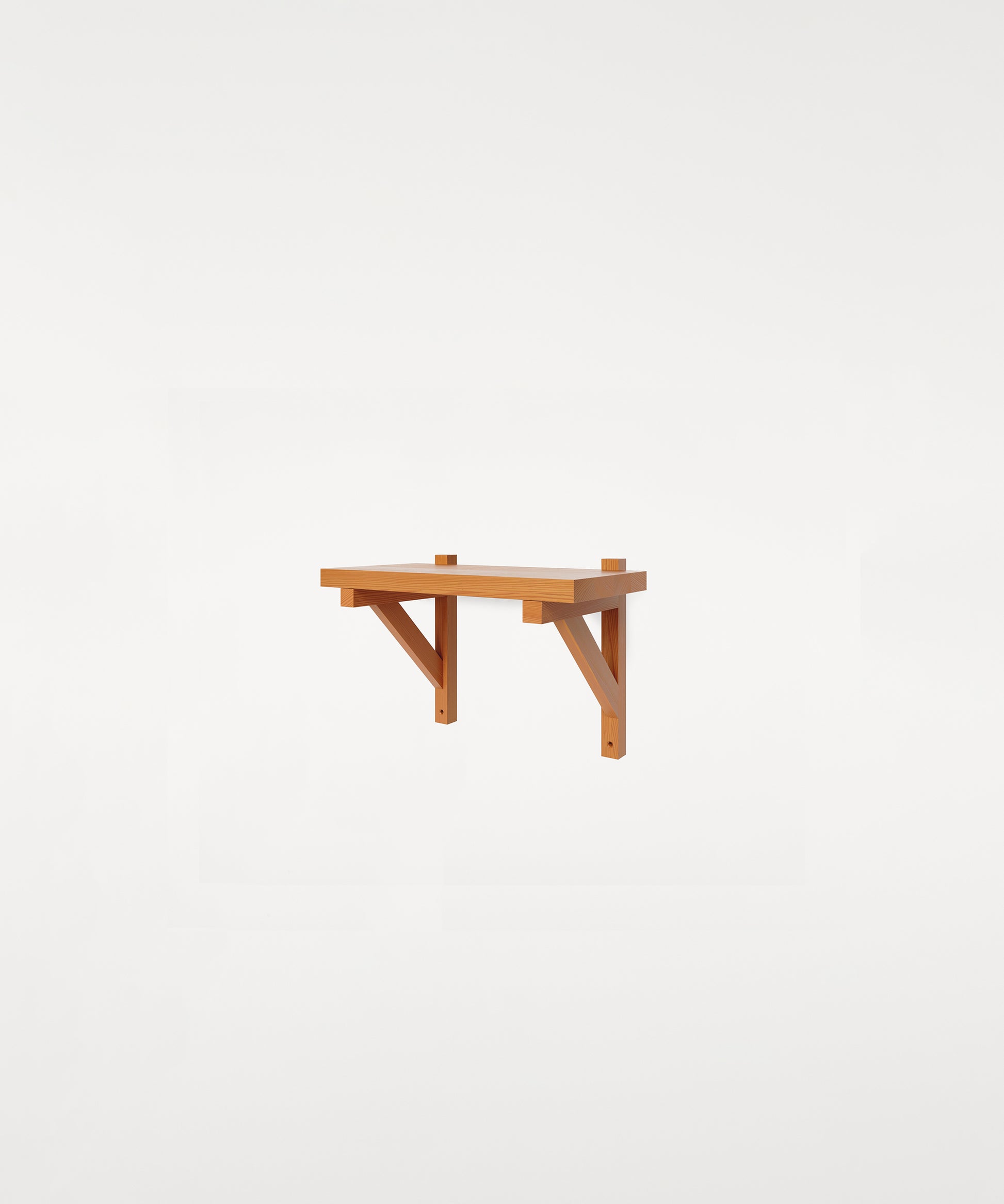 The Bracket Shelf, designed in collaboration with Copenhagen-based design studio Frederik Gustav, is a floating piece for the storage or display of objects fabricated in solid oiled pine highlighted by a structural component, the bracket.