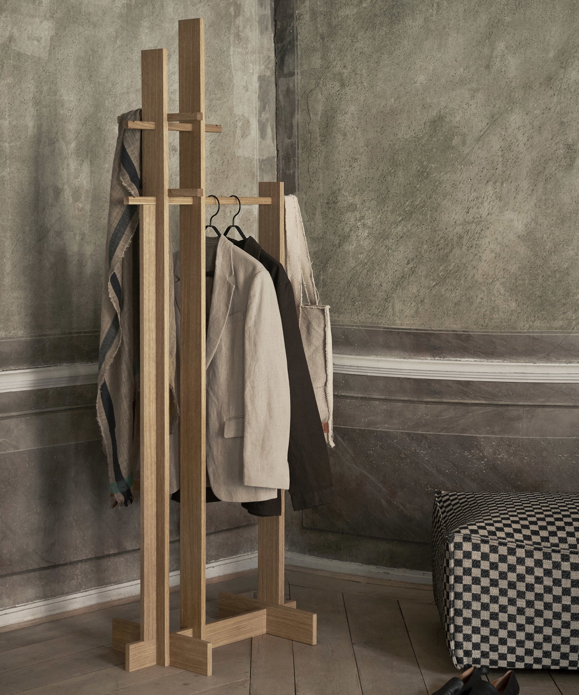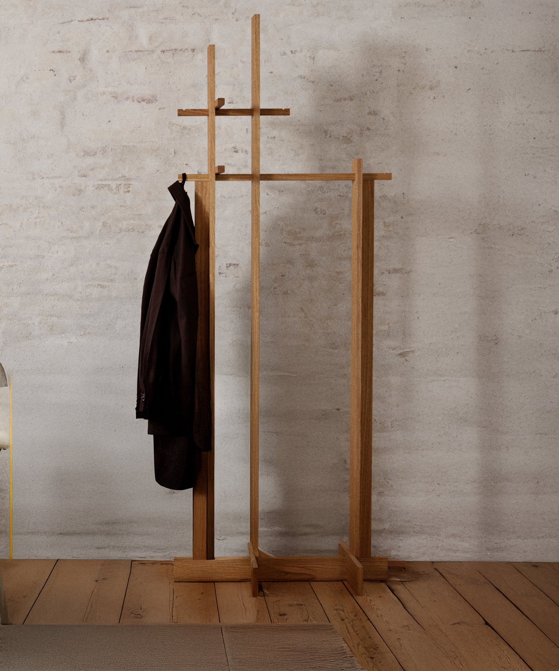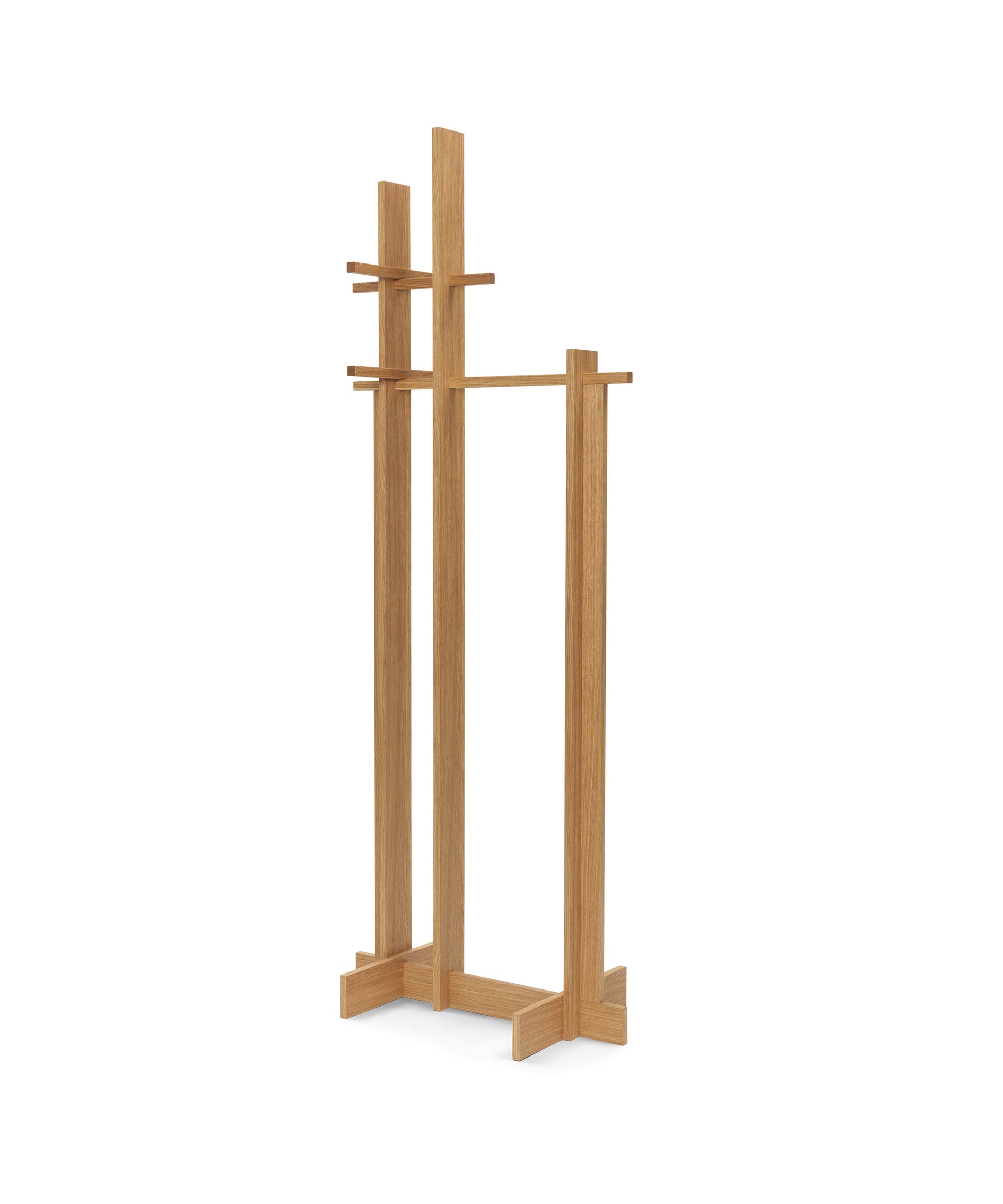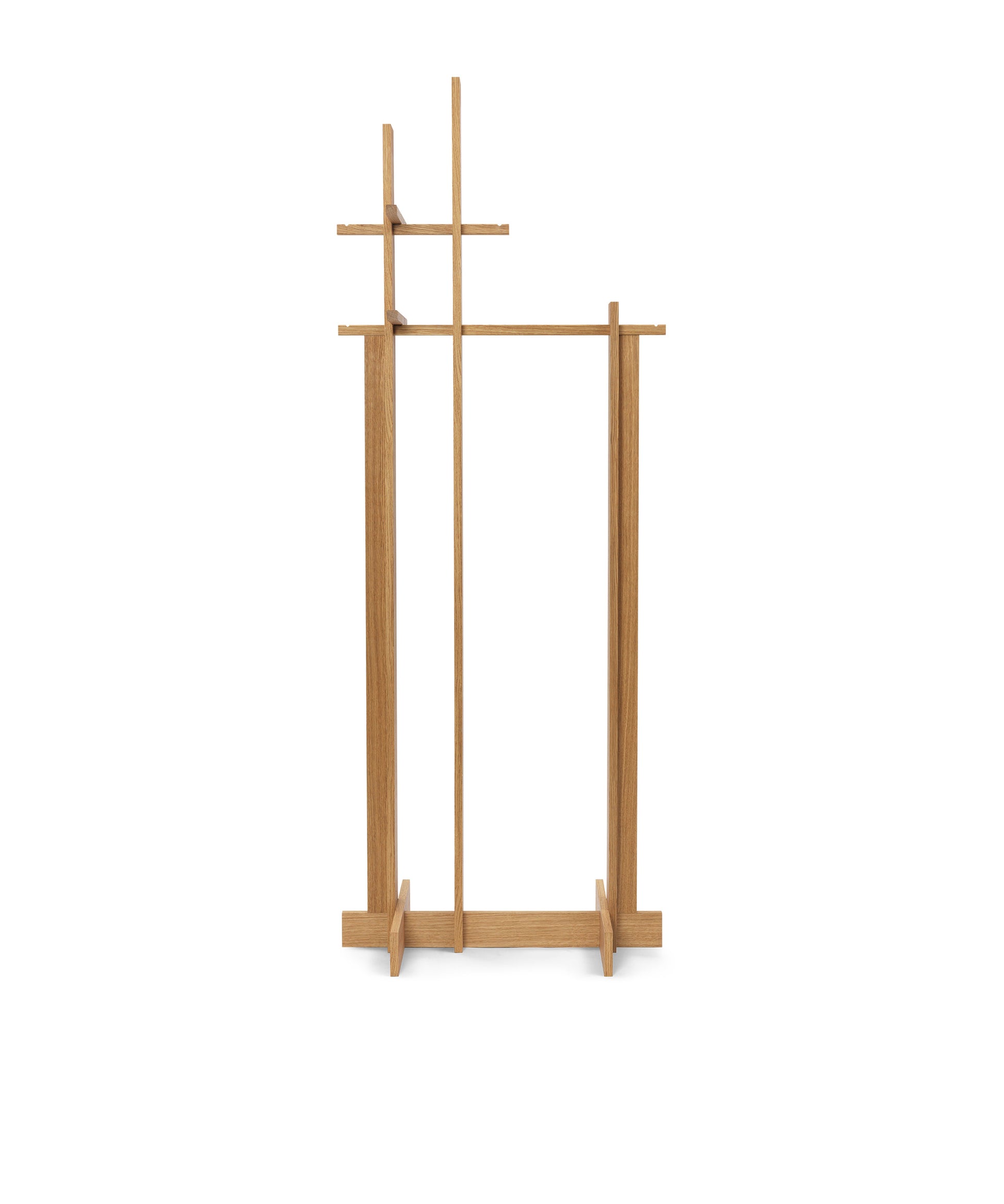 Inspired by wooden architectural constructions, the clothes rack has a simple silhouette with clean lines, while intricate details and expert joinery make it a statement piece that seamlessly combines functionality and elegance. Crafted from FSC™ certified oak veneer with MDF core.
