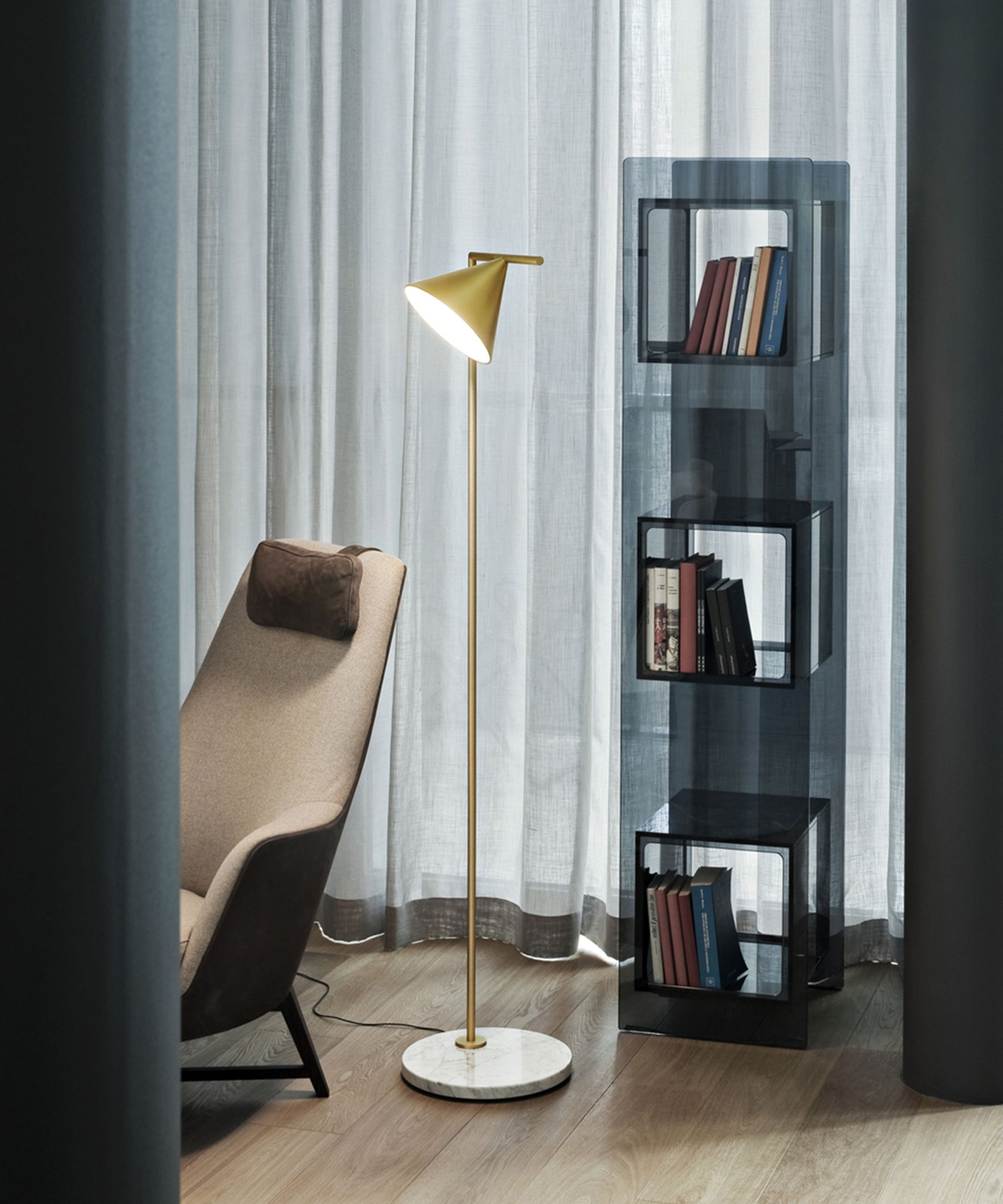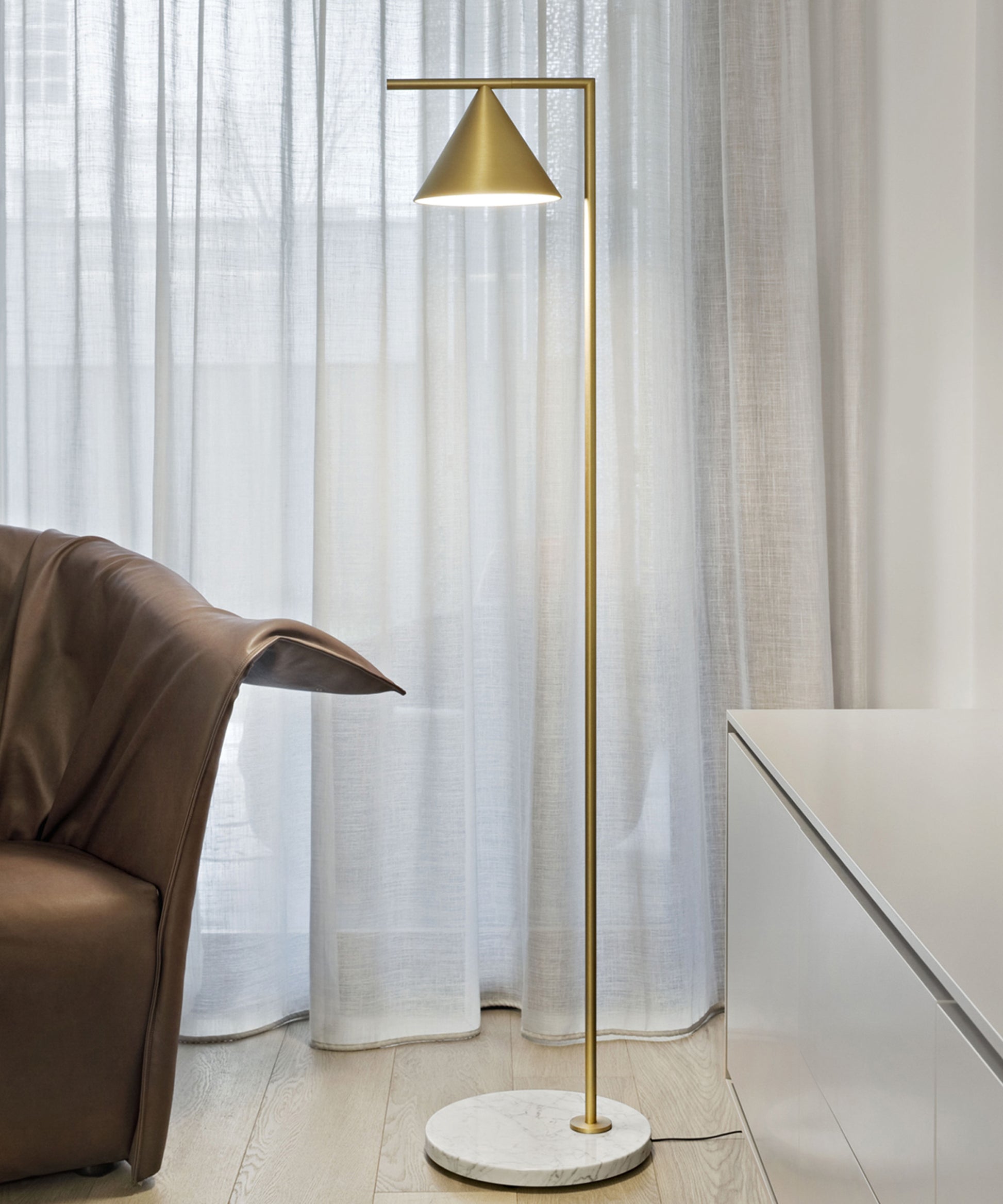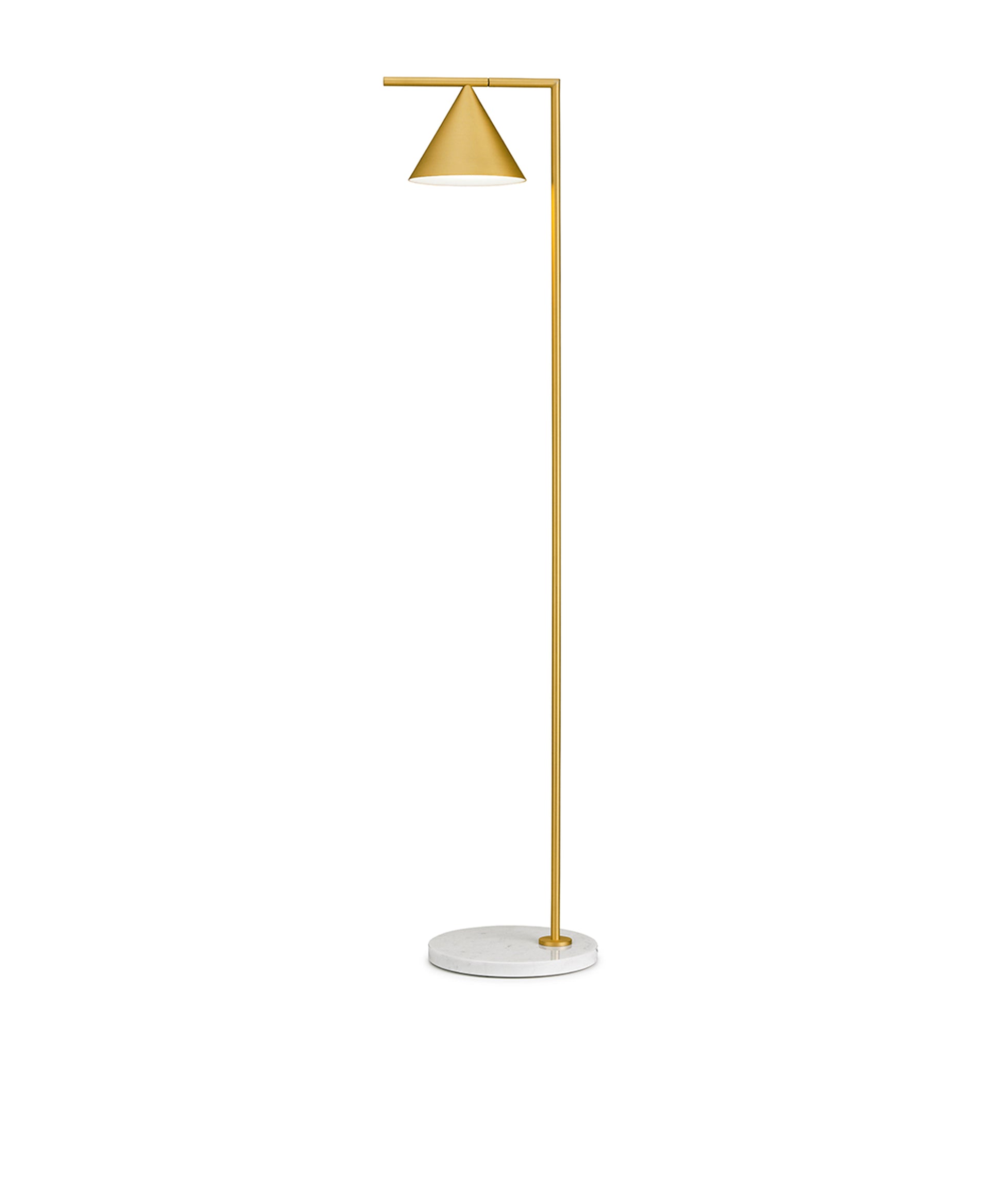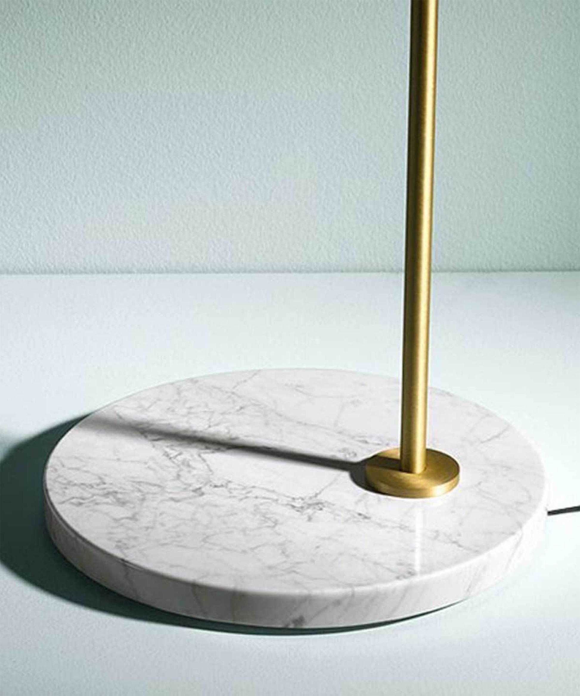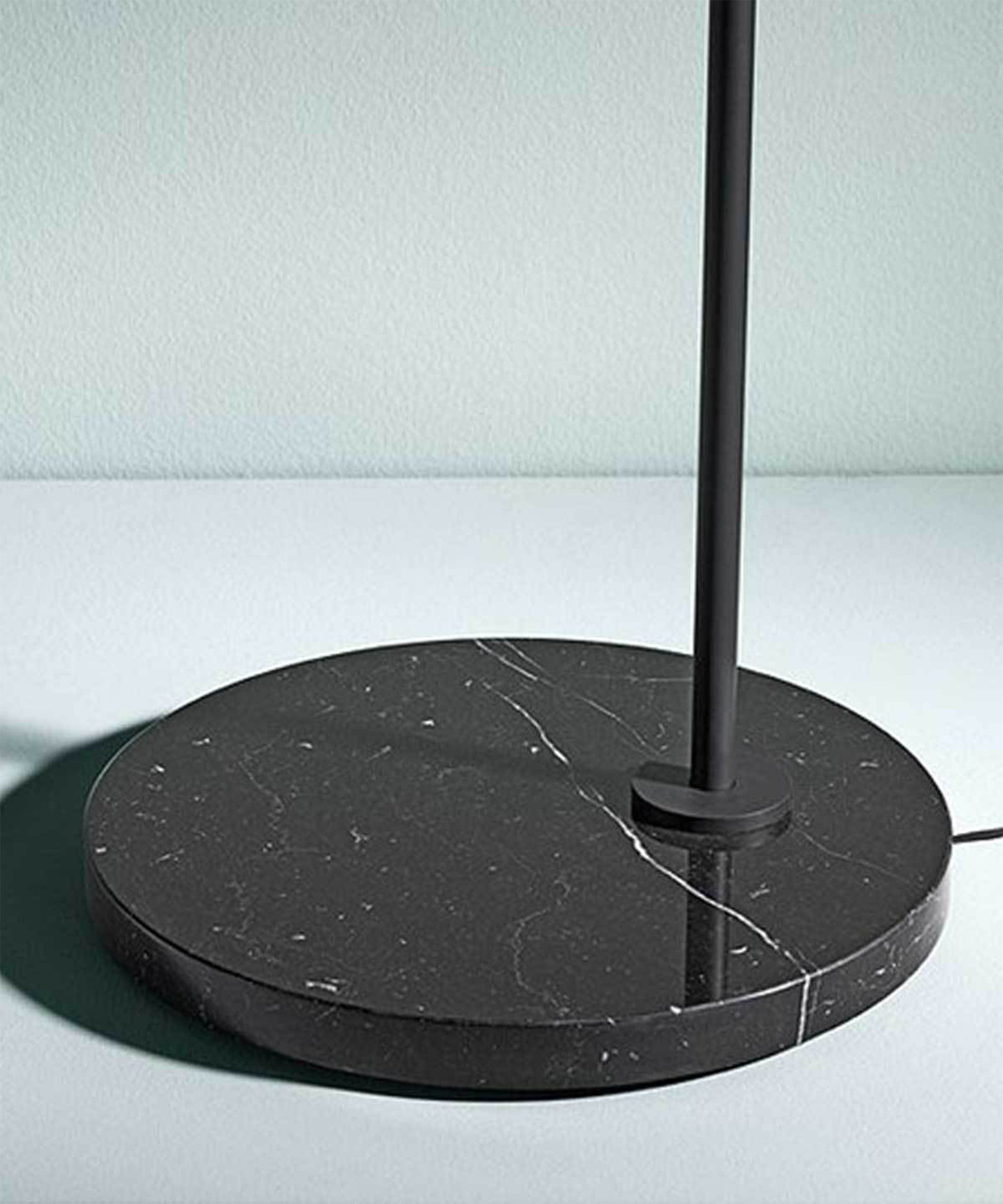 Sleek and graceful, this versatile floor lamp features smart details from head to toe. At the top, its spinning cone diffuser provides direct light that can be repositioned. On the bottom, it is weighted by a stunning white Carrara or black Marquina marble base. Its stem and cone are available in painted steel or brushed brass. The diffuser is injection-molded opal photoengraved PC (polycarbonate). The power cord features a foot dimmer switch with ON-OFF functions and 10-100% light adjustment.